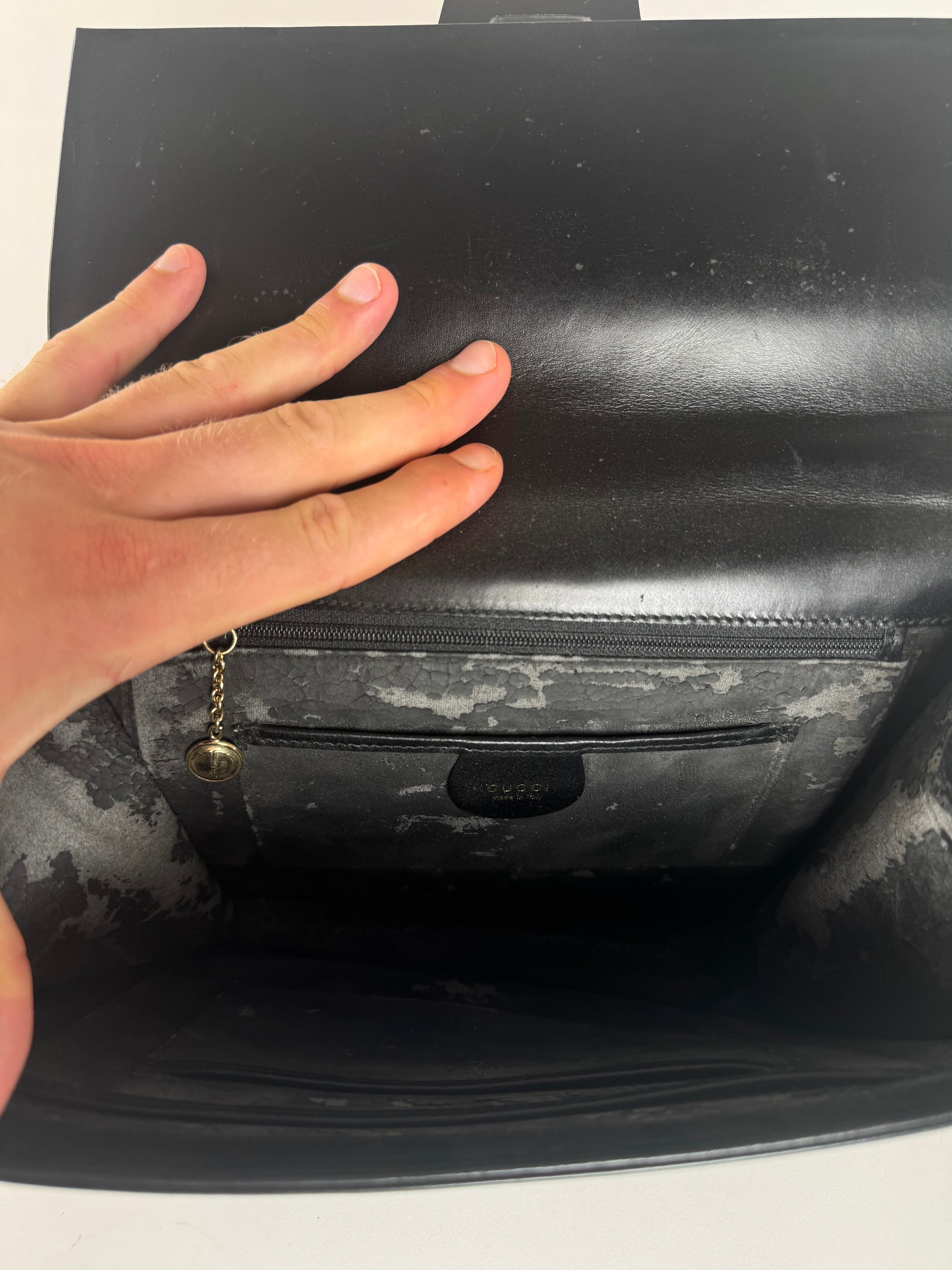 Sac bandoulière GUCCI en cuir noir. Ce sac vintage est confectionné en cuir noir et arbore des finitions en acier doré avec des détails en plastique noir. Il est livré avec une bandoulière préalablement réparée à la colle. Le sac se ferme par un bouton-pression aimanté et sa doublure présente des traces d'usure et d'adhérence. Fabriqué en Italie, il porte le numéro de série 001-1364-1916. Une housse de protection Gucci est incluse.