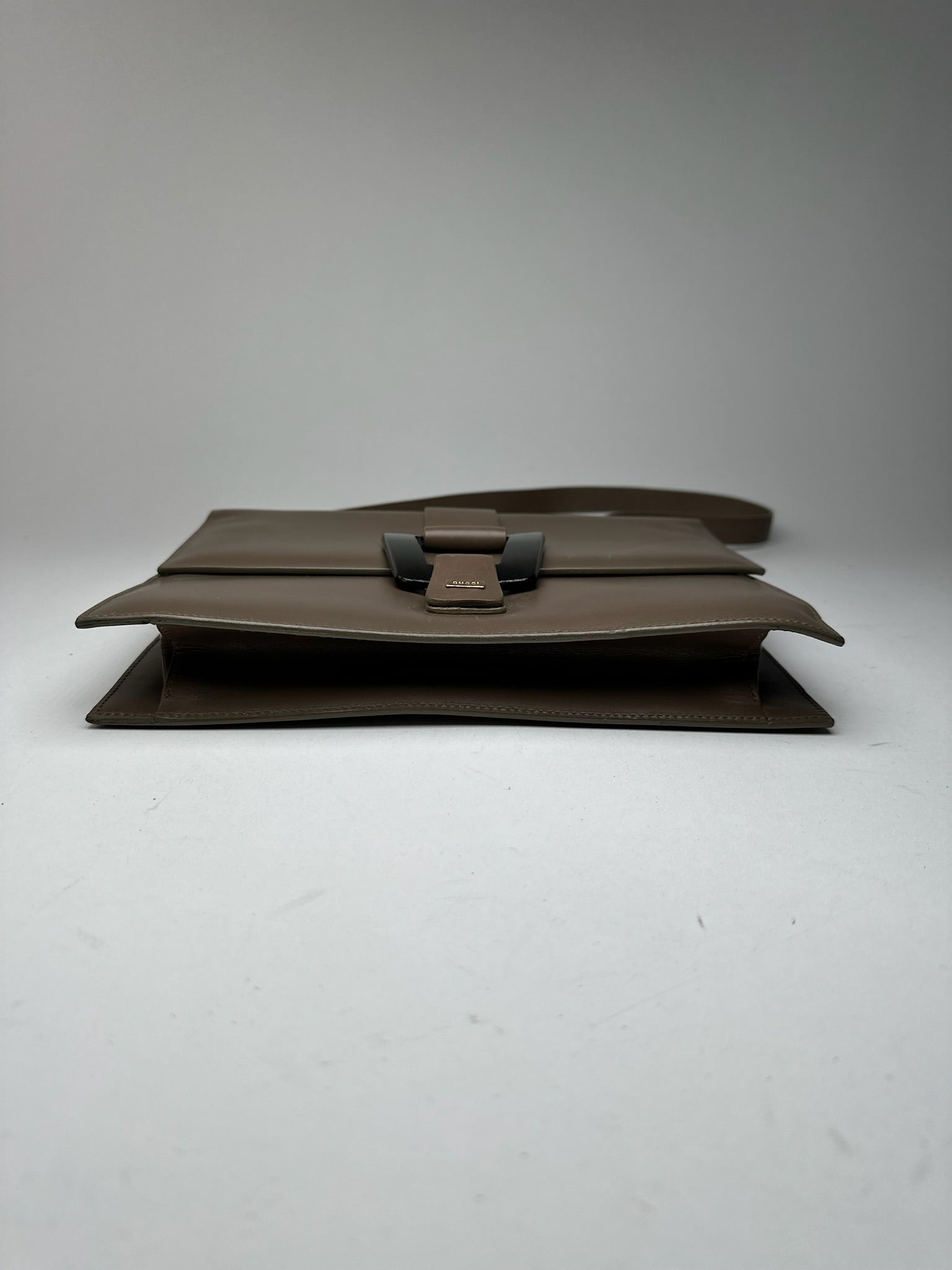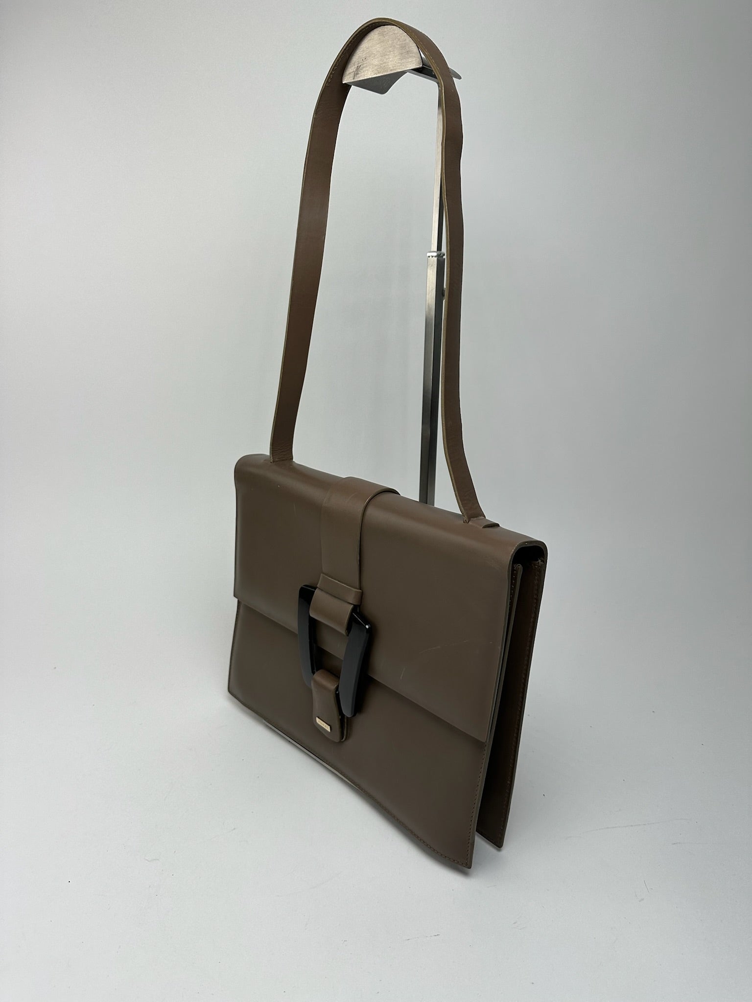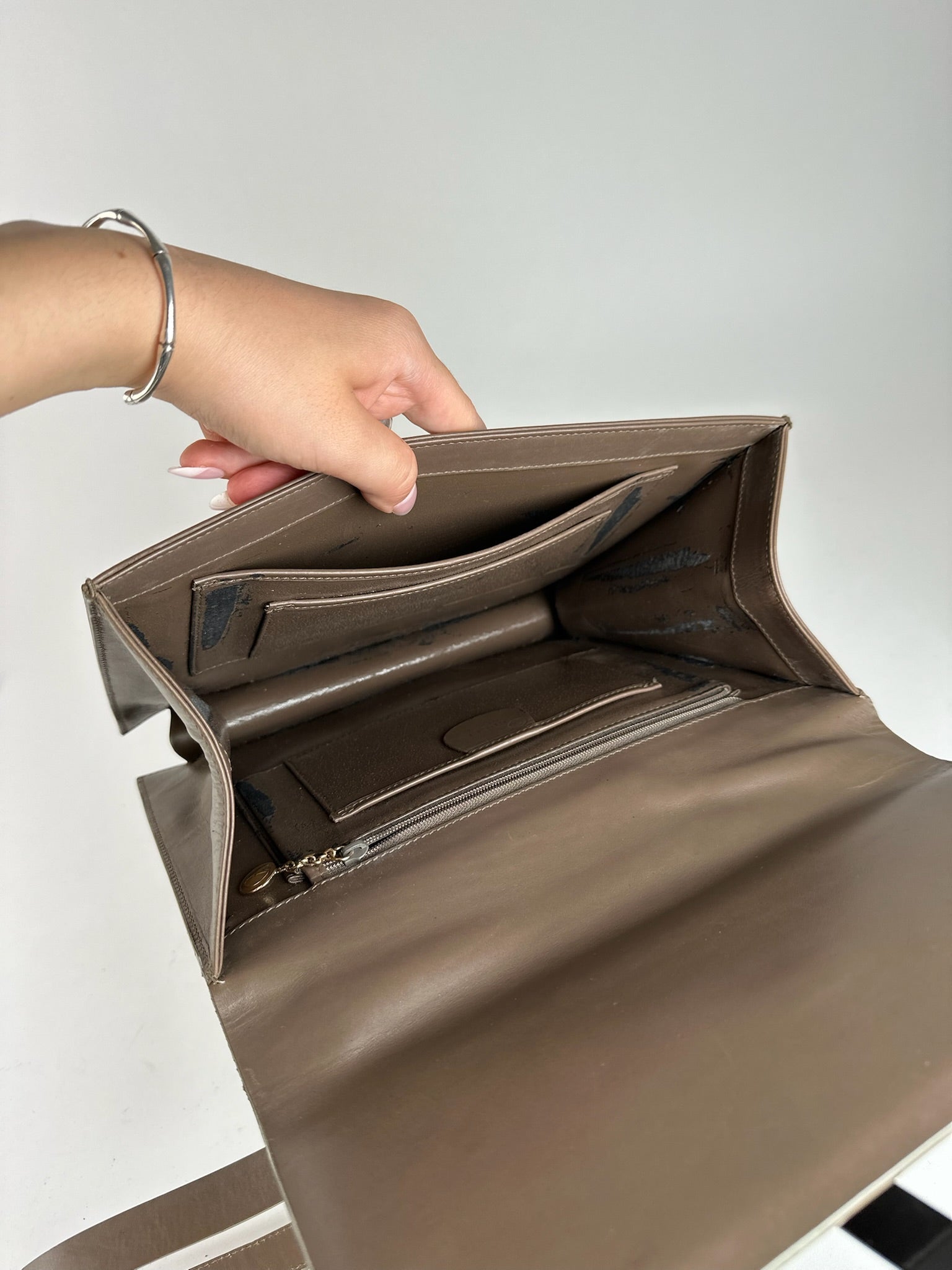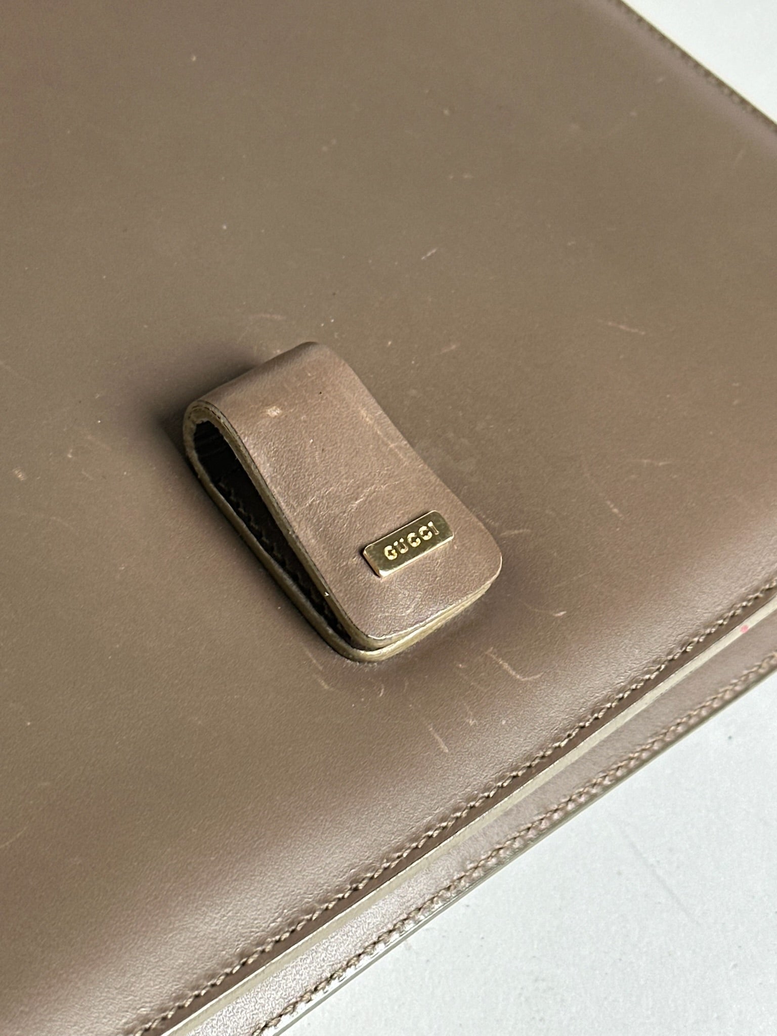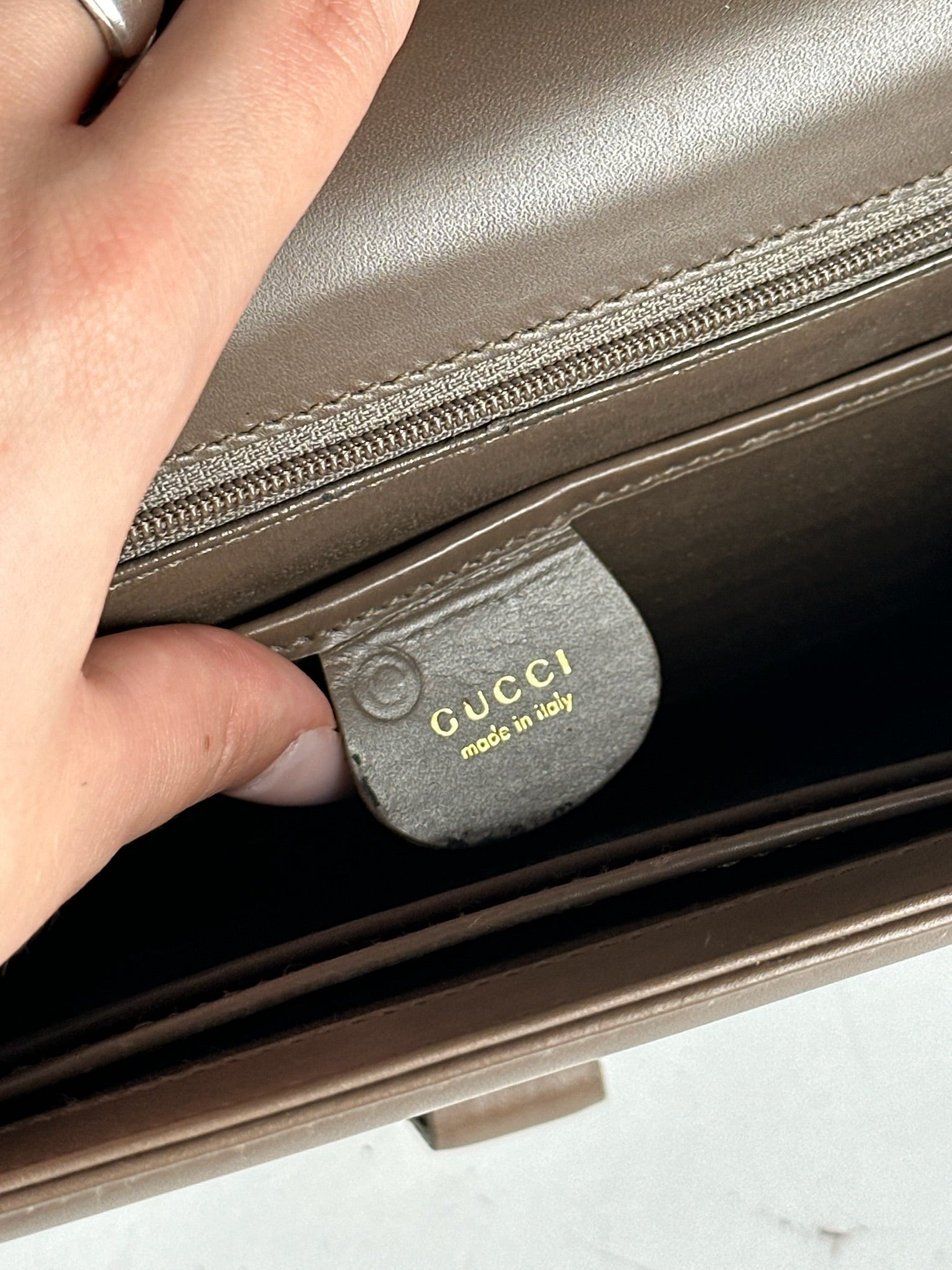 Sac à main GUCCI vintage en cuir kaki marron. Ce sac à main vintage classique est confectionné en cuir kaki marron et doté d'une anse mi-longue permettant de le porter à la main ou à l'épaule. Il se ferme par un rabat aimanté et est orné de détails en acier doré. L'intérieur est doublé de cuir assorti. Fabriqué en Italie, ce modèle intemporel porte le numéro de série 001-2014-1916.