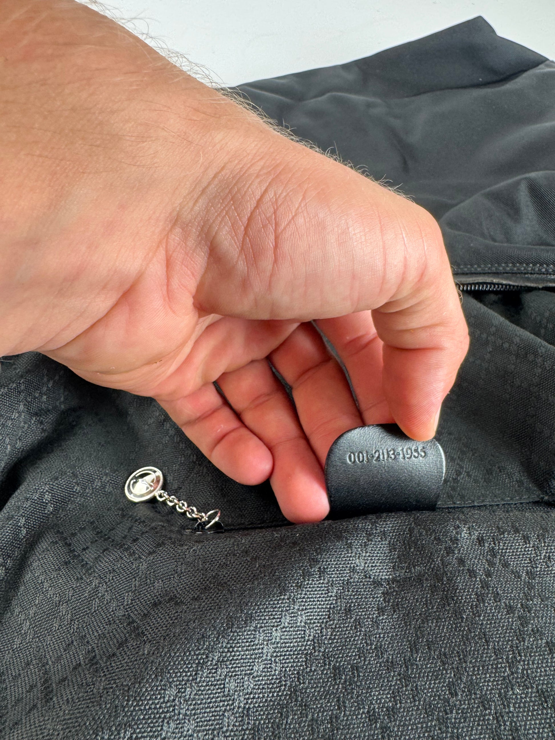 État : L'extérieur en toile et le cuir verni sont en très bon état, avec quelques traces d'usure et de légères taches. La poignée est propre et présente de légères traces d'utilisation. La quincaillerie argentée est brillante et présente des rayures superficielles. La doublure intérieure est globalement propre et en excellent état.