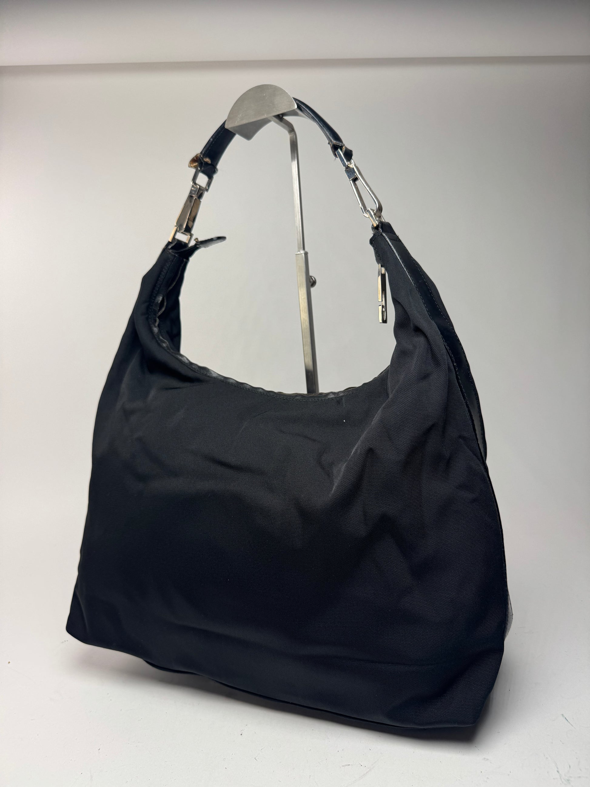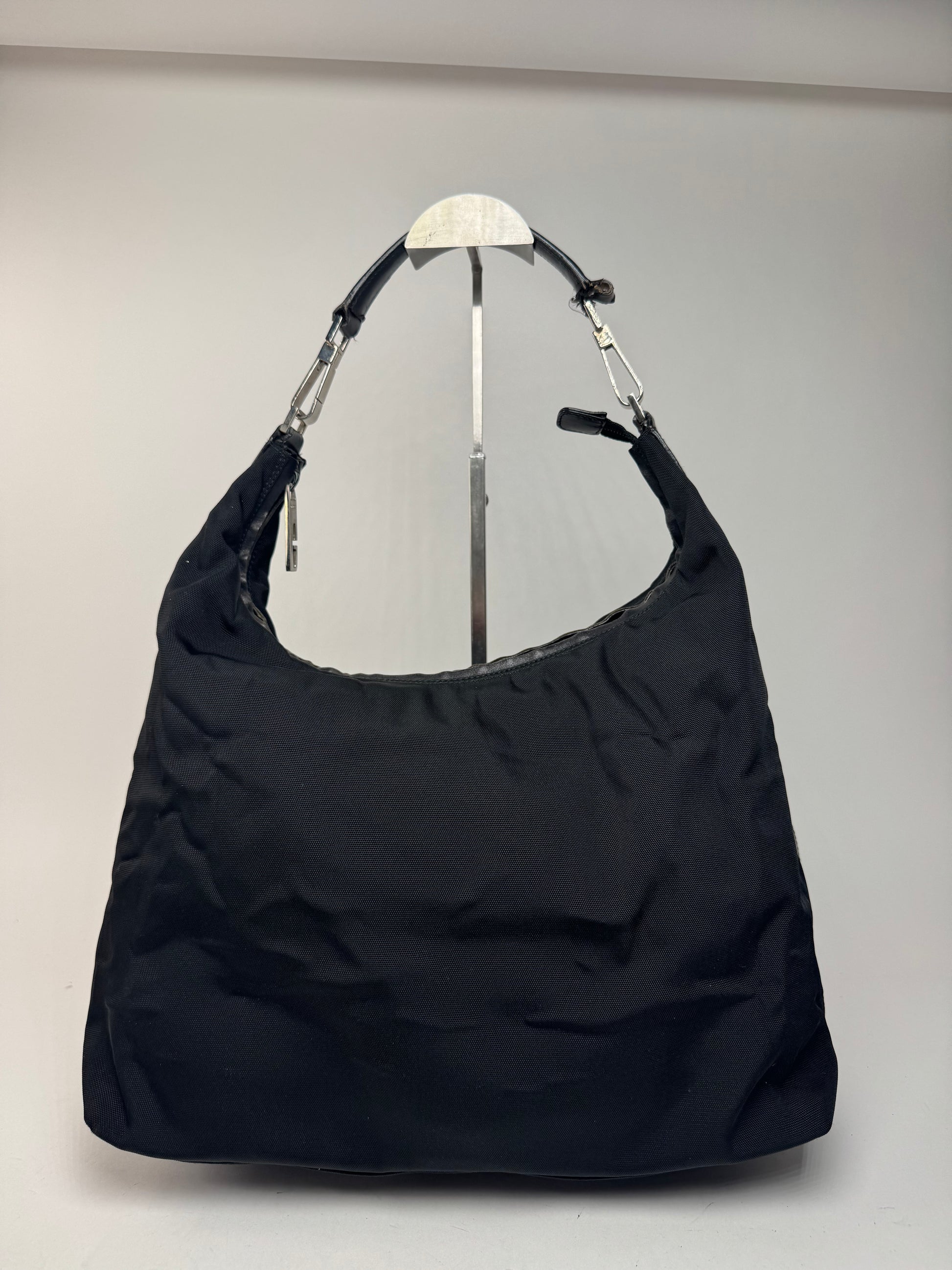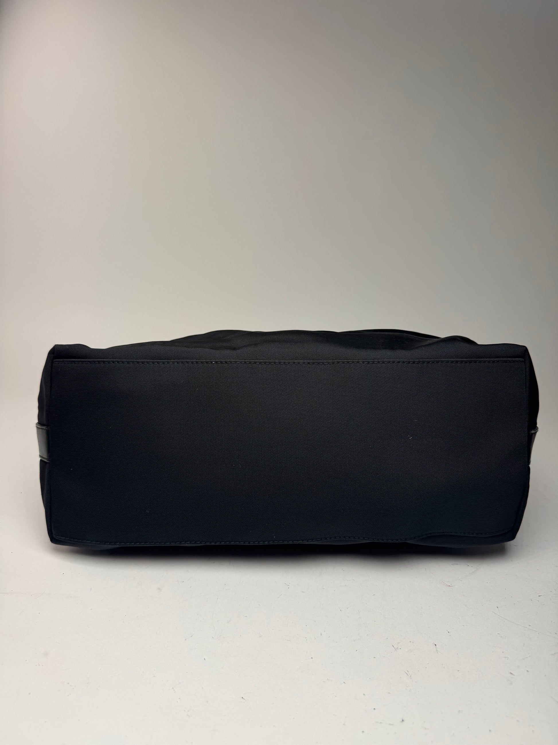 Ce sac à main élégant est finement confectionné en toile noire avec des finitions en cuir verni noir. Il est doté d'une poignée supérieure en cuir noir, d'accessoires en acier argenté et d'une fermeture éclair sur le dessus. La fermeture éclair s'ouvre sur un spacieux intérieur en toile noire.