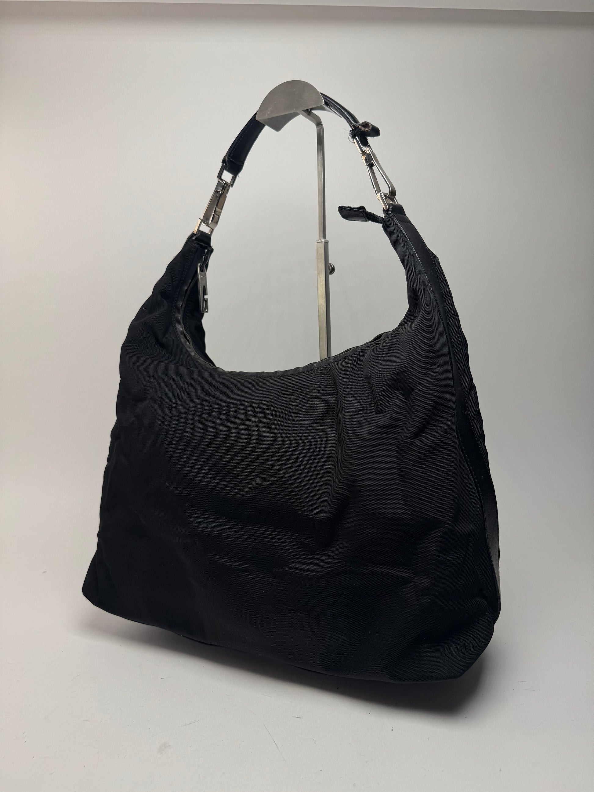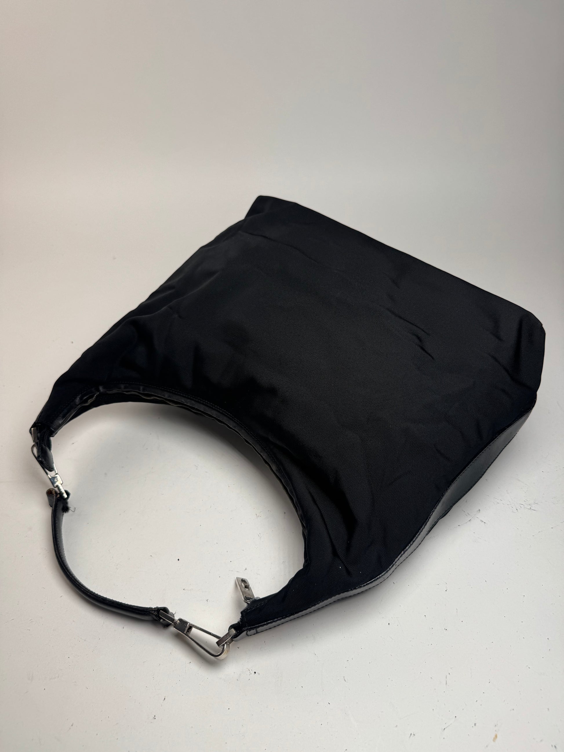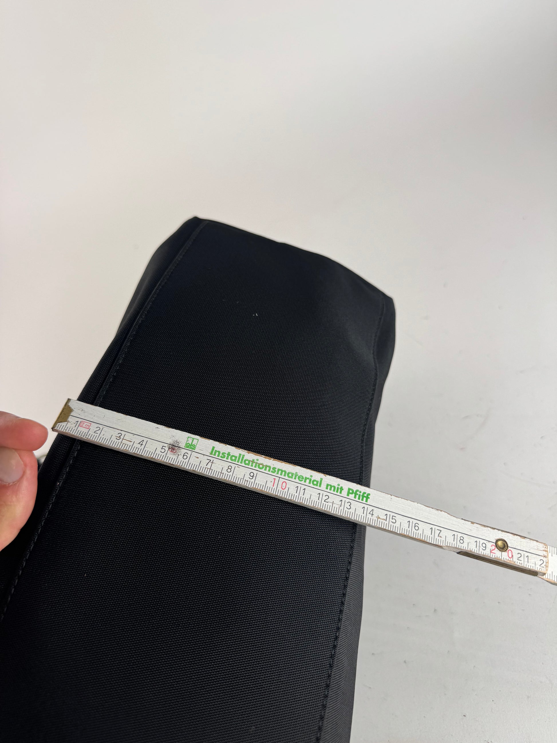 Ce sac à main élégant est finement confectionné en toile noire avec des finitions en cuir verni noir. Il est doté d'une poignée supérieure en cuir noir, d'accessoires en acier argenté et d'une fermeture éclair sur le dessus. La fermeture éclair s'ouvre sur un spacieux intérieur en toile noire.