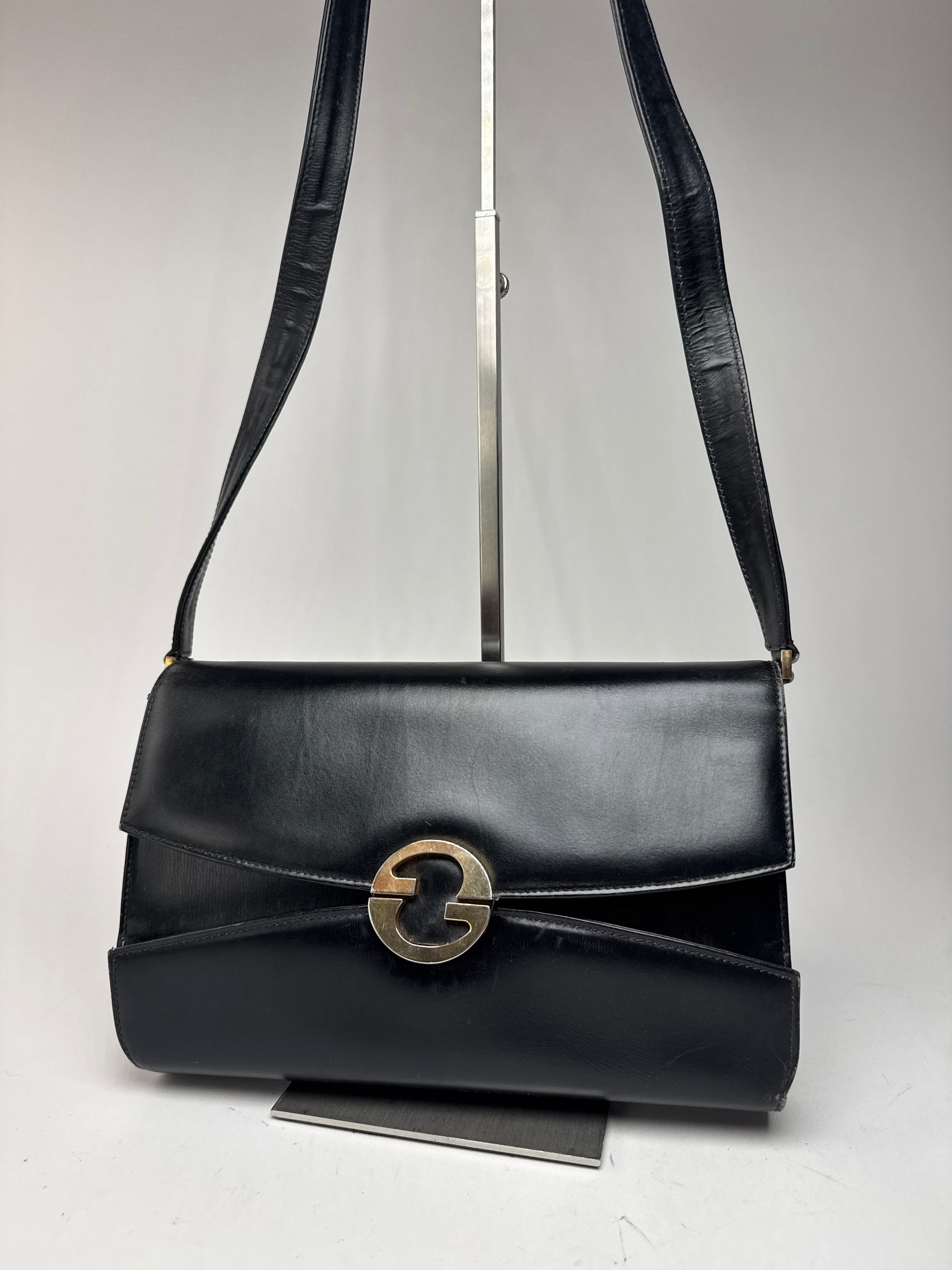 Sac à main GUCCI en cuir vintage. Ce sac à main chic est finement confectionné en cuir noir. Il est doté d'accessoires en acier doré, d'une fermeture à pression magnétique et du logo GG emblématique en métal doré poli sur le devant, symbole du design Gucci, introduit dans les années 1960 en hommage au fondateur de la marque, Guccio Gucci. Un compartiment ouvert au dos nécessite une réparation, par couture ou collage.