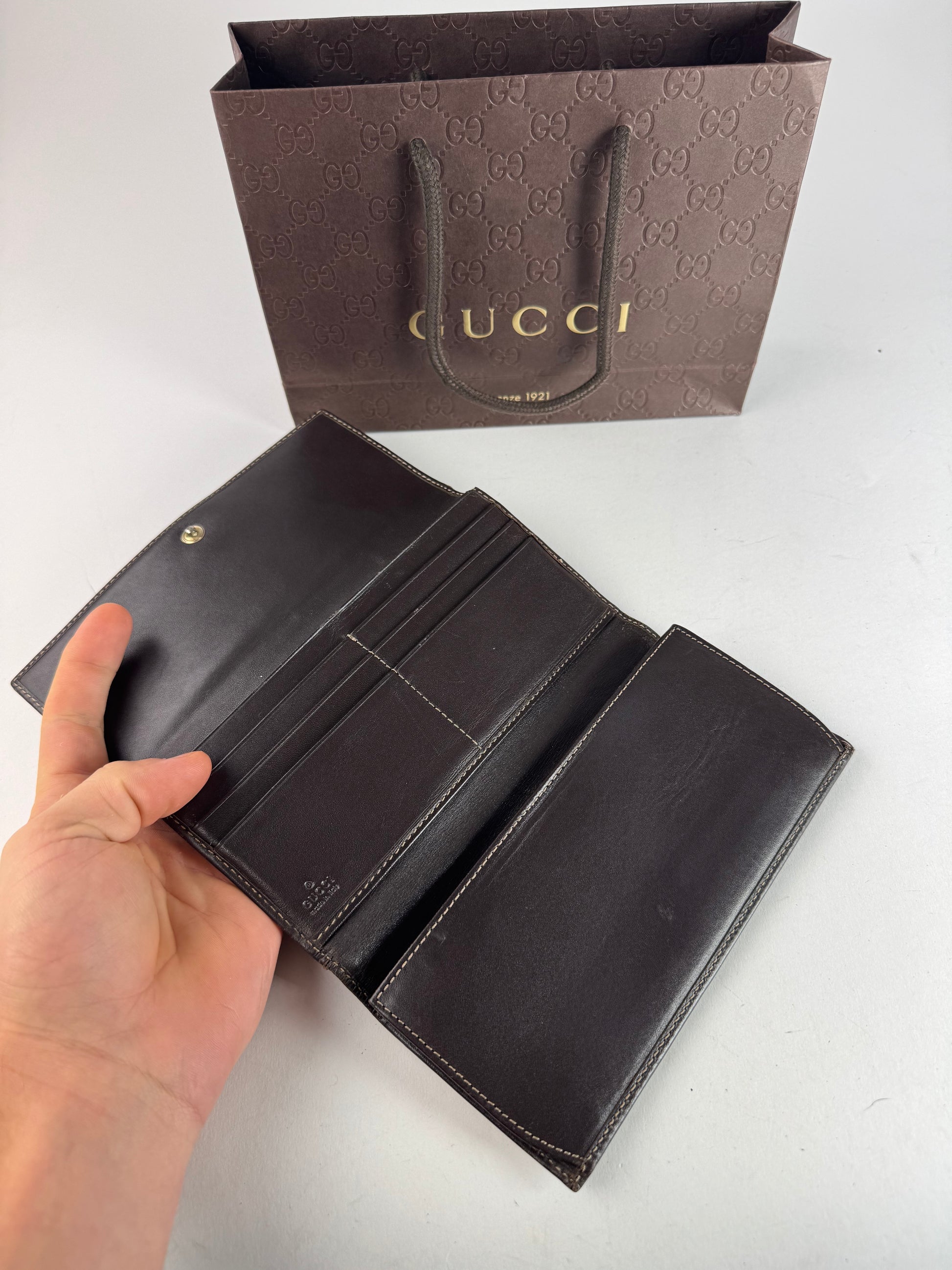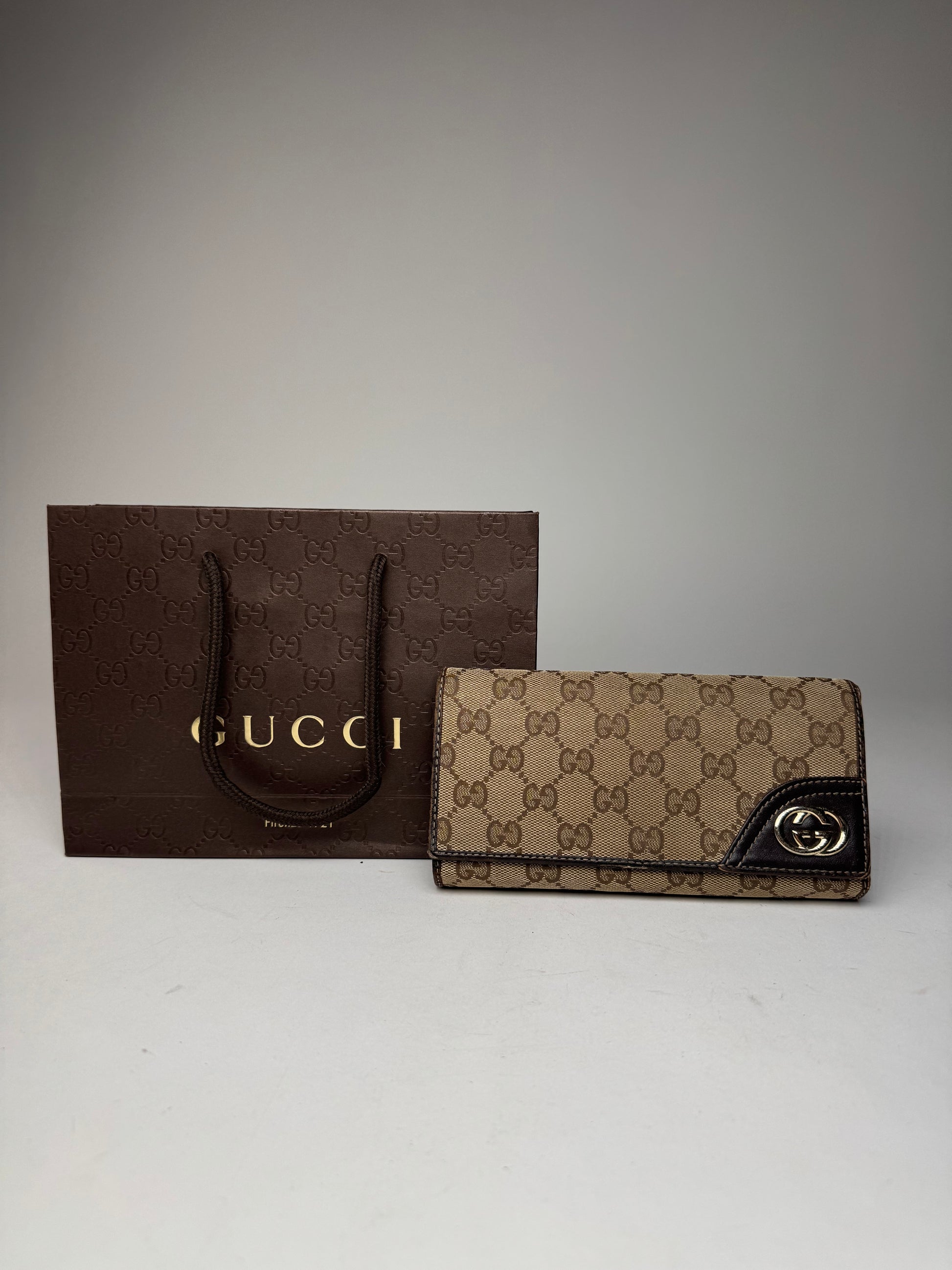 GUCCI Vintage GG Wallet. This elegant vintage wallet is crafted from dark brown and beige Gucci monogram canvas and features a signature GG appliqué in mixed silver- and gold-tone steel on the front. The wallet opens to a brown leather interior and is finished with beige stitching. Made in Italy.