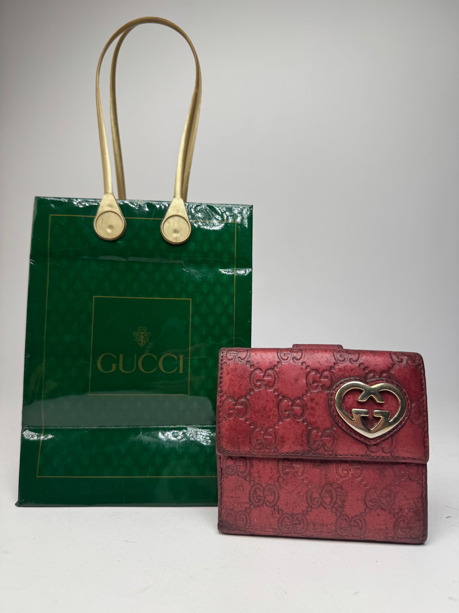 This expressive vintage wallet is crafted from red leather featuring a Gucci monogram pattern and is detailed with a Gucci GG heart appliqué in gold-tone steel on the front. The wallet features snap-button closures on both the front and back and opens to a metallic-effect red leather interior. Made in Italy, this piece reflects Gucci’s playful and bold accessory designs.