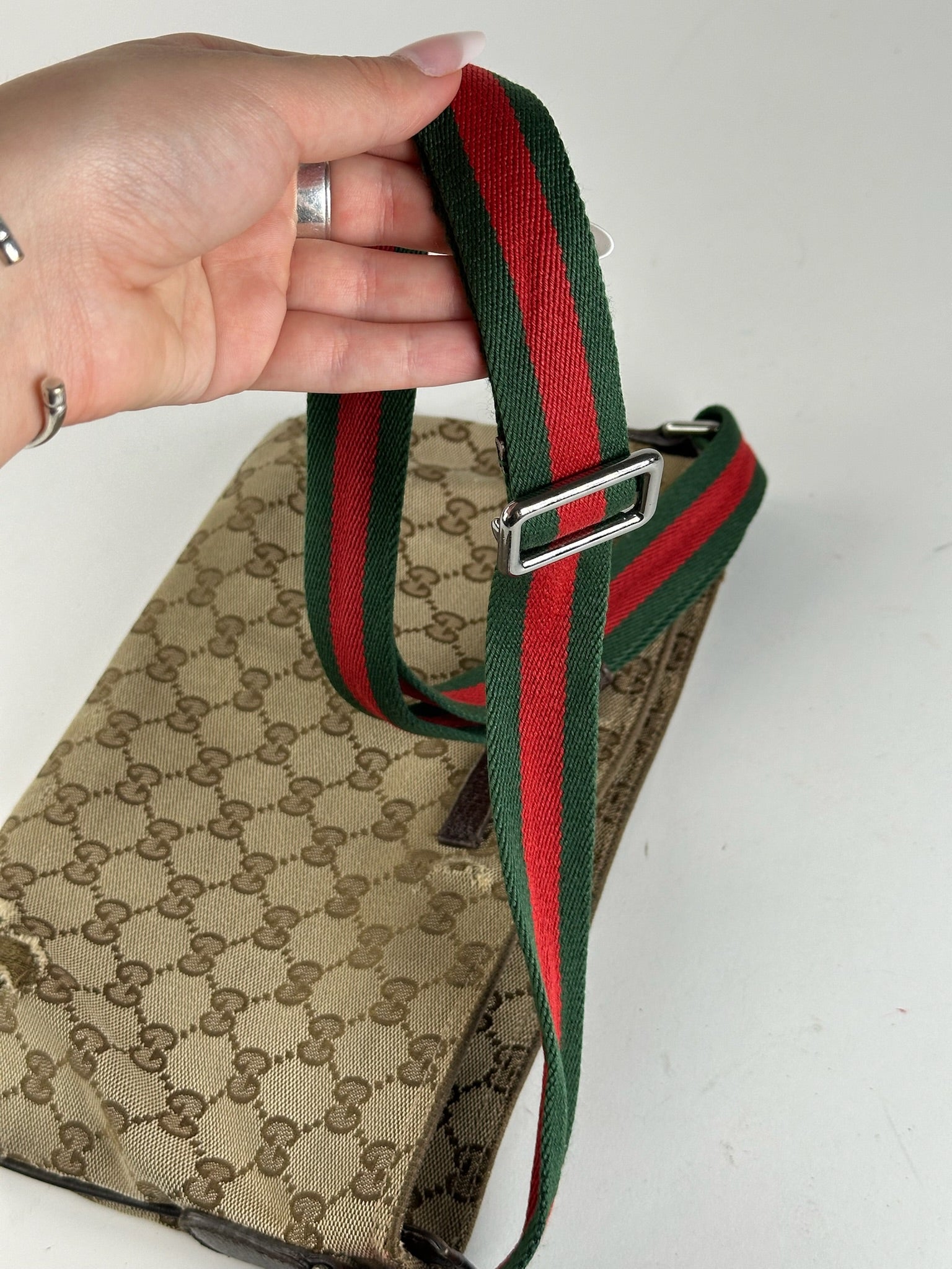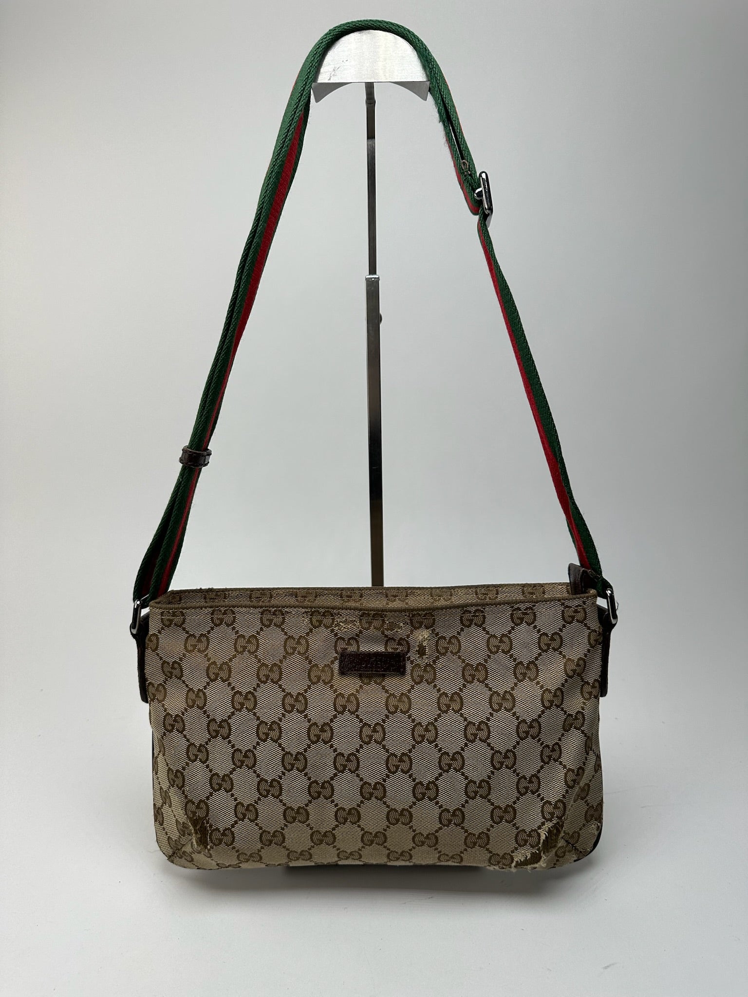 Sac à main GUCCI vintage beige-marron en toile monogramme GG. Ce sac vintage unisexe est confectionné en toile beige et marron, orné du monogramme GG classique, avec une bordure en cuir marron et une bandoulière réglable en toile rayée rouge et verte. L'intérieur est doublé en toile marron. Fabriqué en Italie, ce modèle allie fonctionnalité et héritage emblématique de Gucci. Introduit au début des années 1960 en hommage à Guccio Gucci, le monogramme GG est depuis devenu l'un des symboles les plus emblématiques de la mode de luxe.