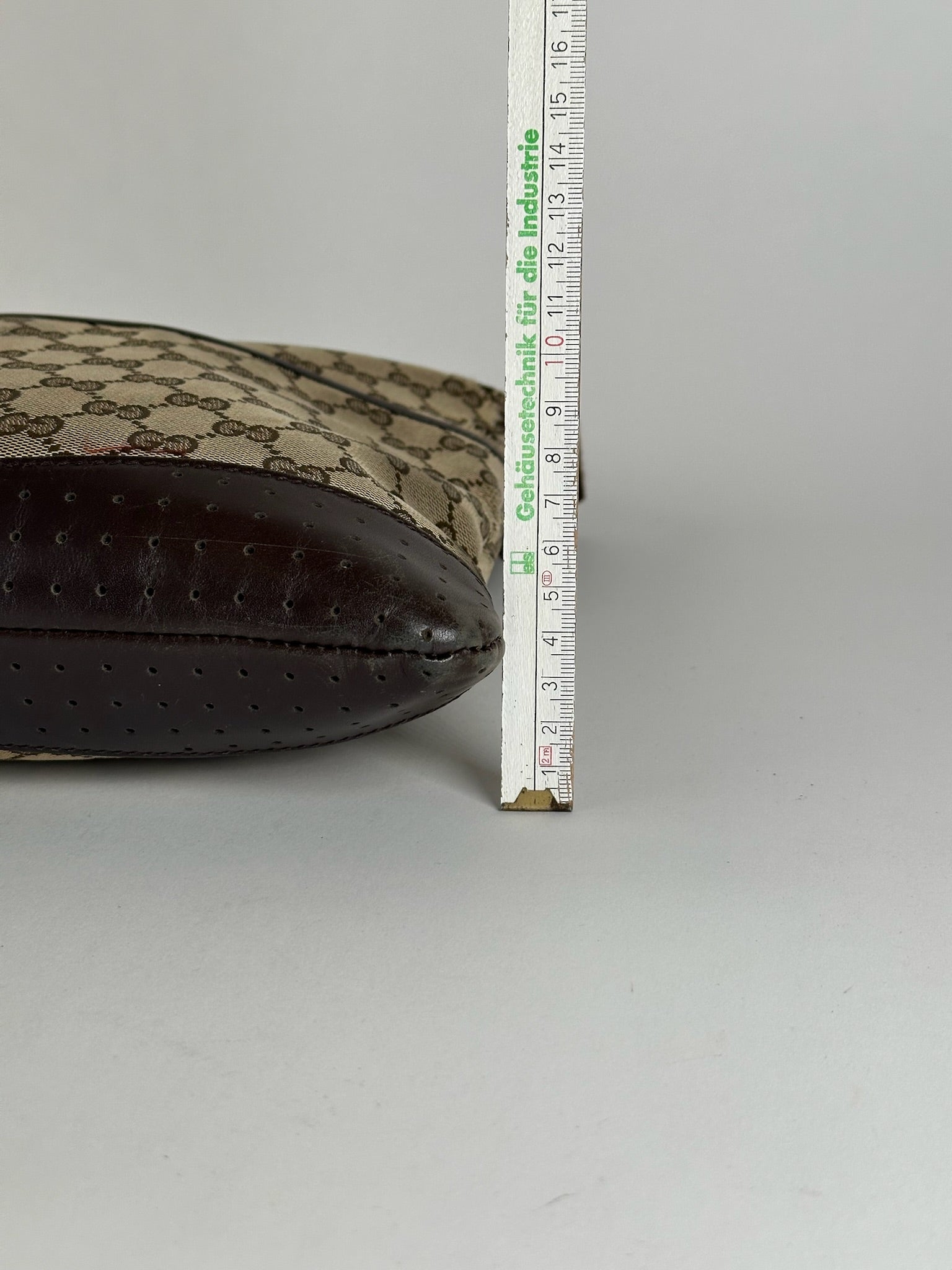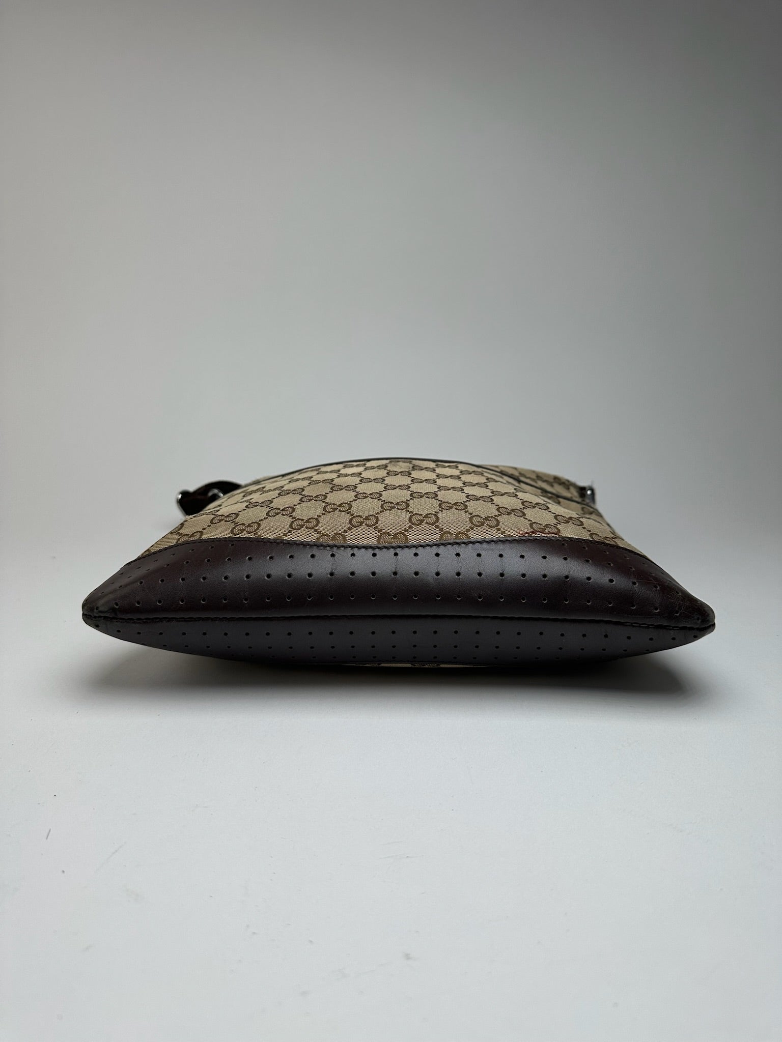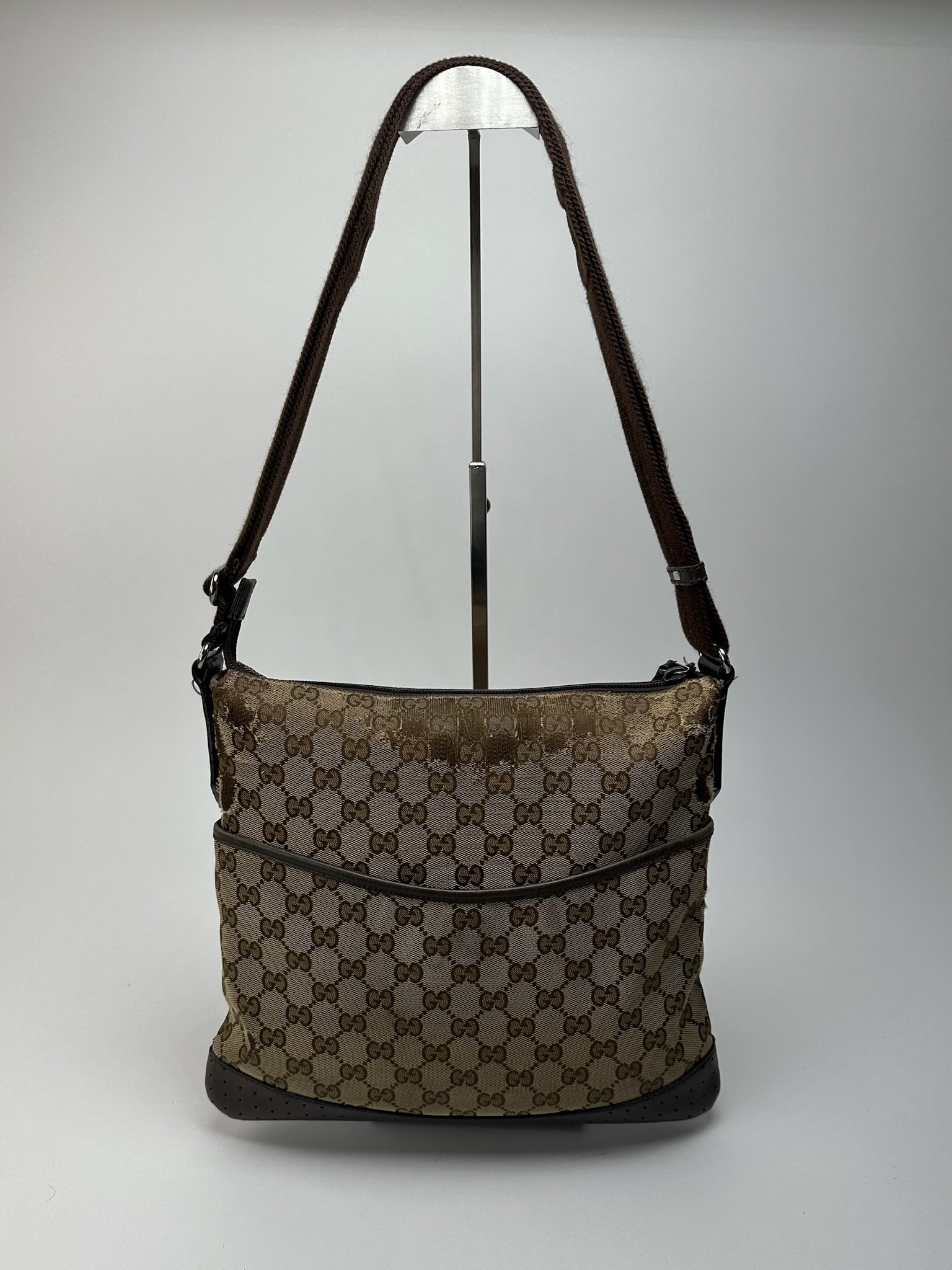 Sac bandoulière GUCCI vintage Monogram GG. Ce sac bandoulière classique est finement confectionné en toile monogrammée GG beige et marron, avec des finitions en cuir marron et des coins renforcés. L'emblématique motif GG, introduit dans les années 1960 en hommage au fondateur Guccio Gucci, est depuis devenu un symbole de l'esthétique intemporelle de la maison. La bandoulière réglable en toile marron assure un confort optimal, et le sac est orné de finitions en acier argenté.