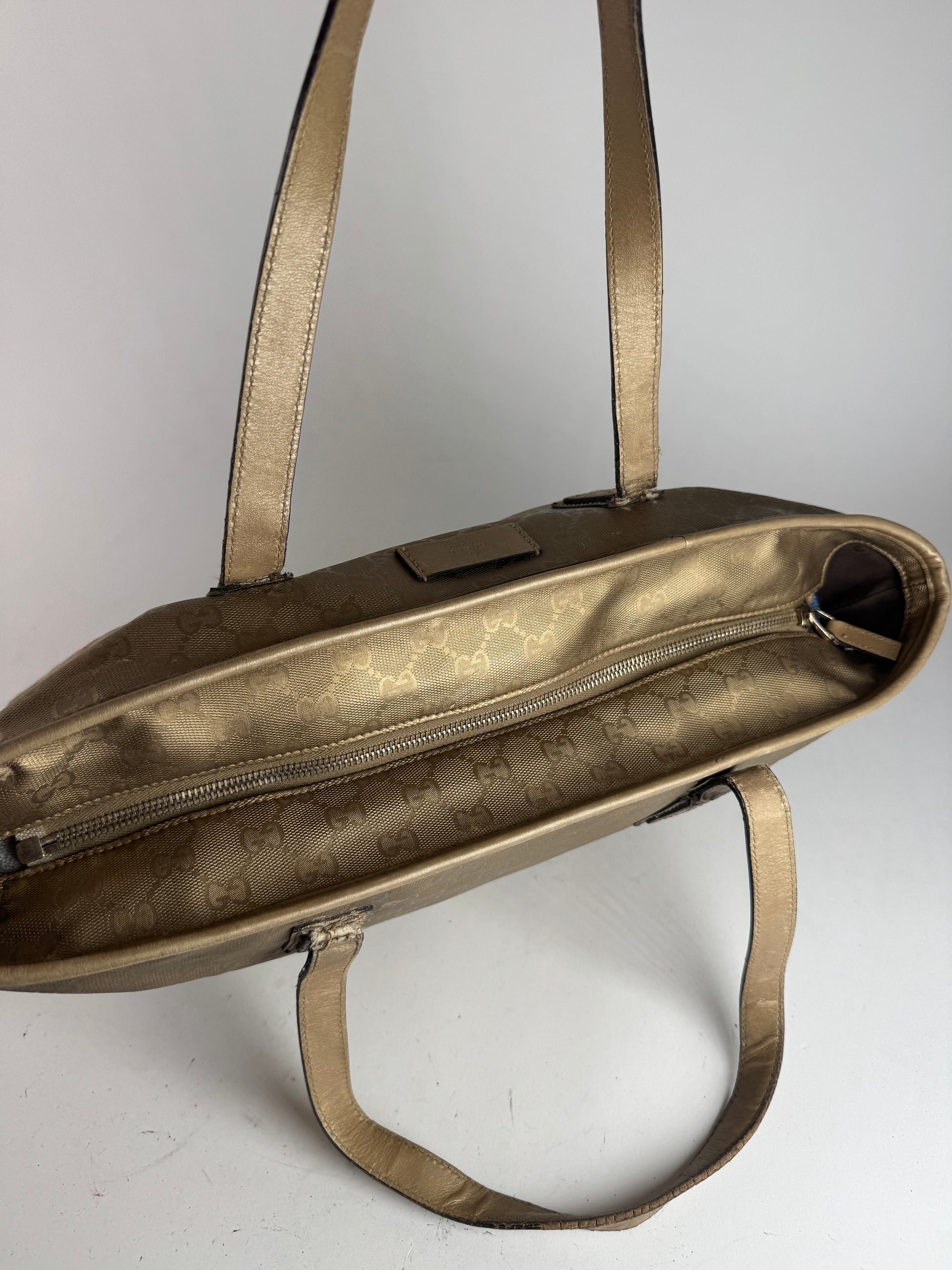 État : La toile extérieure et les poignées en cuir présentent des traces d'usure, avec de fortes rayures et taches au dos. La fermeture éclair est parfaitement fonctionnelle. La doublure intérieure est propre et bien conservée, ornée de l'inscription Gucci.