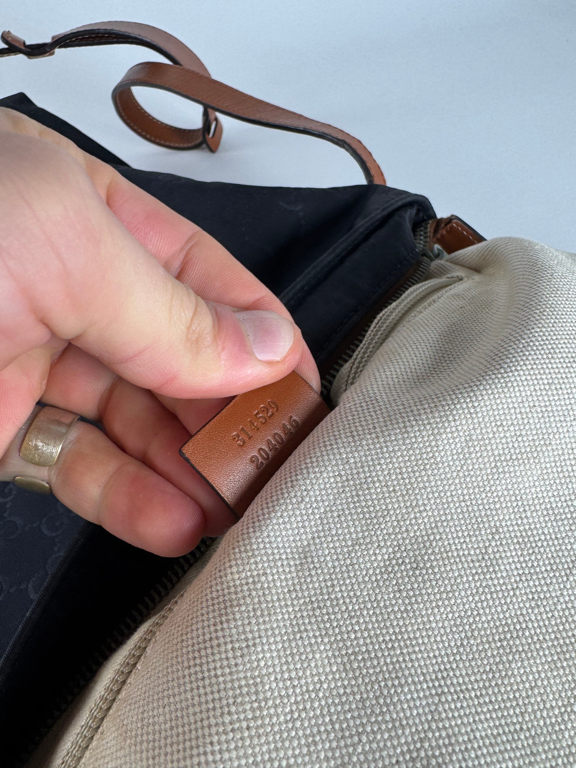 Condition Details: The exterior canvas and leather trim are clean and well preserved with light discoloration consistent with gentle use. The silver-tone steel hardware shows minor surface marks. The top zipper functions but sticks slightly. The interior canvas lining is clean and in very good condition. Serial number reads: 314-529-2040-46.