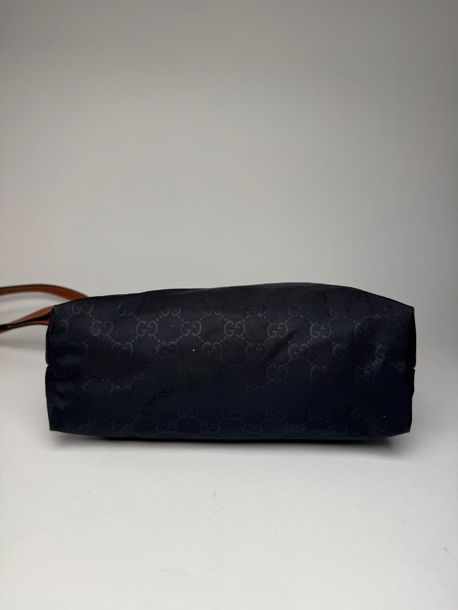 GUCCI Vintage Shoulder / Crossbody Bag. This versatile vintage bag is crafted from black canvas featuring the iconic Gucci monogram and complemented by orange-brown leather trimming and an adjustable leather shoulder strap. The design is finished with silver-tone steel hardware and opens with a top zip closure to a beige canvas interior, reflecting Gucci’s timeless Italian craftsmanship and functional elegance.