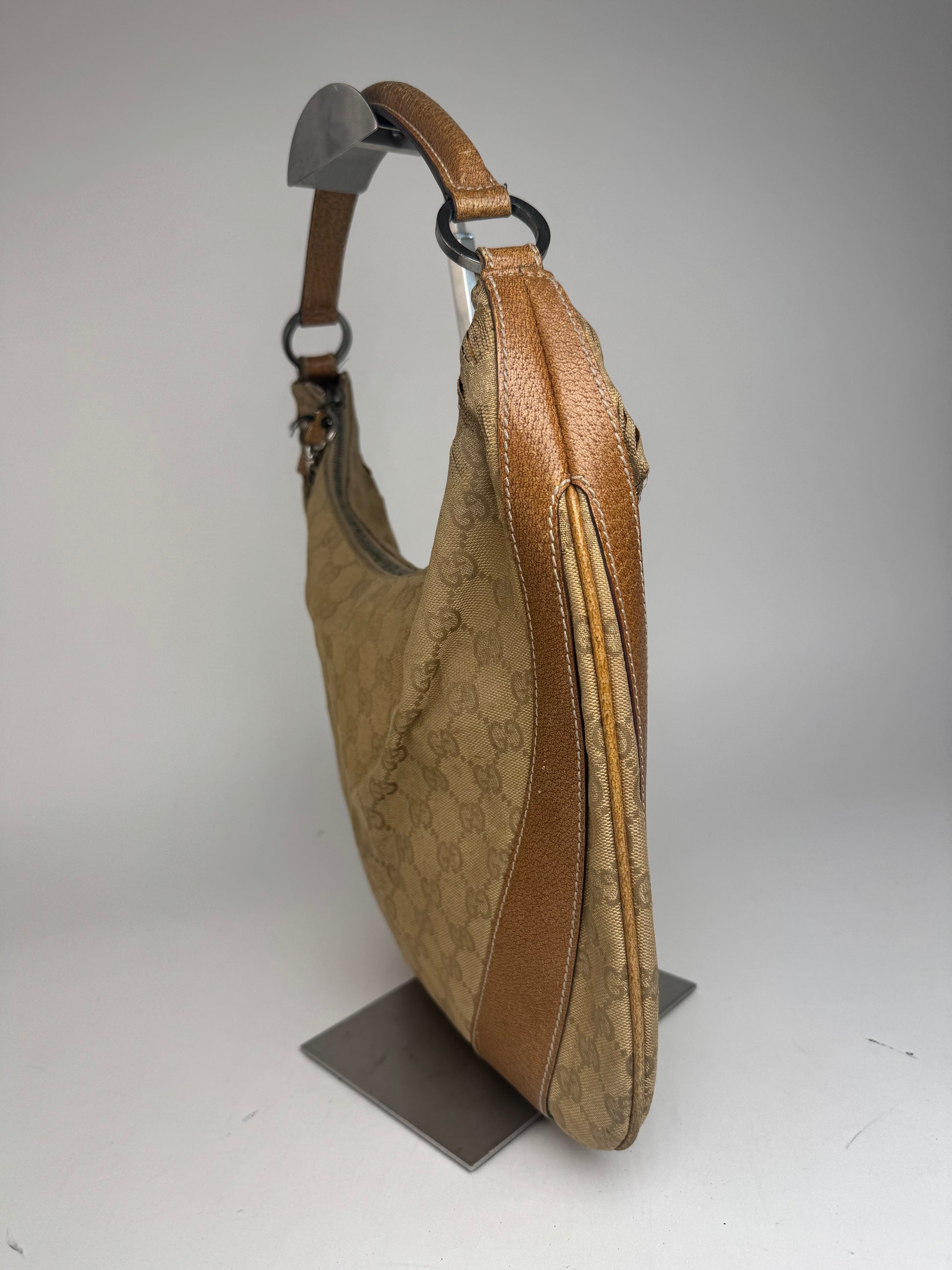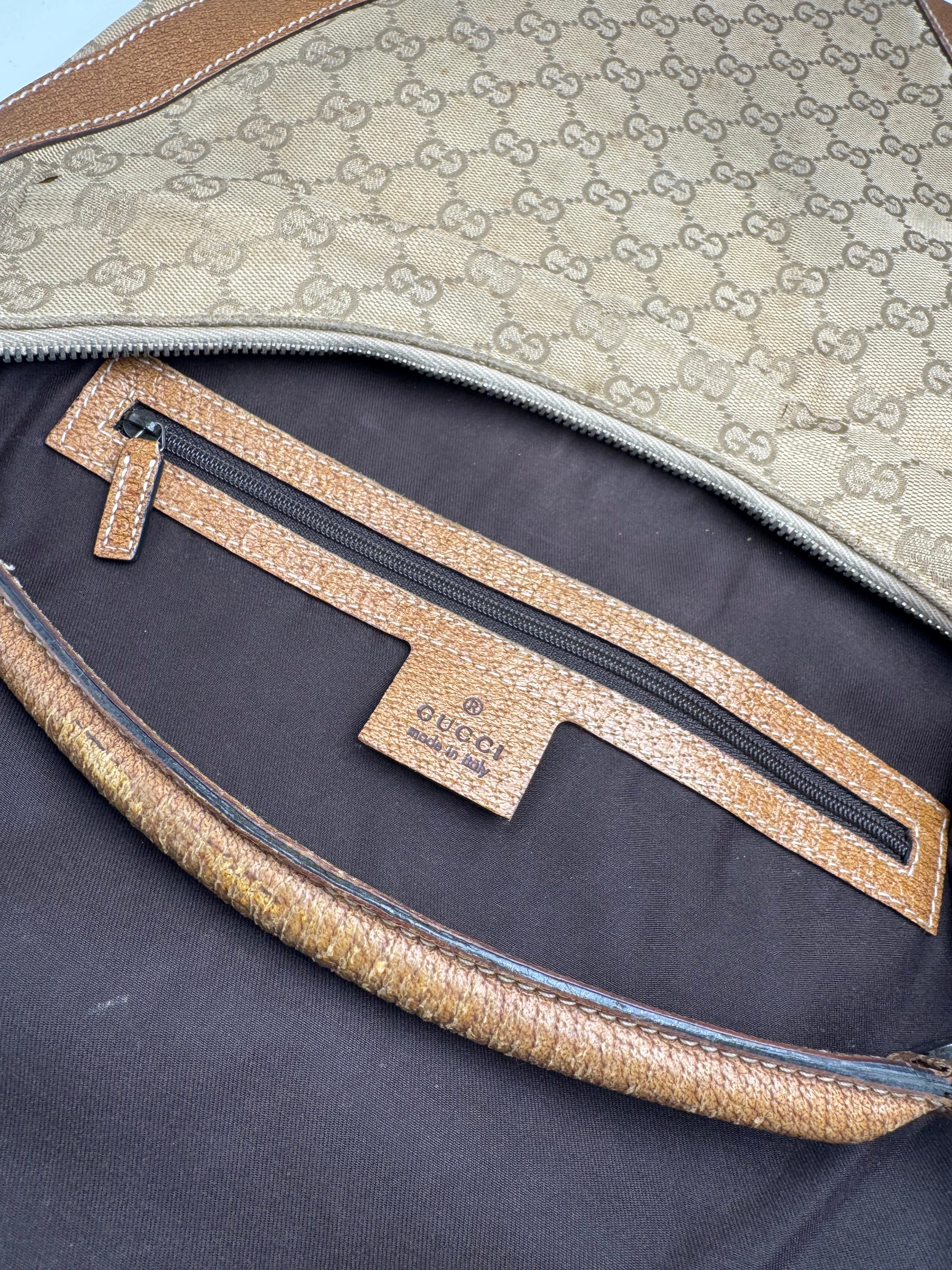 Sac à main GUCCI vintage. Ce sac chic est finement confectionné en toile monogrammée Gucci beige, avec des finitions et des poignées en cuir marron. Il présente une silhouette en demi-lune, une fermeture zippée sur le dessus et des finitions en acier argenté. L'intérieur est doublé de toile marron.