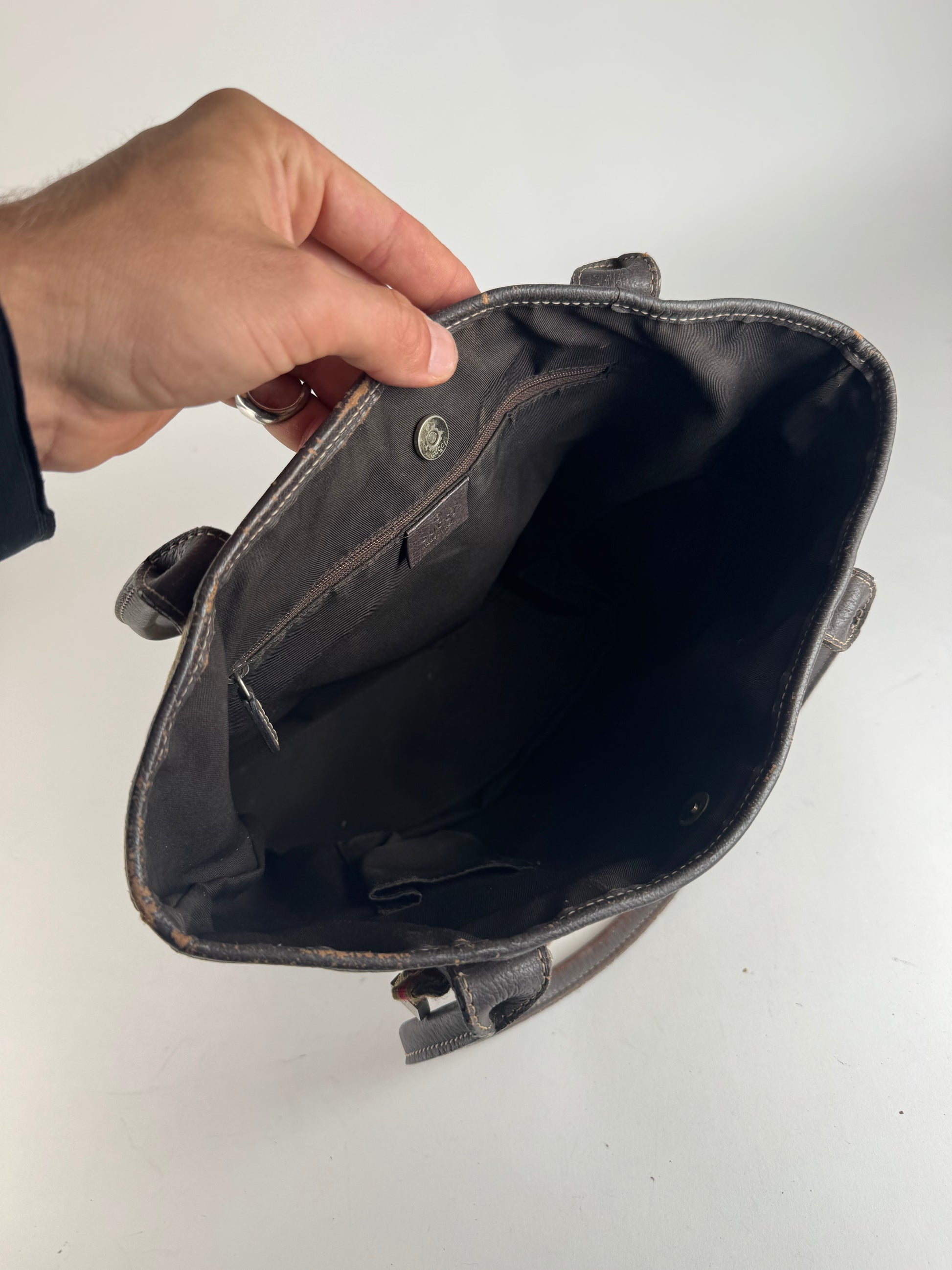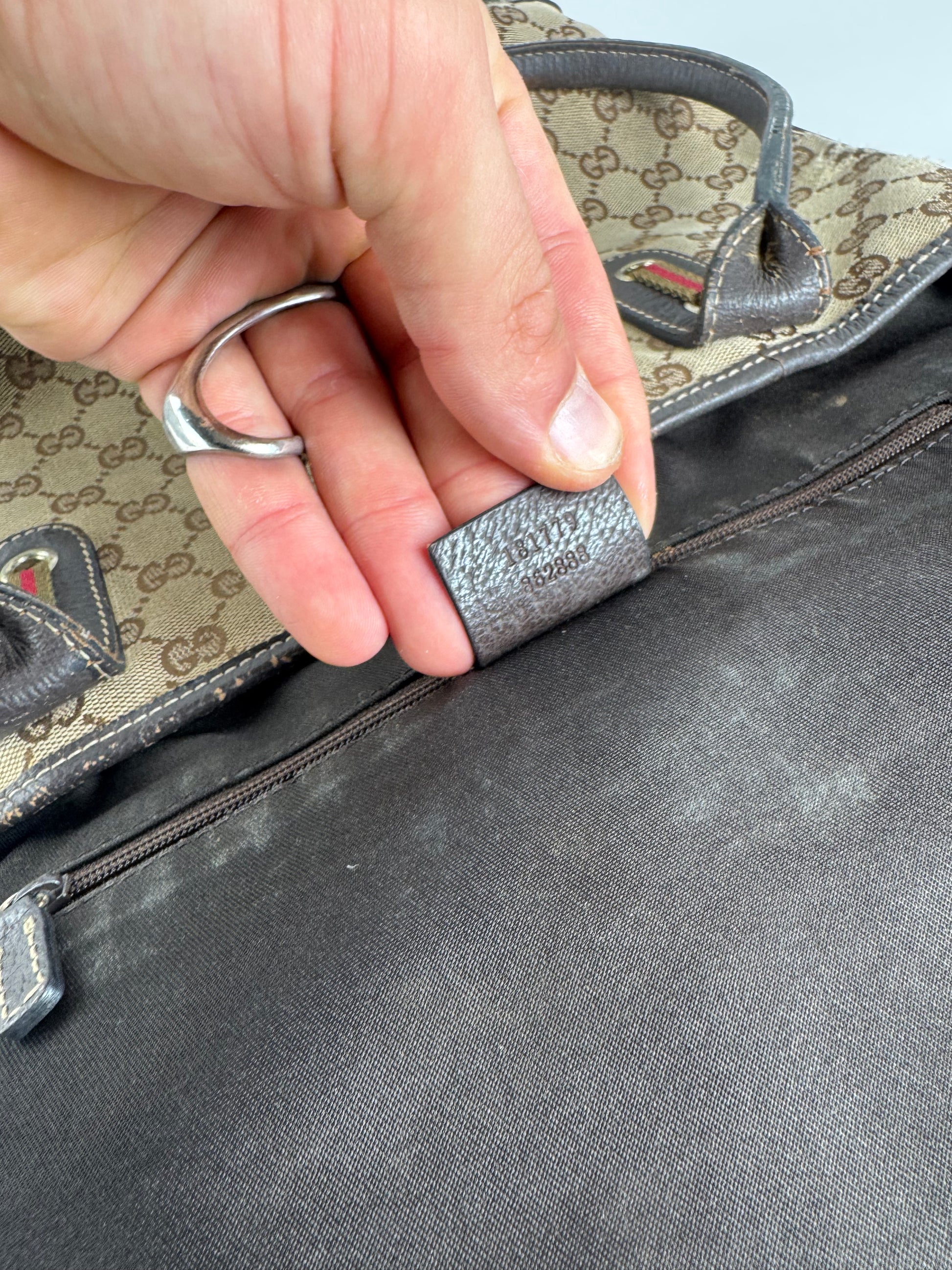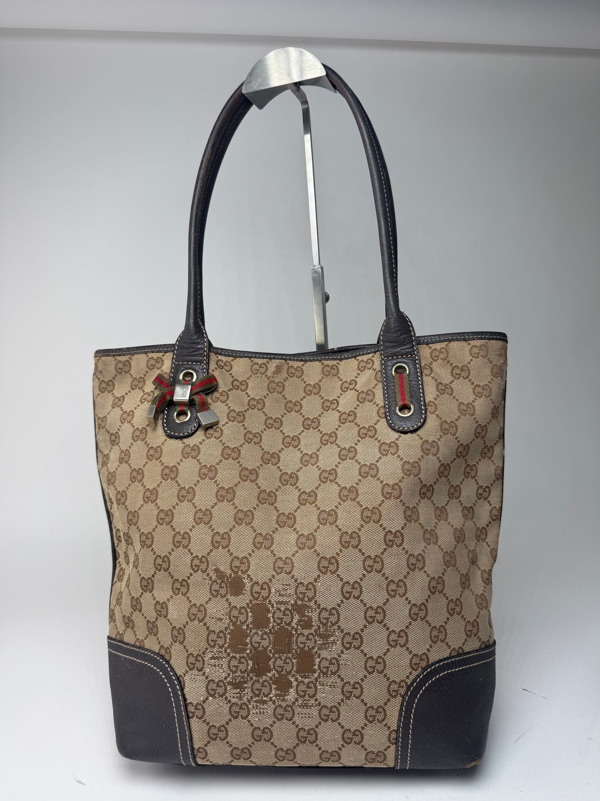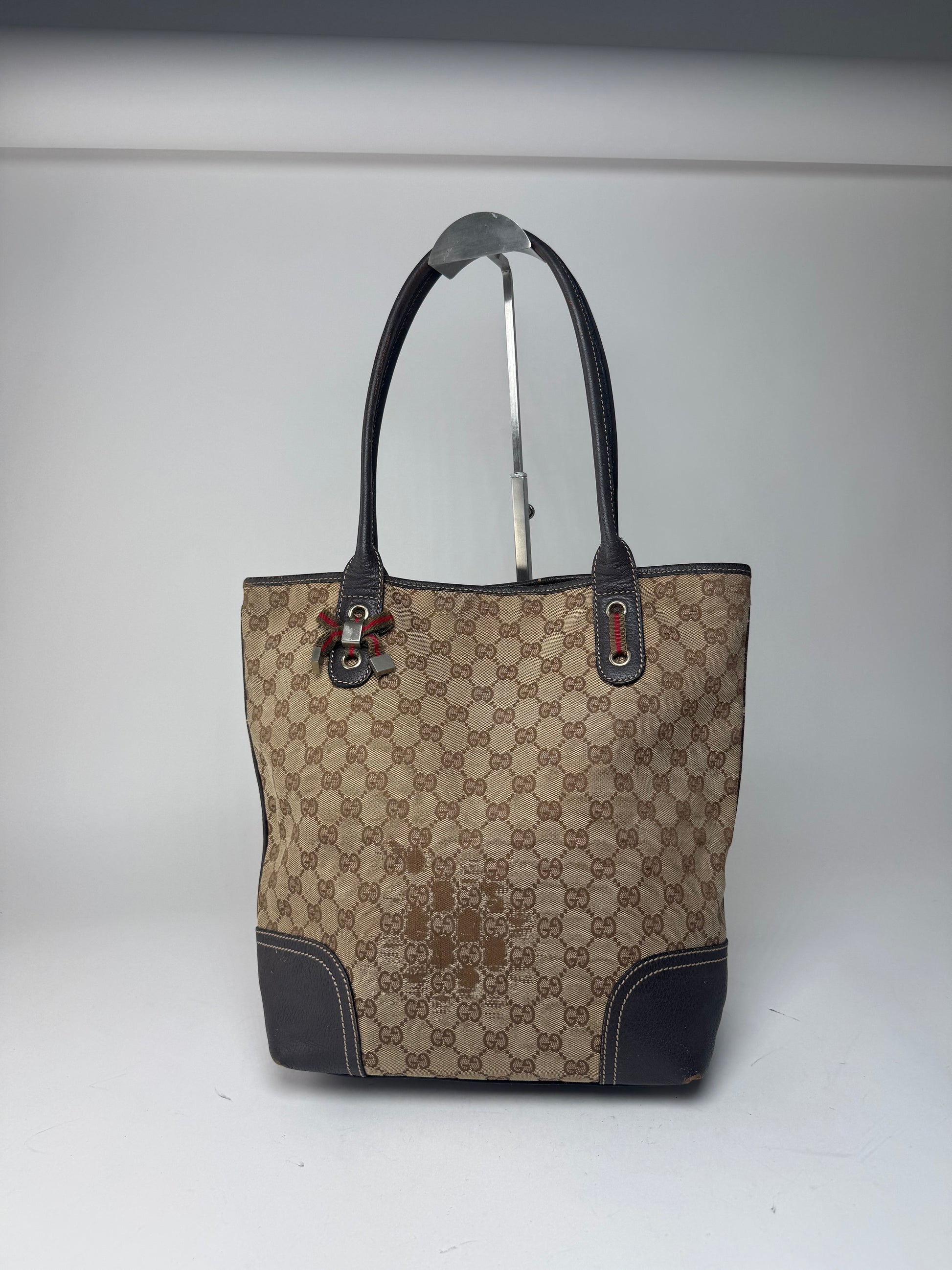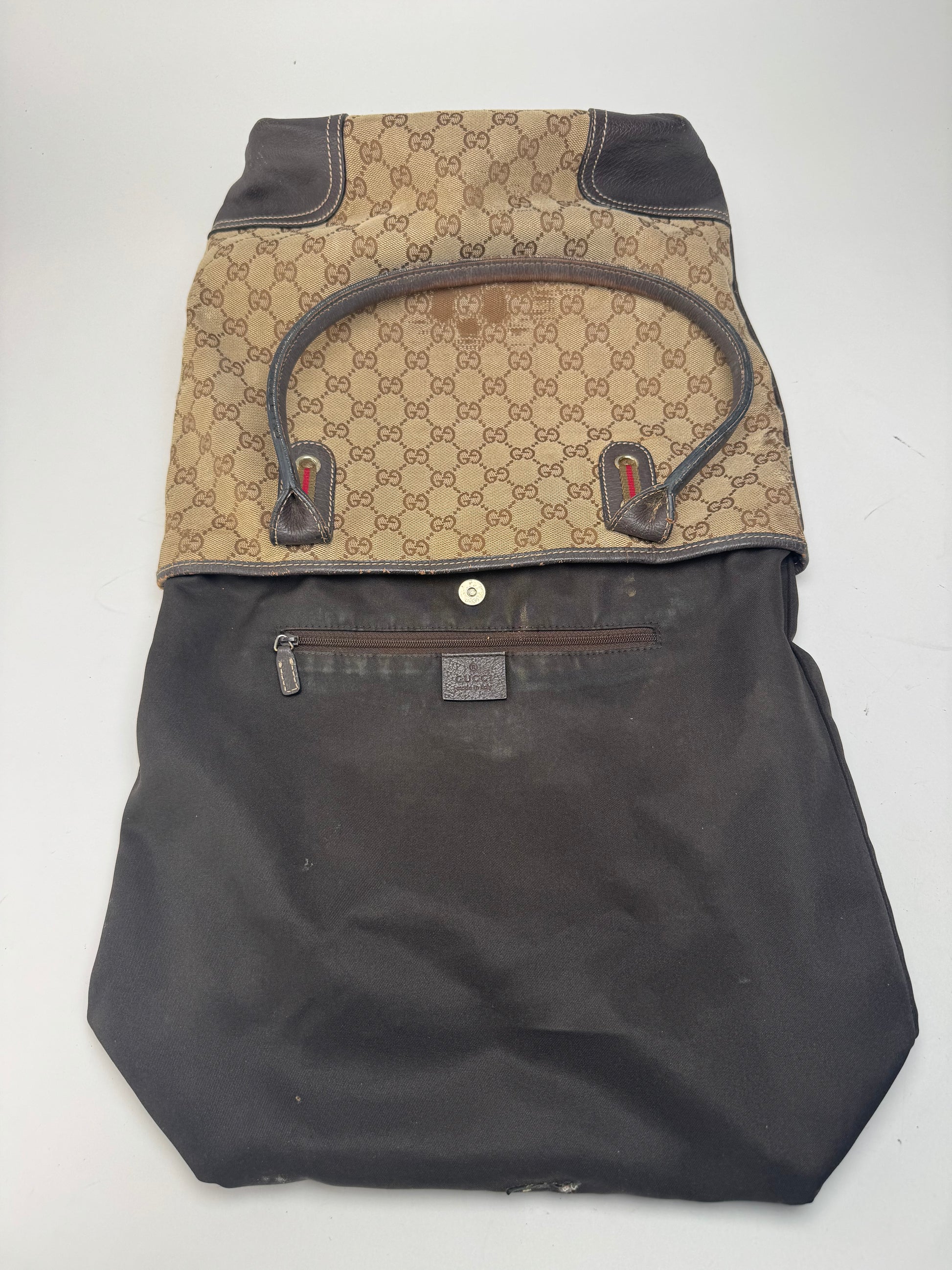 Ce sac à main vintage chic est finement confectionné en toile beige ornée du monogramme emblématique Gucci. Il est doté de longues poignées en cuir marron foncé, de garnitures en cuir assorties et de coins renforcés. L'intérieur est doublé de toile marron et des finitions en acier doré complètent son design.
