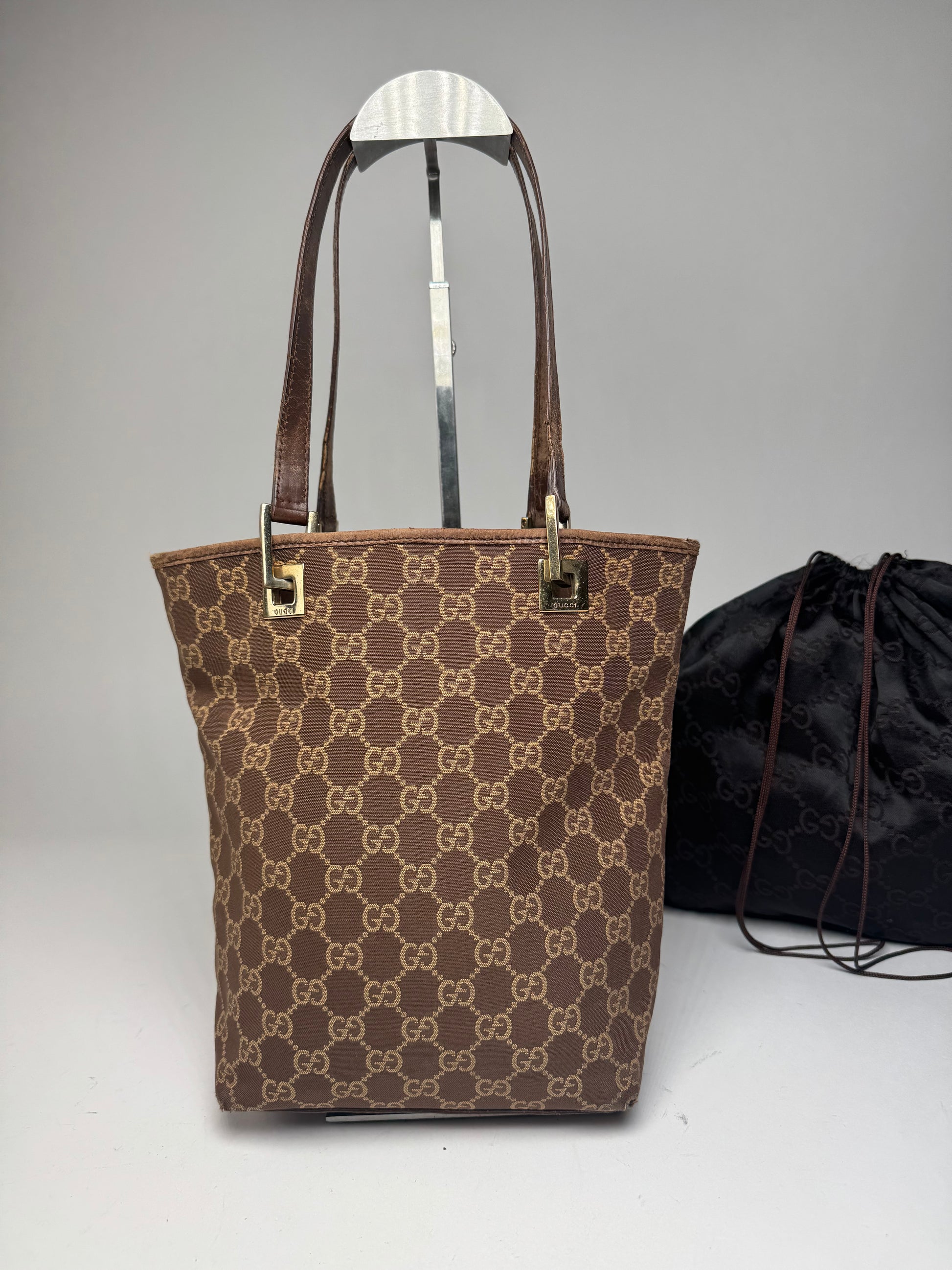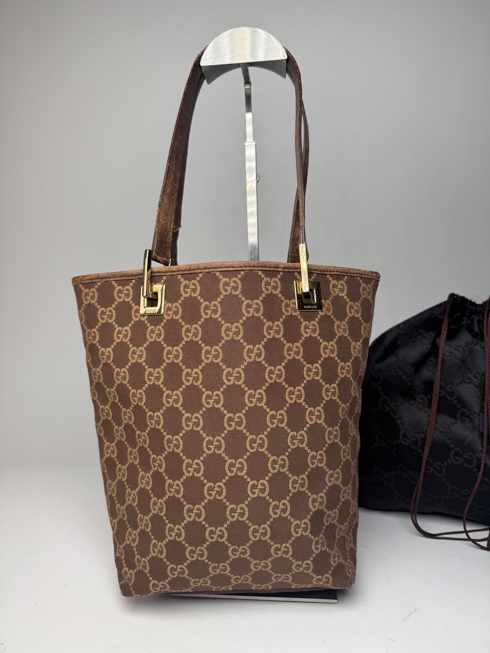 GUCCI Vintage Mini Tote Bag. This timeless tote bag is finely crafted of classic Gucci monogram canvas in brown and gold. The bag features brown leather top handles and polished gold-tone steel hardware. The top opens to a brown canvas interior.