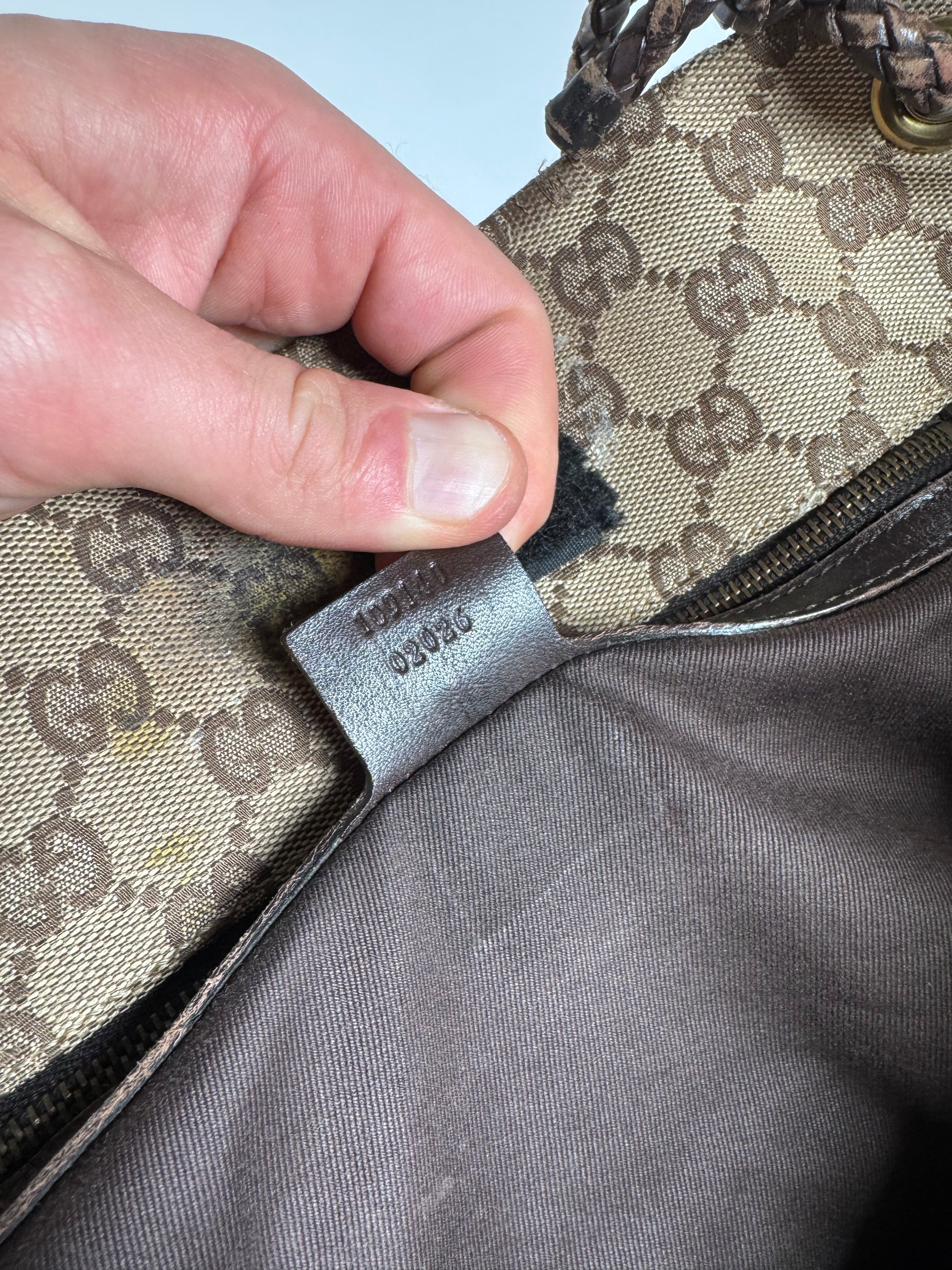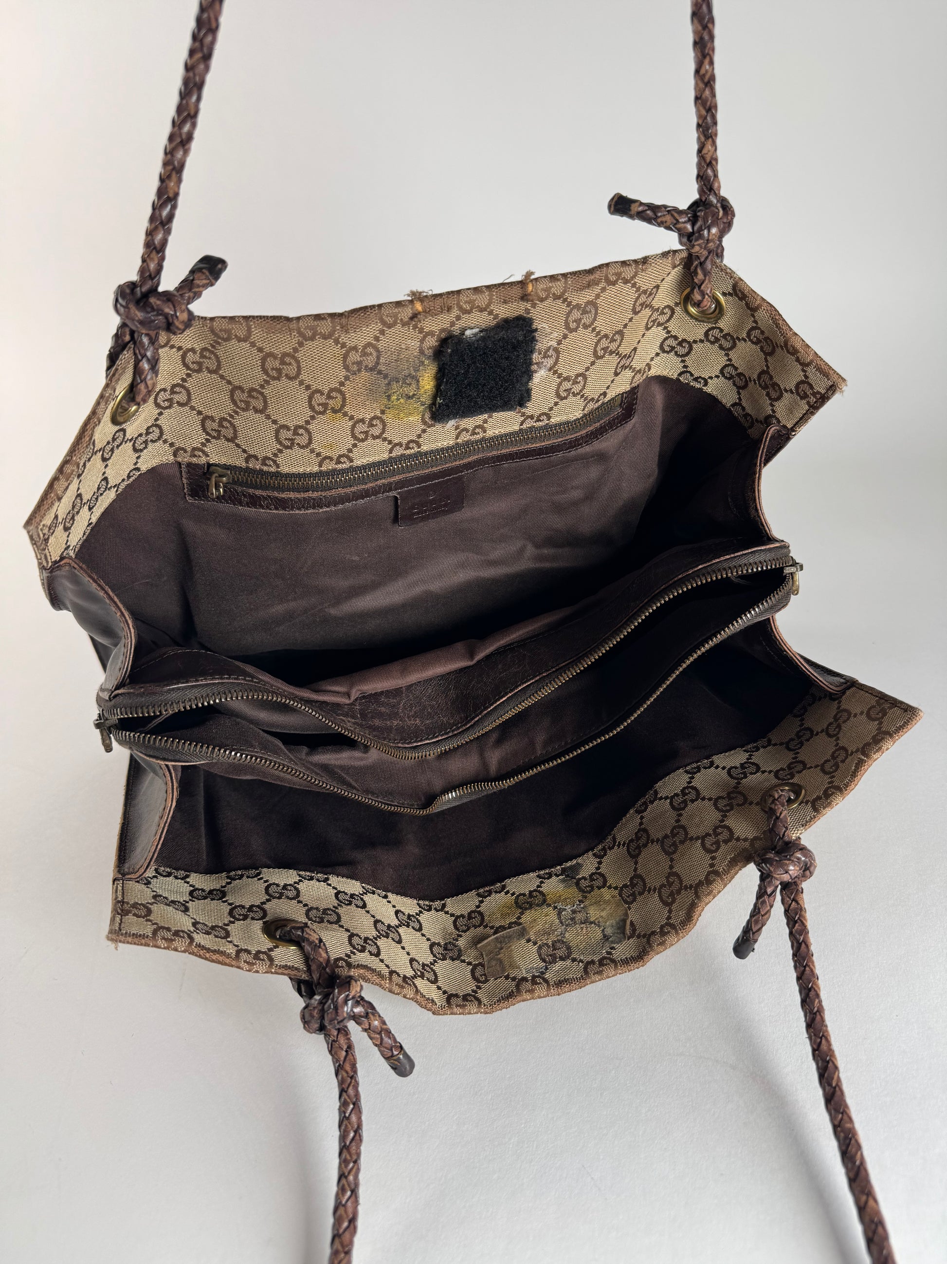 GUCCI Vintage Tote Bag. This classic vintage tote bag is crafted from beige and brown Gucci monogram canvas and features braided leather handles. Designed with brown leather trimming and gold-tone steel hardware, the bag offers three interior compartments, including one with a zipper closure, reflecting Gucci’s timeless Italian craftsmanship and functional elegance.