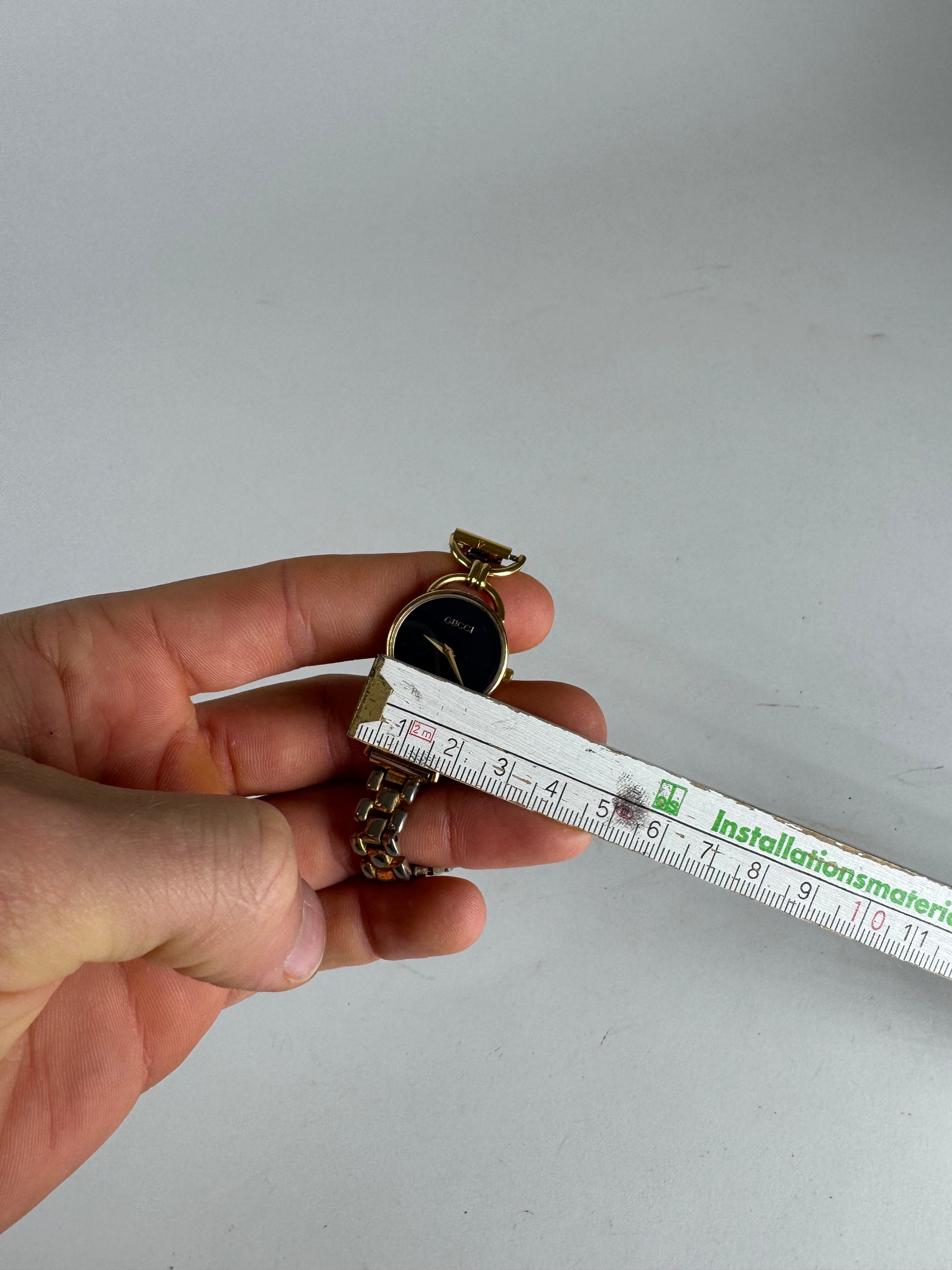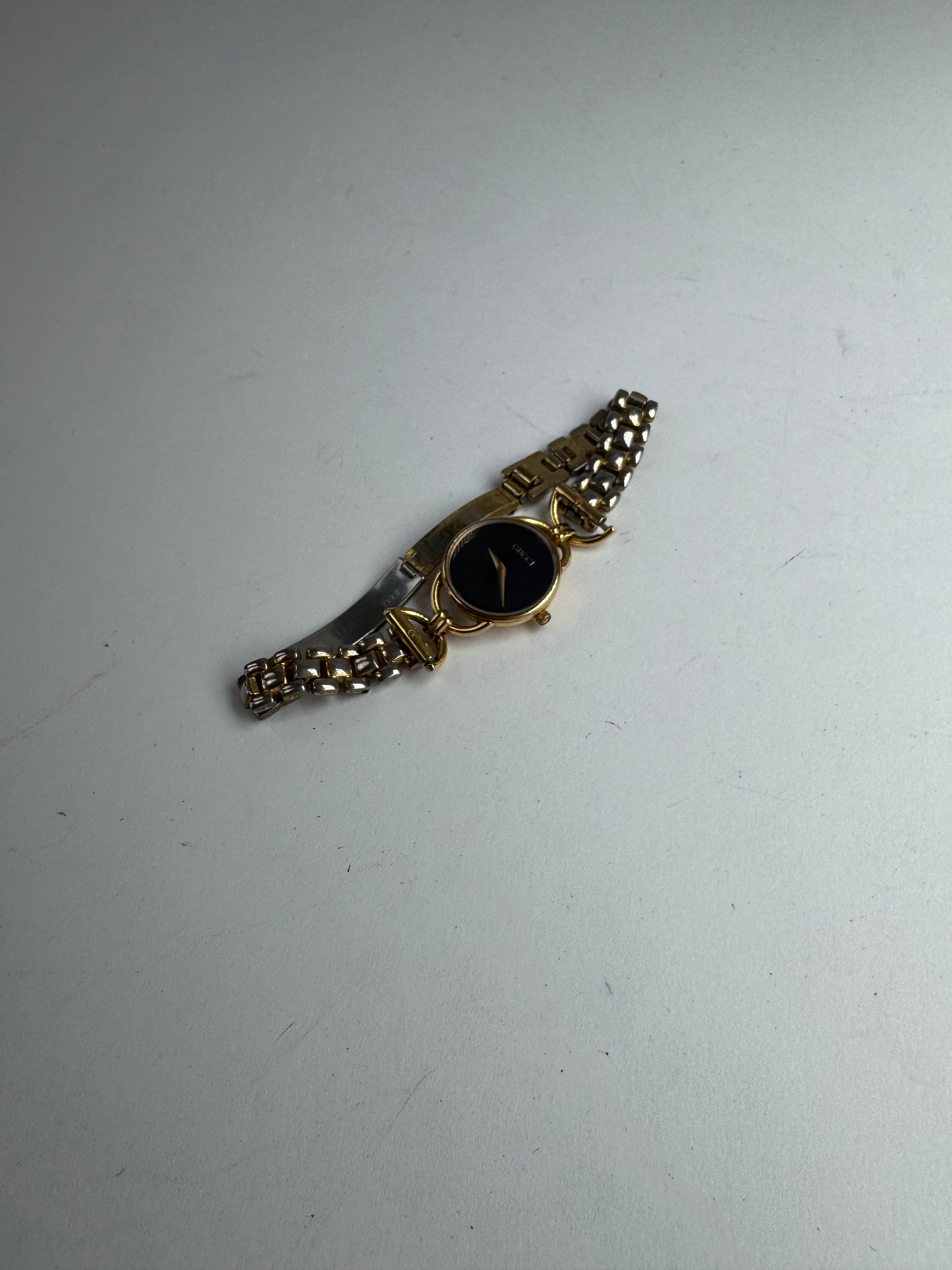 Cette montre Gucci vintage Horsebit est fabriquée en acier doré et arbore un design élégant et intemporel. Son bracelet à maillons lui confère une touche sophistiquée, en faisant un accessoire raffiné en toute occasion. La montre est dotée d'un mouvement à quartz et sa pile a été récemment remplacée.