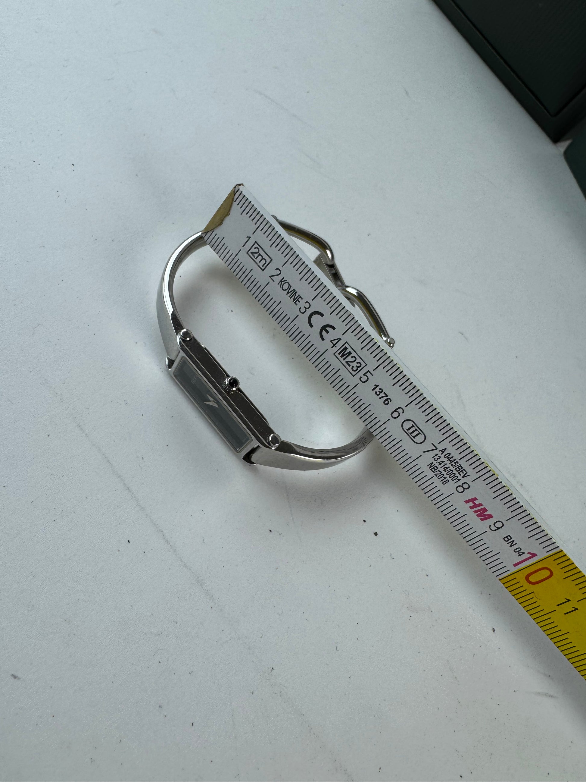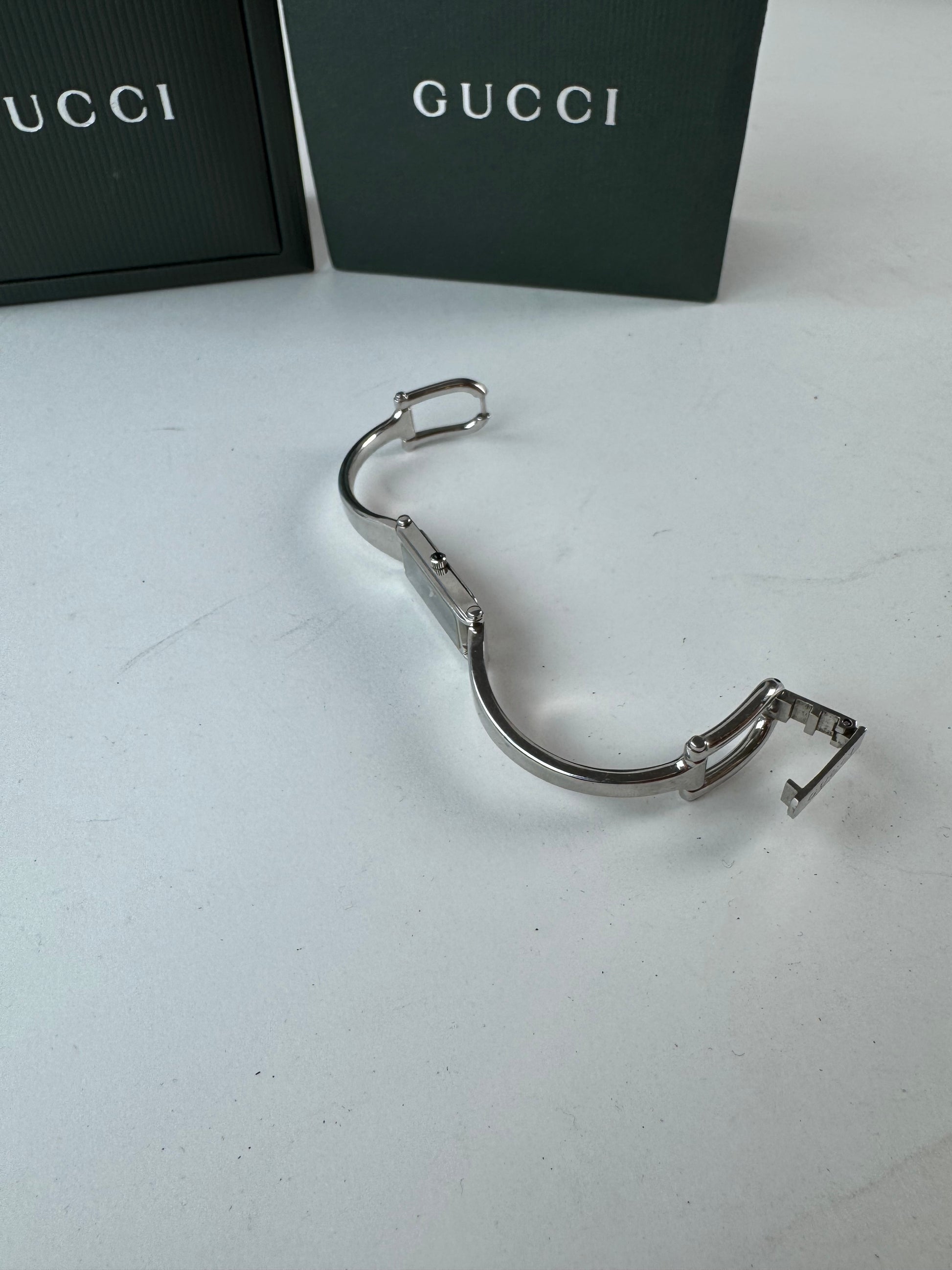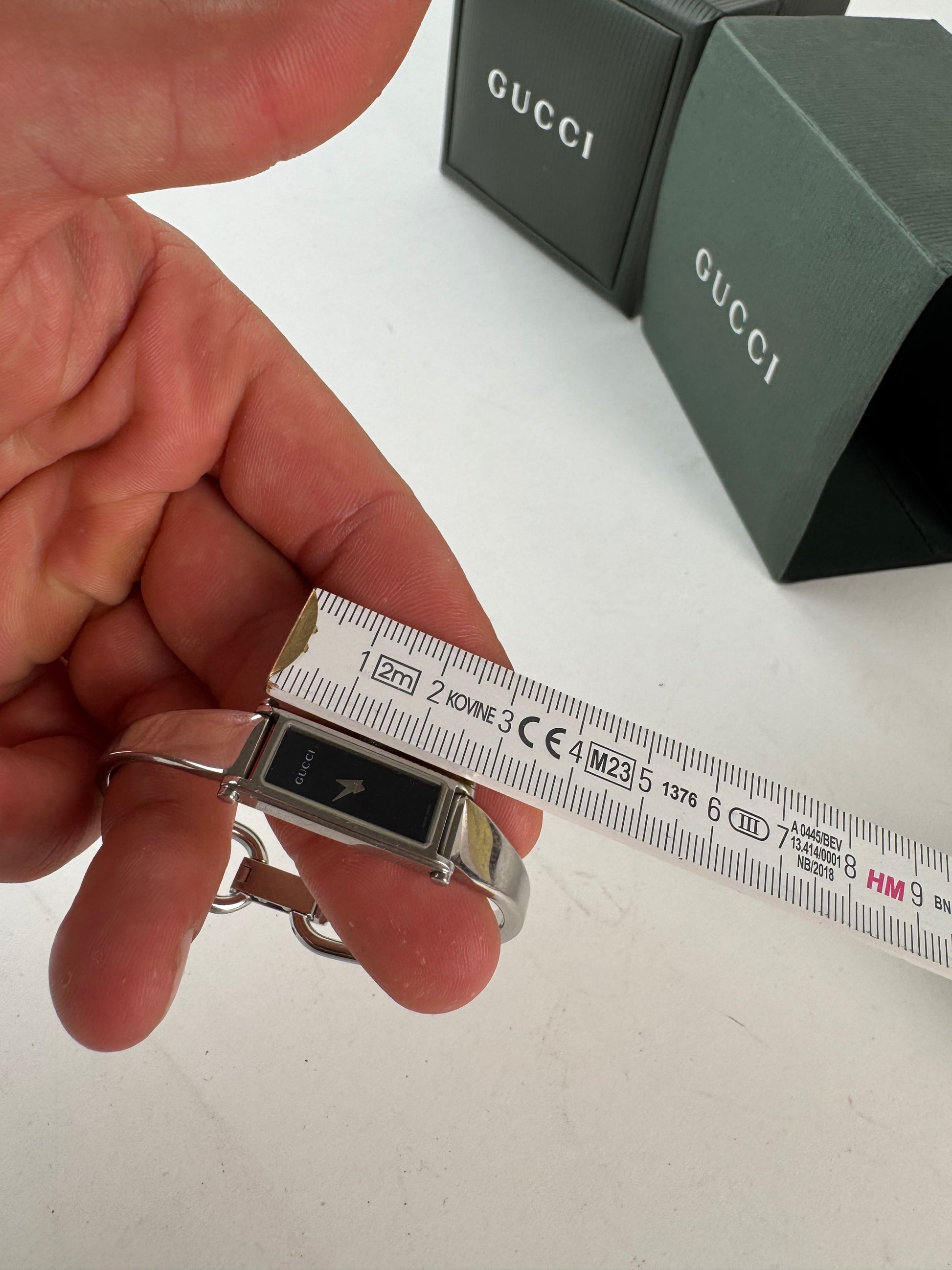 Montre GUCCI en acier inoxydable avec mors de cheval. Cette élégante montre est confectionnée en acier inoxydable argenté poli. Elle est dotée d'un cadran noir avec aiguilles en acier inoxydable argenté et d'un boîtier distinctif en forme de mors de cheval. Le bracelet, également en acier inoxydable argenté, complète son design élégant. Le boîtier mesure 2,5 cm de haut et 1 cm de large, avec un diamètre réglable de 6 à 6,5 cm. Fabriquée en Suisse. La montre est à quartz et sa pile a été récemment remplacée.
