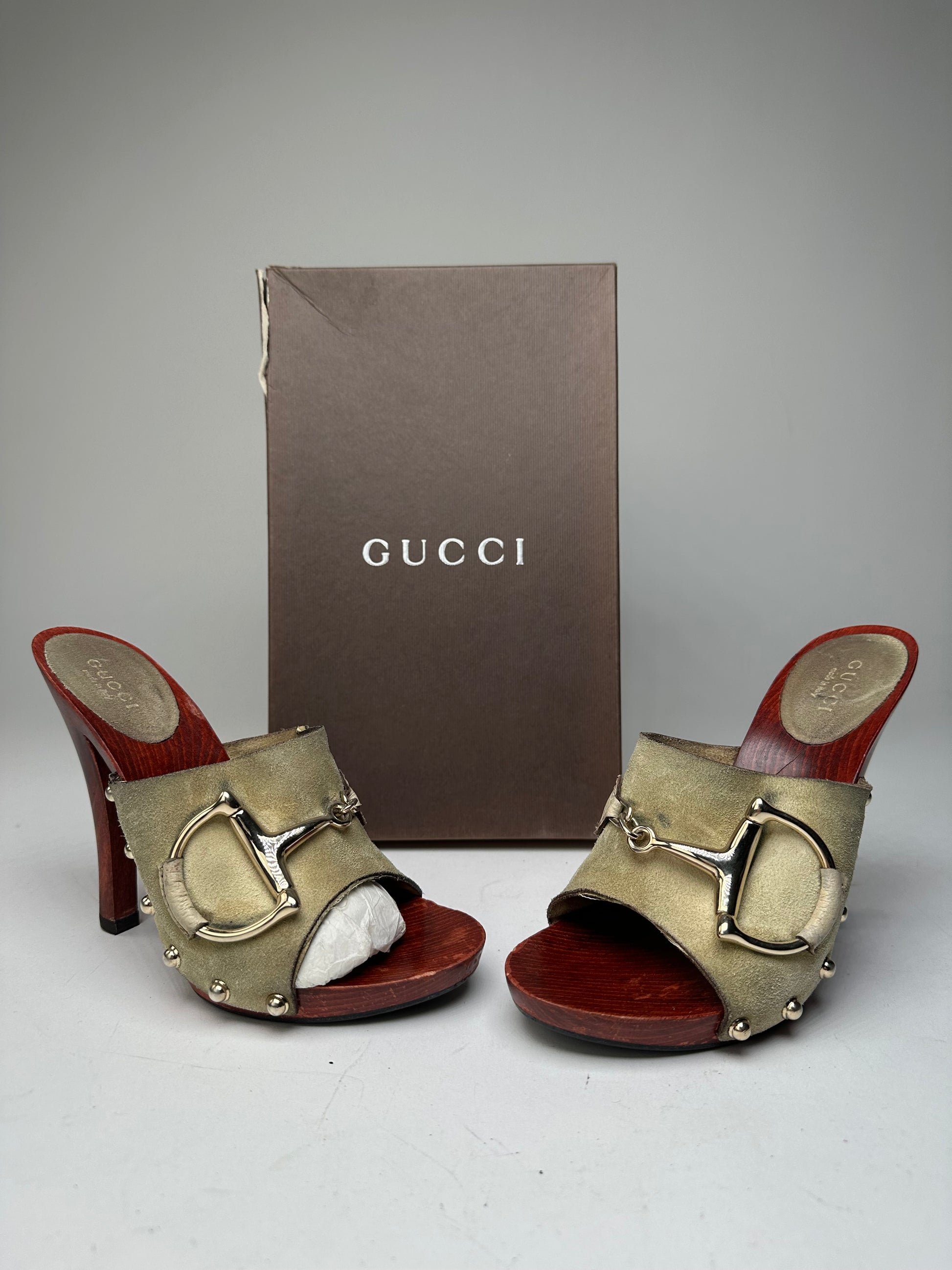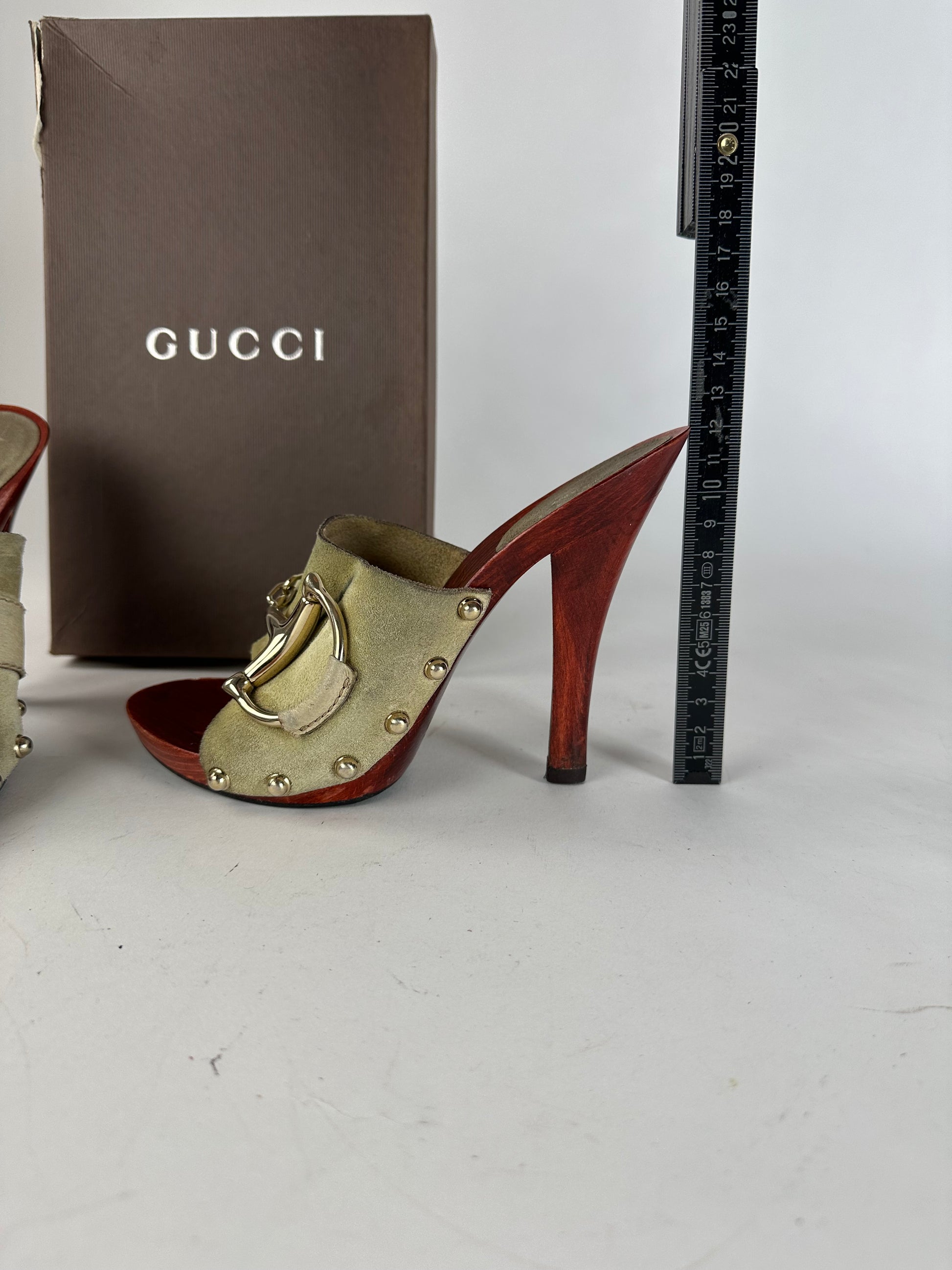 GUCCI Vintage Horsebit Pumps. These elegant vintage pumps are crafted of red-brown wood and beige cream suede. The shoes feature a gold-tone steel Horsebit appliqué on the front and gold-tone studs on the sides. The heel height measures 12 cm. The sale includes a Gucci box.