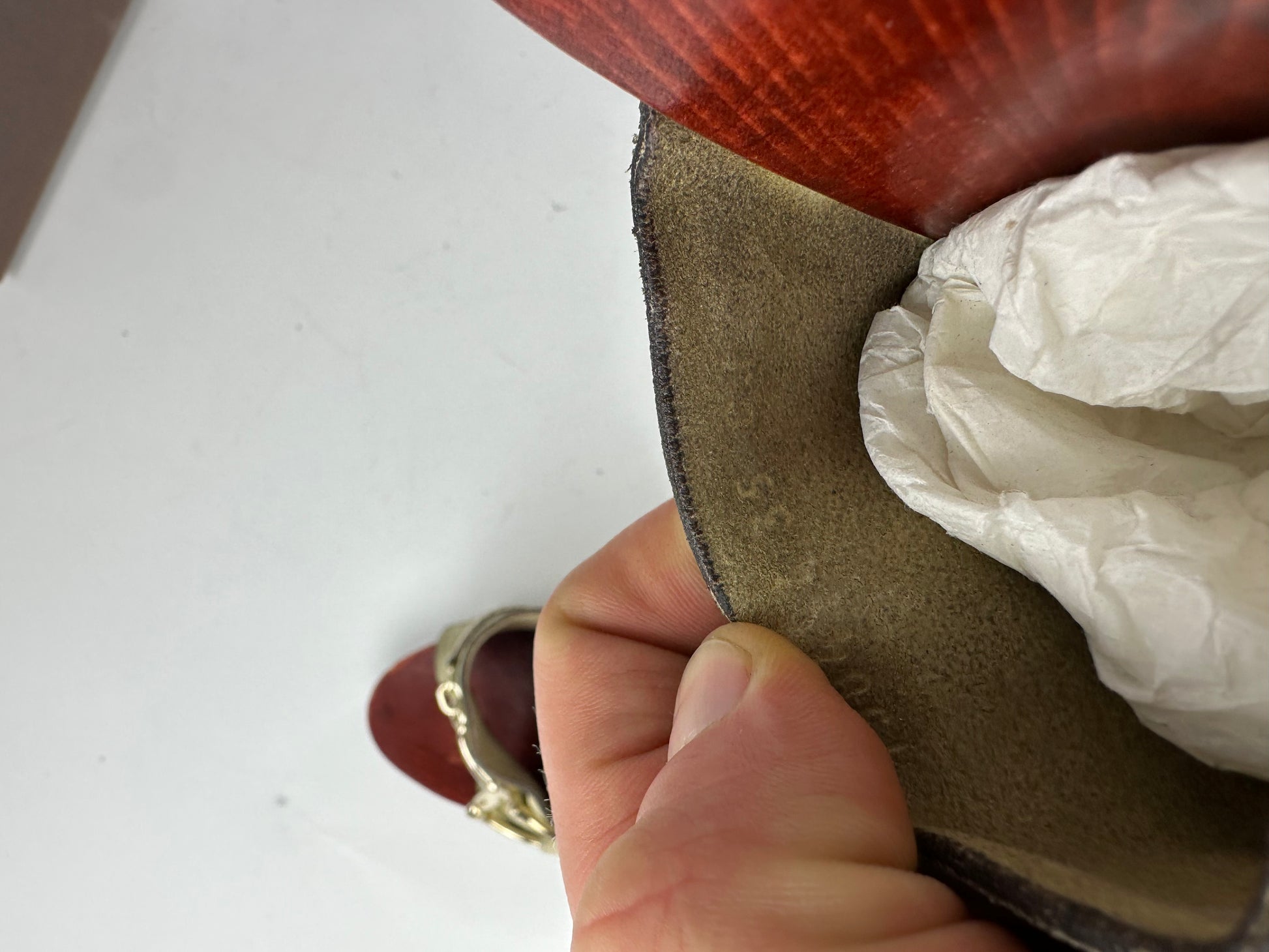 Condition Details: The wood and suede are clean and well preserved with light signs of wear. The hardware remains bright with minor surface scratches. The soles show gentle signs of use.