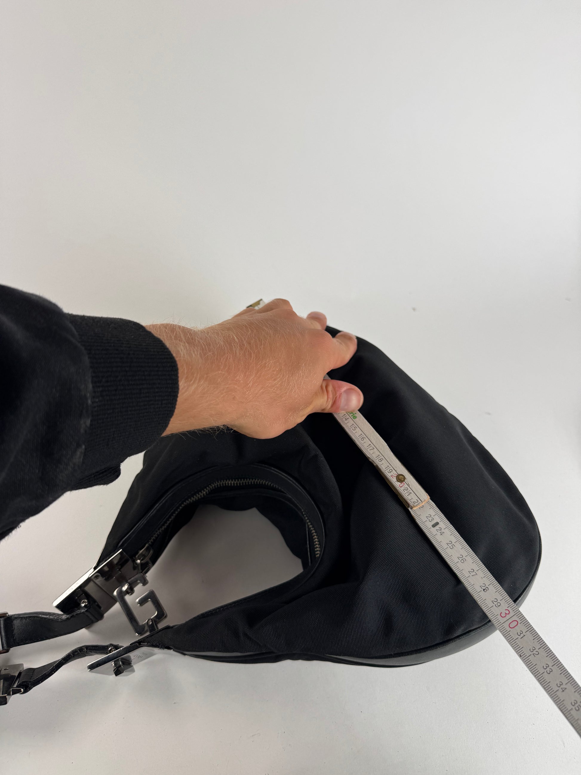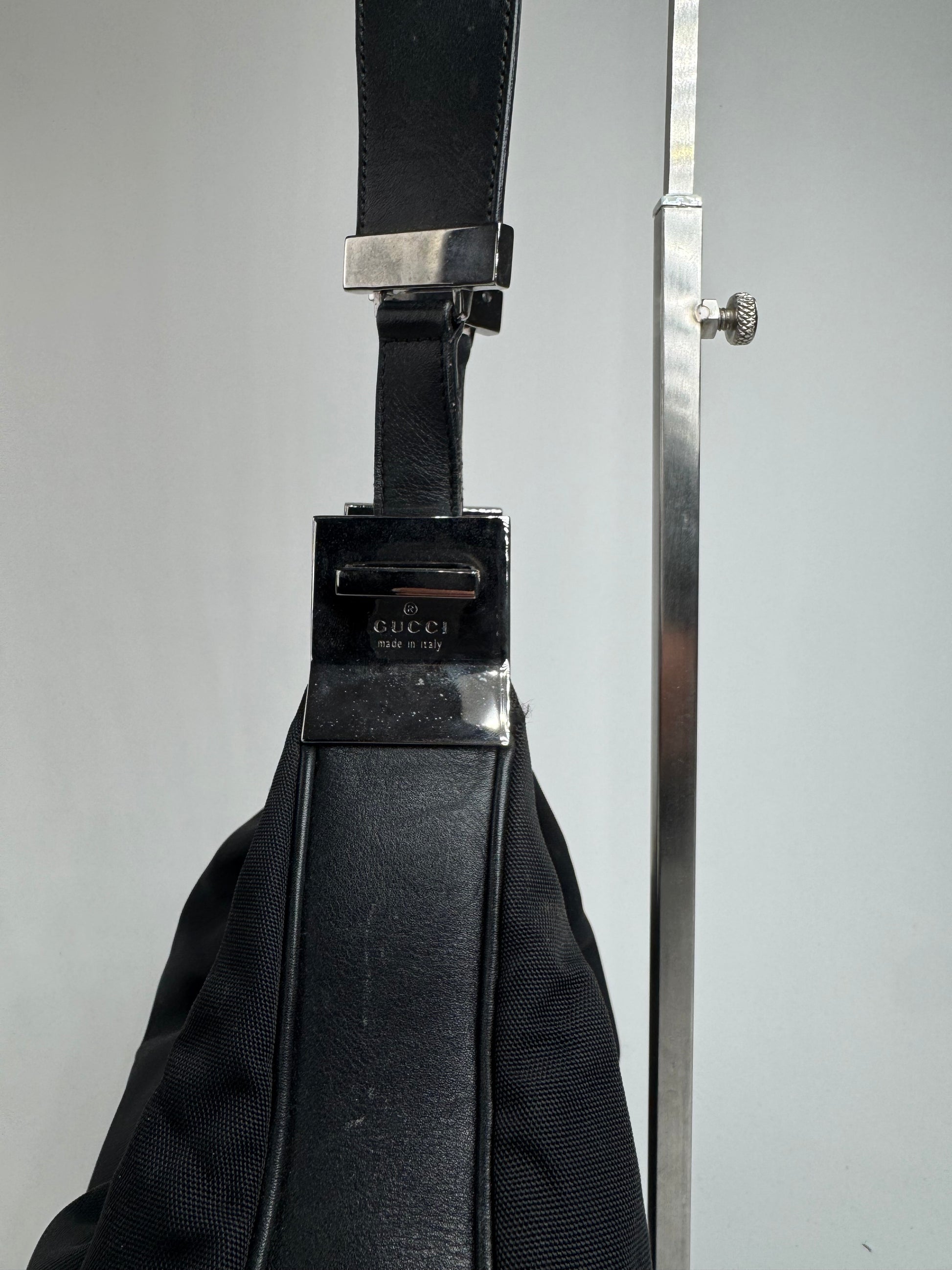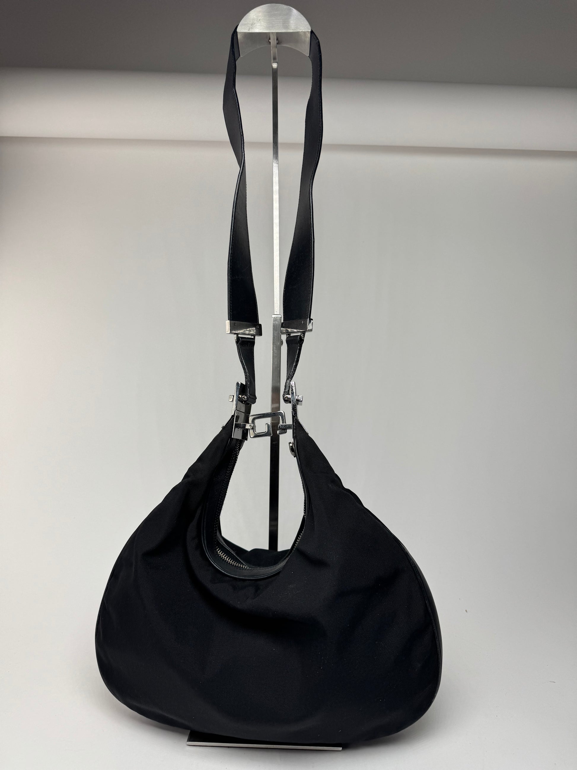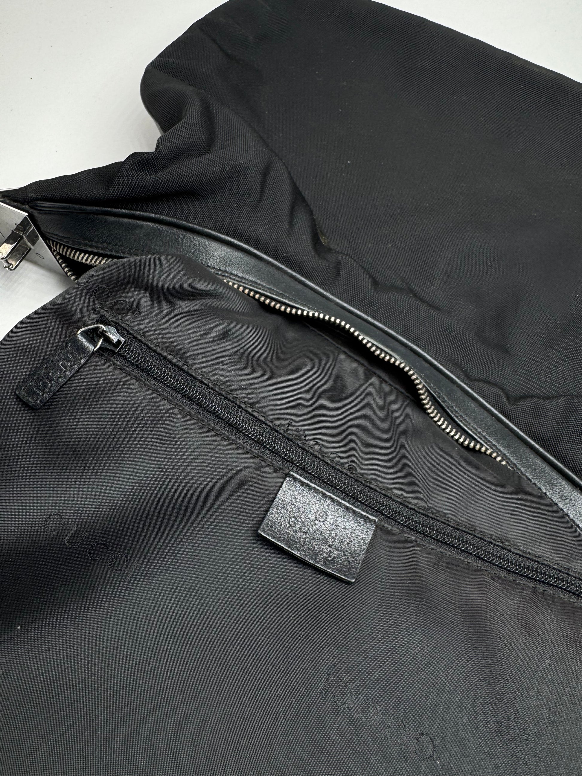 Ce sac à main chic est finement confectionné en toile noire rehaussée de détails en cuir noir. Conçu à l'époque de Tom Ford, il est doté d'un fermoir unique en forme de G en acier argenté qui permet de le porter à l'épaule ou de l'attacher à un sac à main élégant. La bandoulière est en cuir noir. L'intérieur est doublé de polyester noir orné du logo Gucci.