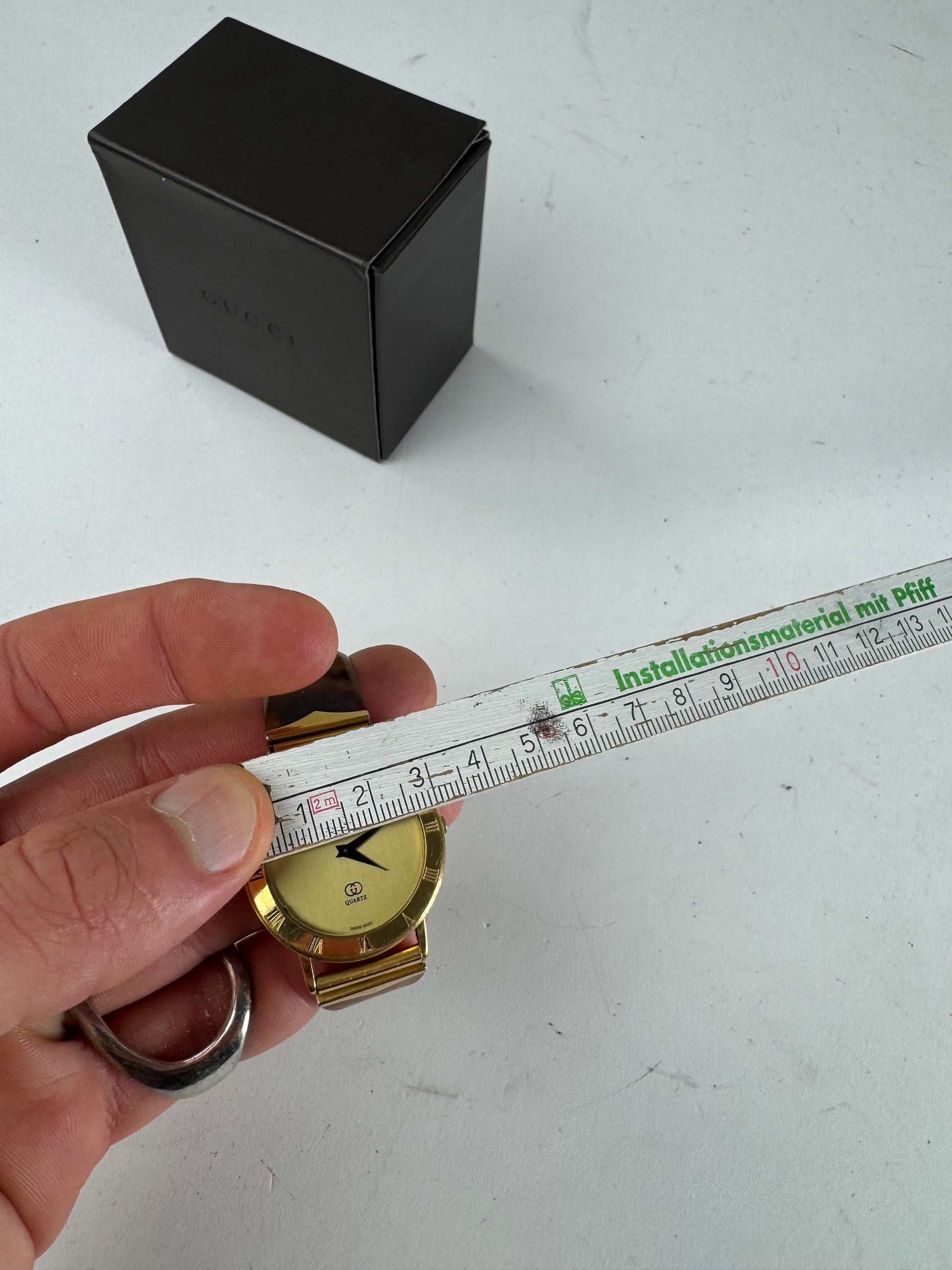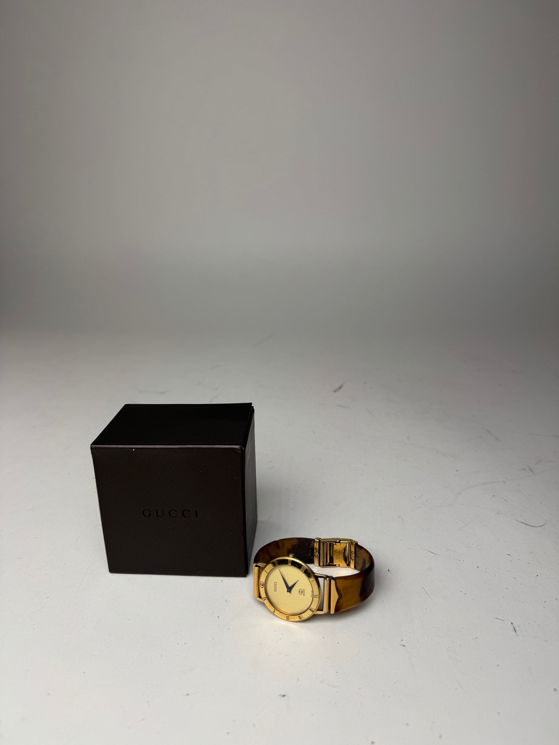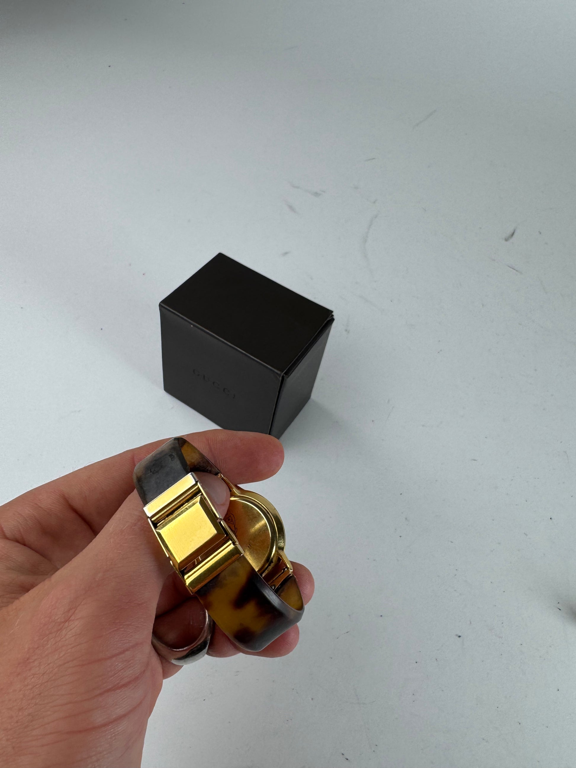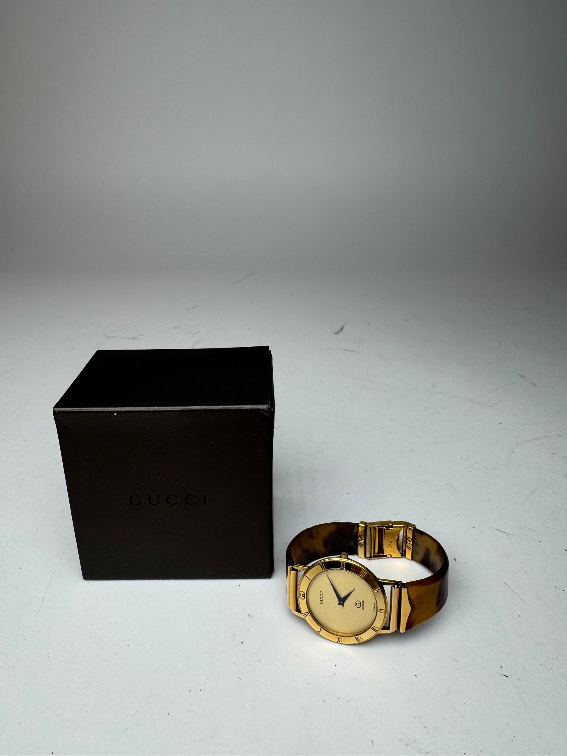 This striking vintage watch is finely crafted with a gold-tone steel case and features a golden dial with matching gold hands. The bracelet is made of brown hard plastic with an eye-catching leopard pattern, complemented by a gold-tone steel clasp. A true reflection of Gucci’s bold yet elegant design heritage, this piece blends classic sophistication with a touch of playful luxury.