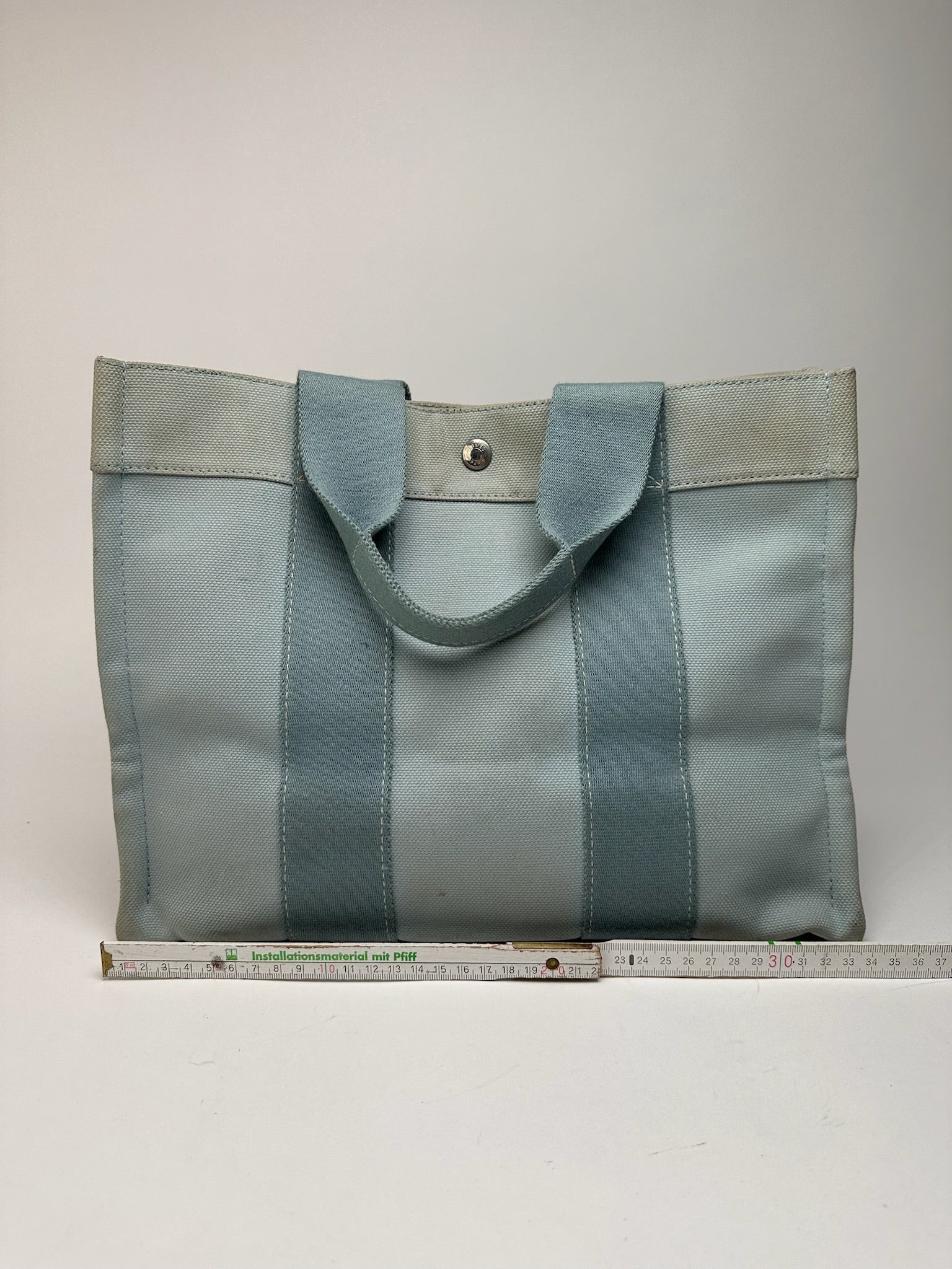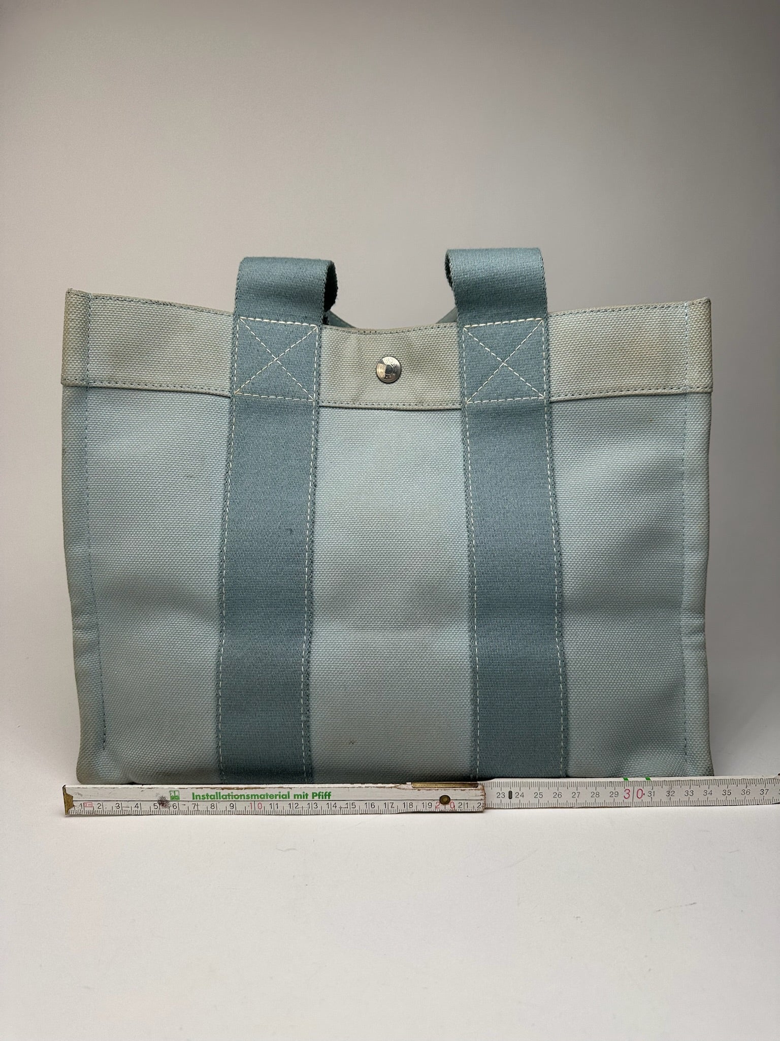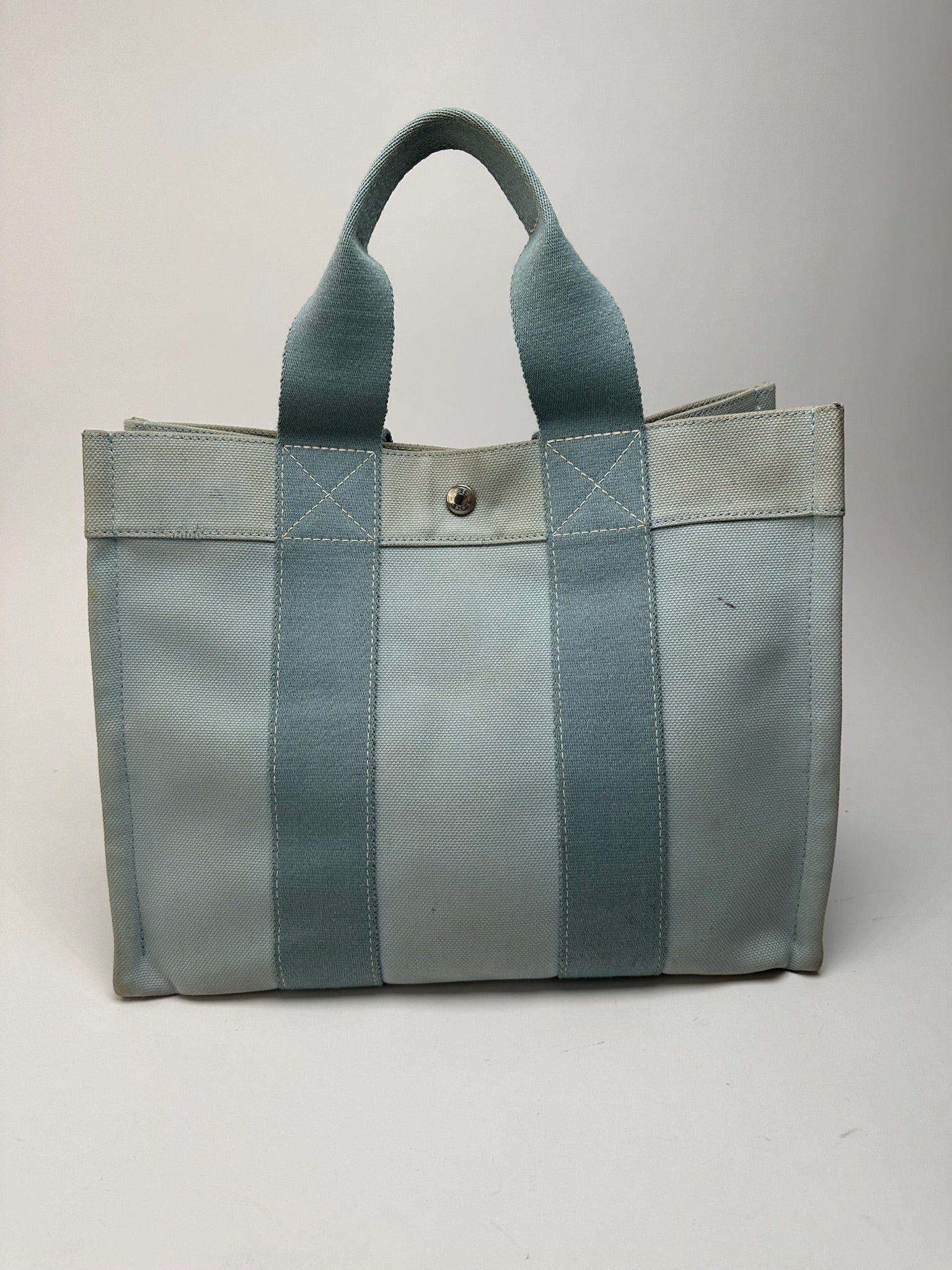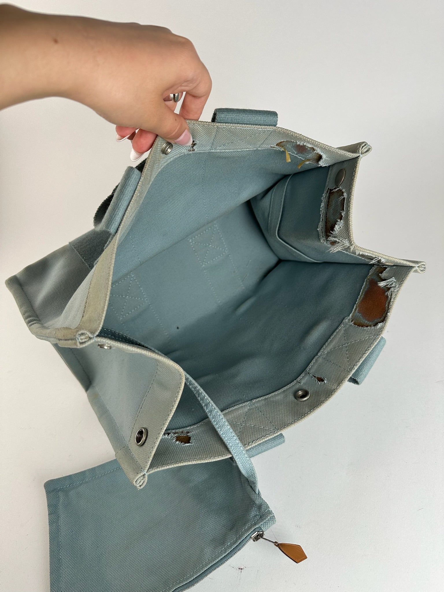 Sac cabas HERMÈS Vintage en toile bleu clair. Ce cabas vintage décontracté est confectionné en 100 % toile bleu clair avec des poignées et des finitions turquoise. Il est doté d'accessoires en acier argenté et d'une petite pochette amovible attachée à une bandoulière intérieure. Fabriqué en France, ce modèle spacieux et fonctionnel reflète l'élégance discrète et le savoir-faire d'Hermès.