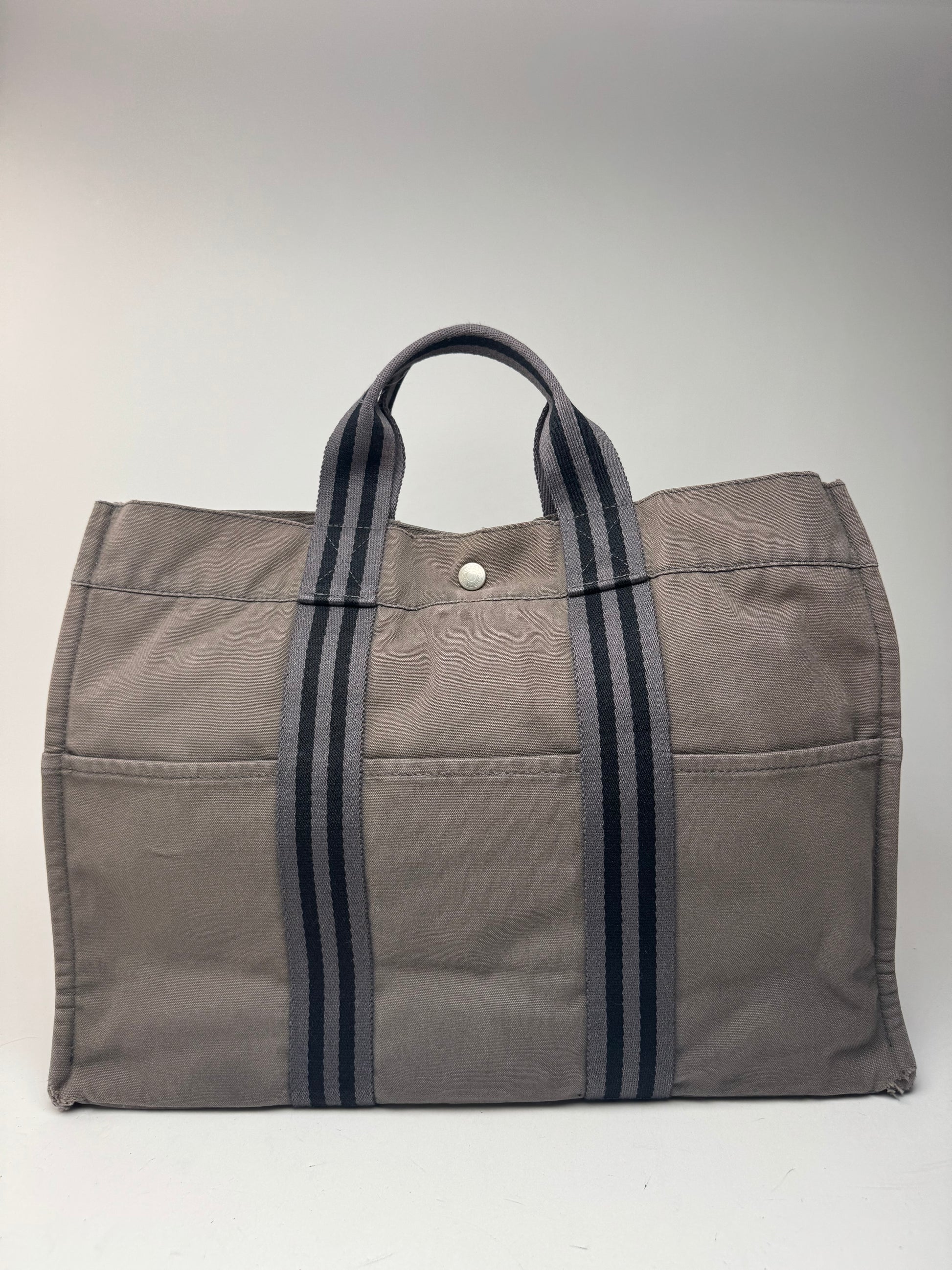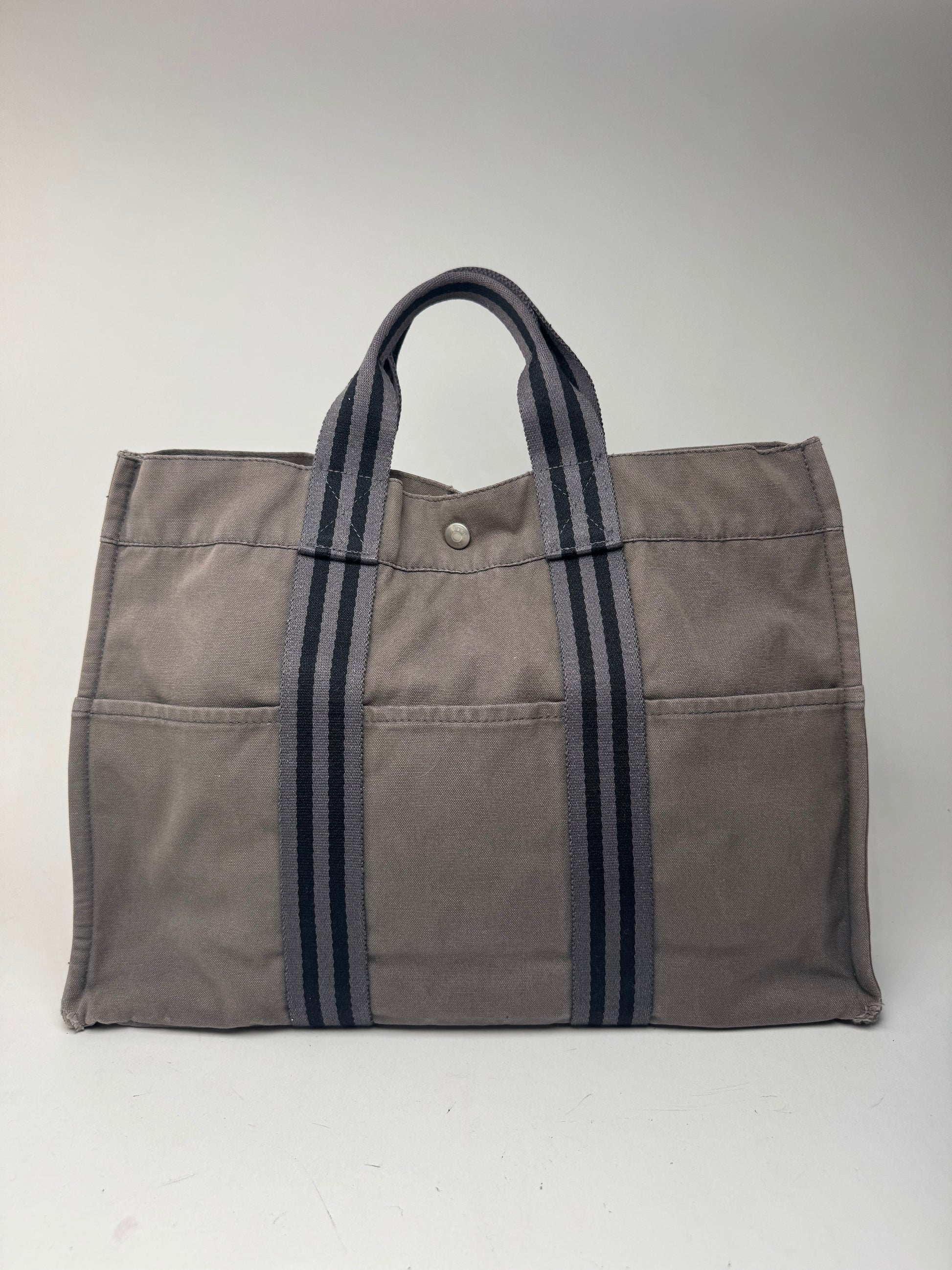 Ce sac fourre-tout élégant est confectionné avec soin en toile grise 100 % coton. Il est doté de deux poignées rayées grises et noires et d'une fermeture à boutons-pression, avec un bouton-pression central et deux boutons-pression latéraux pour une fermeture sécurisée.