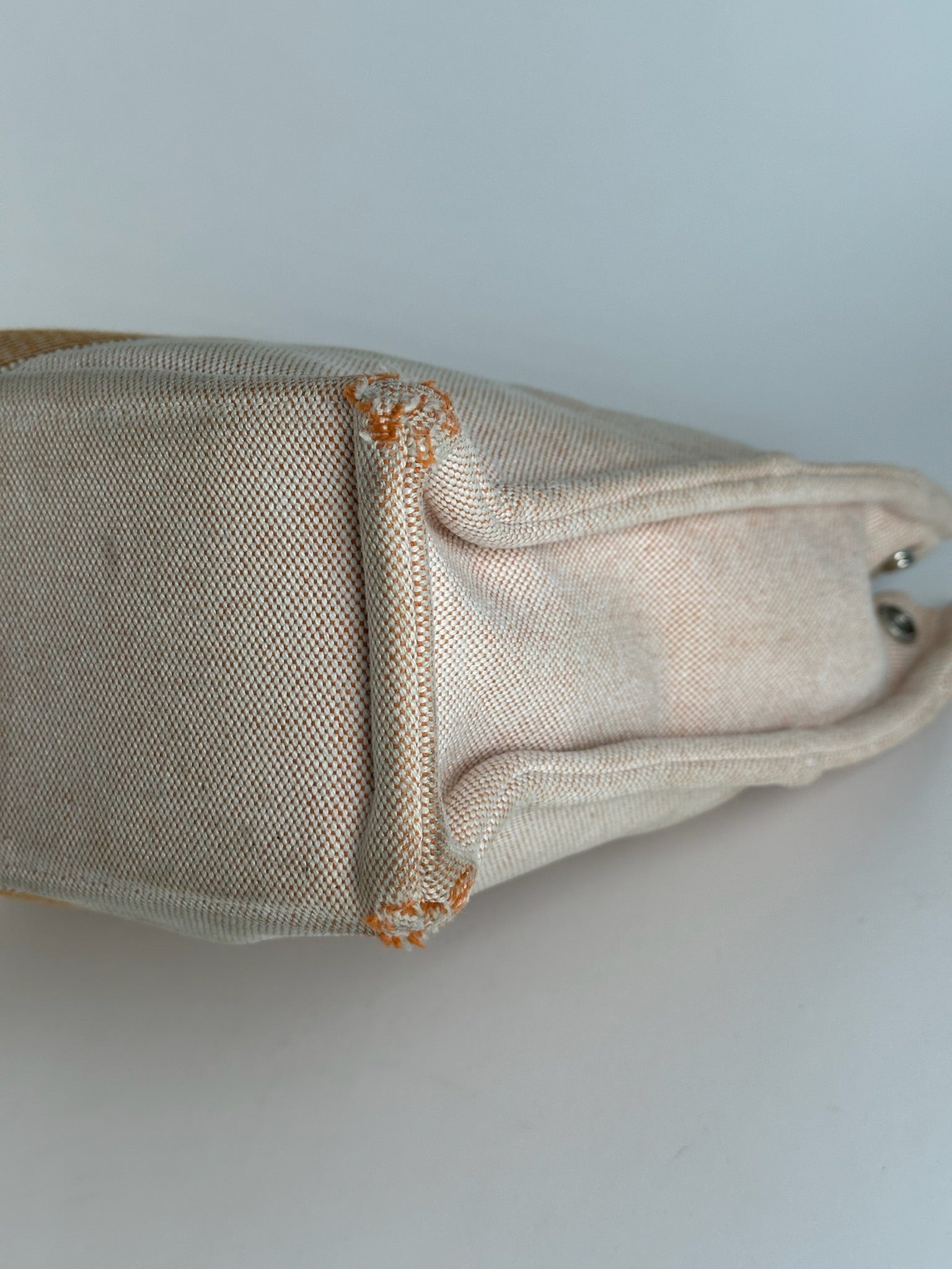 Cabas Hermès Vintage Hopper. Ce cabas fonctionnel est finement confectionné en toile beige 100 % et doté de deux anses supérieures en toile rayée beige-orange signature. Orné de détails en acier argenté, il offre une silhouette spacieuse idéale au quotidien.