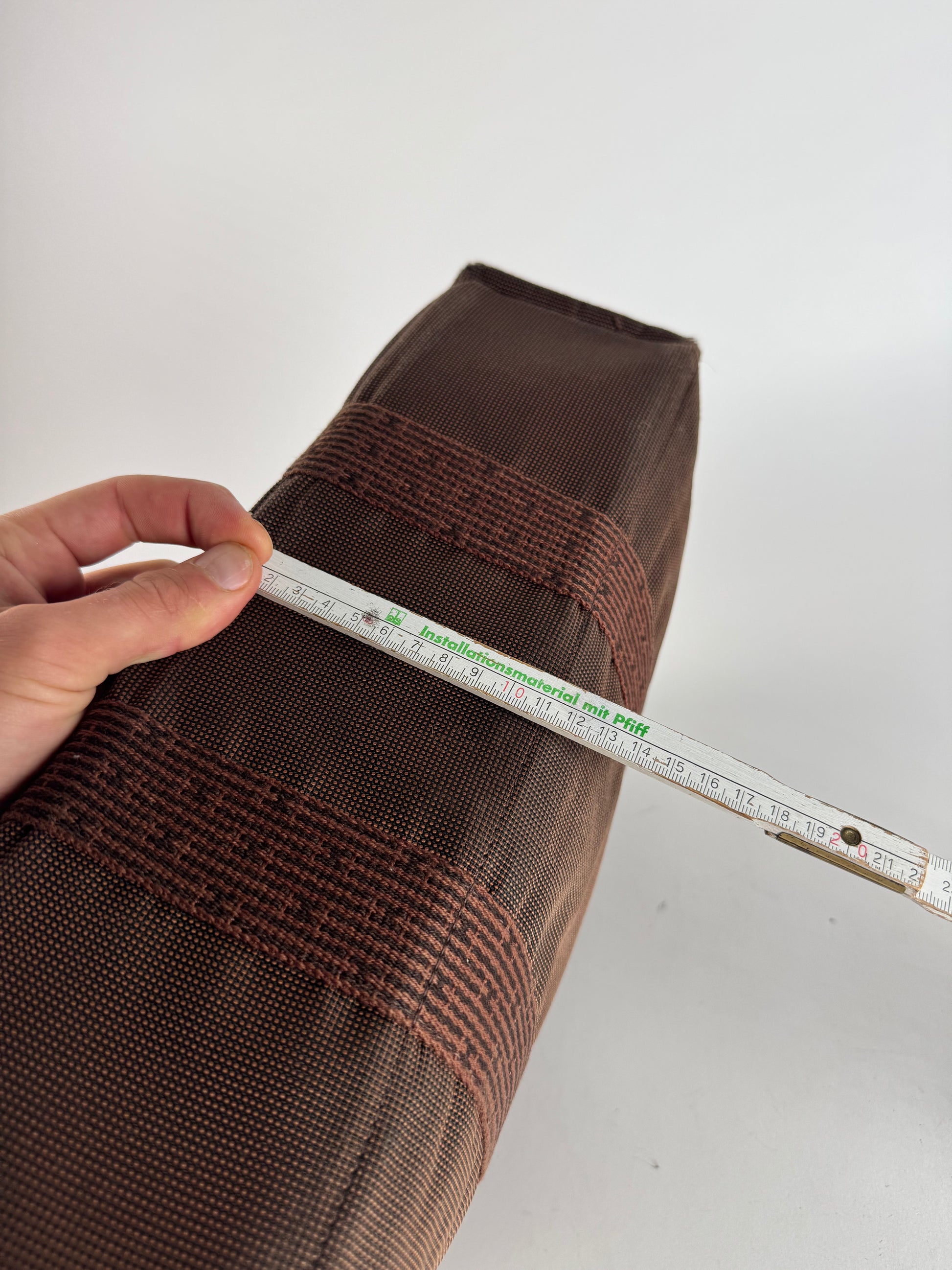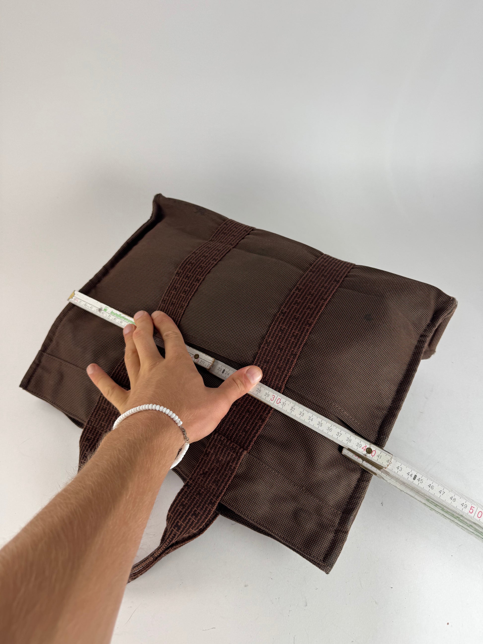 Ce sac à main vintage sophistiqué est finement confectionné en tissu marron à motifs, composé à 69 % de polyamide et à 31 % de polyester. Il est doté d'anses marron assorties, ornées de motifs Hermès H gris. Le dessus est fermé par une fermeture éclair et trois boutons-pression.