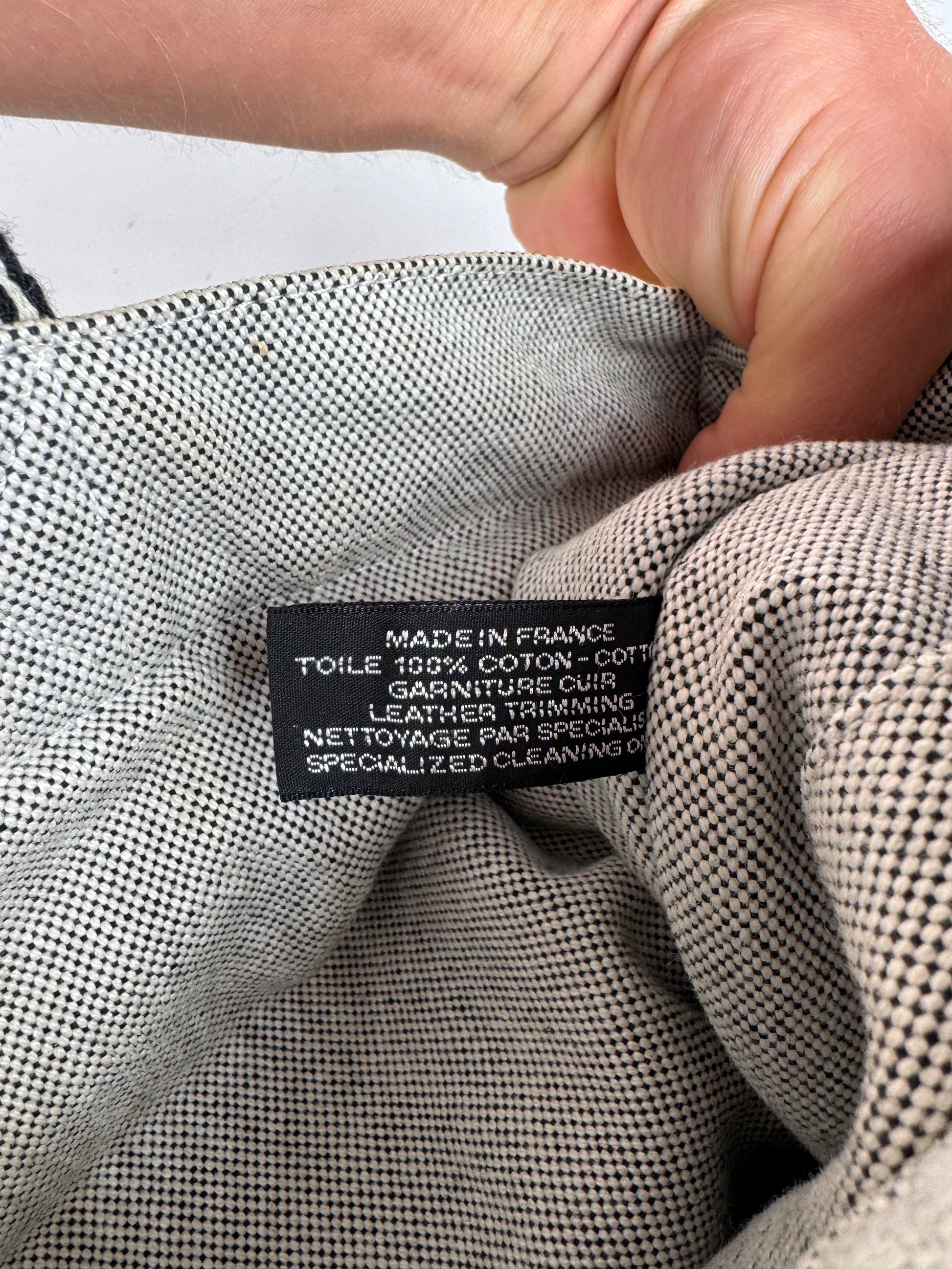 État : La toile extérieure en coton est en très bon état, avec des taches et une légère usure aux coins. Les poignées sont solides et propres. La quincaillerie argentée est brillante et présente de légères rayures superficielles.