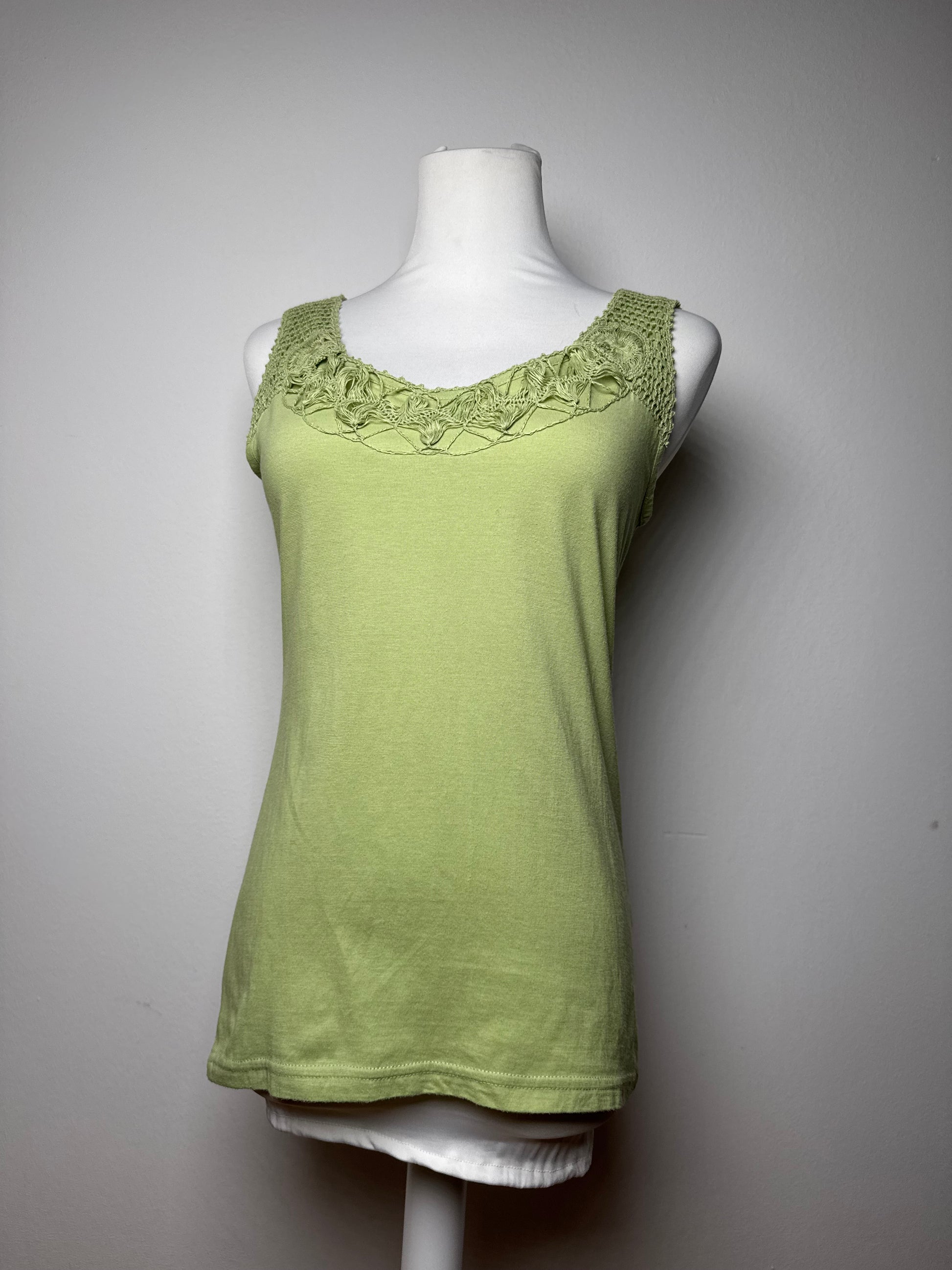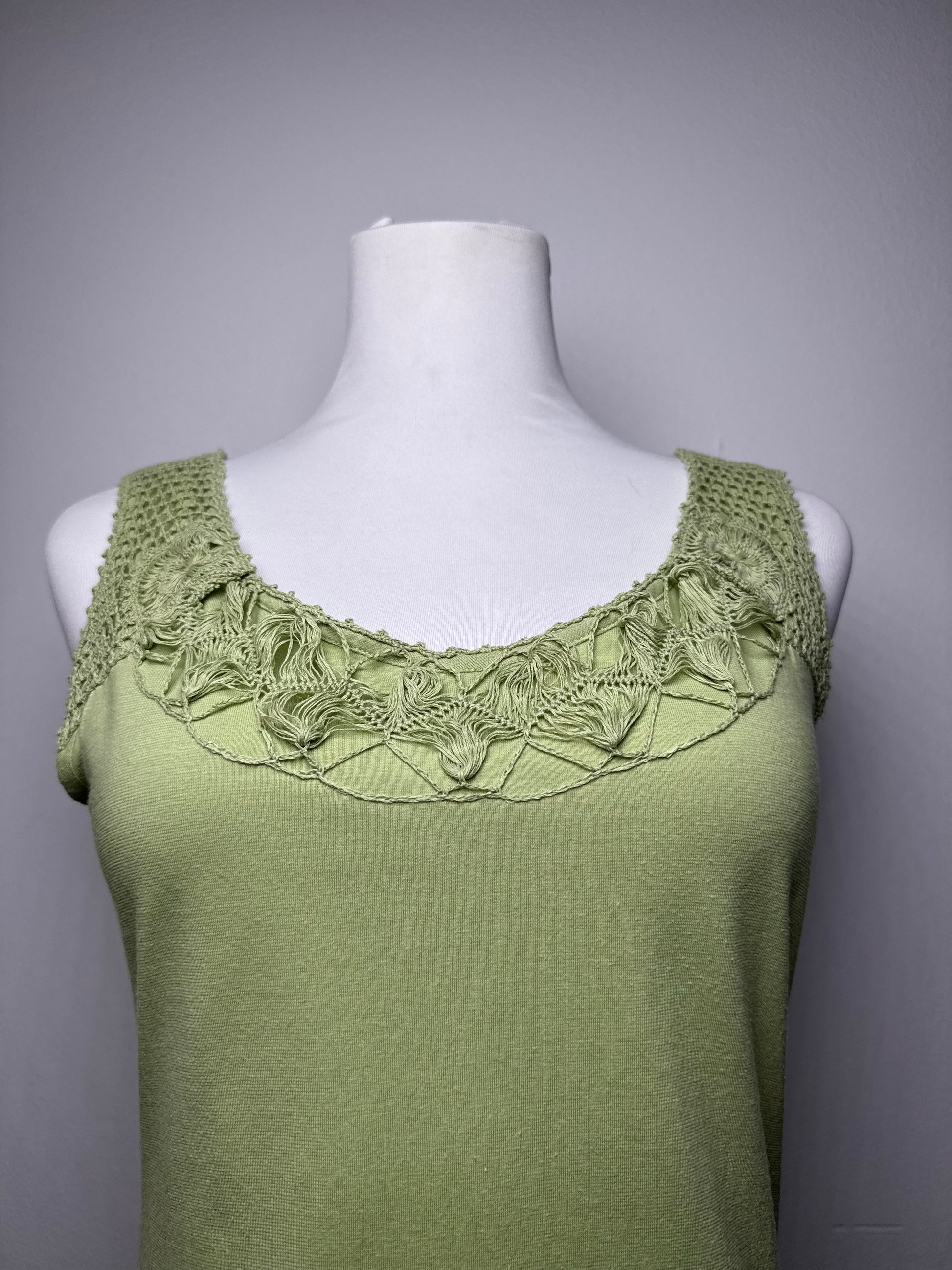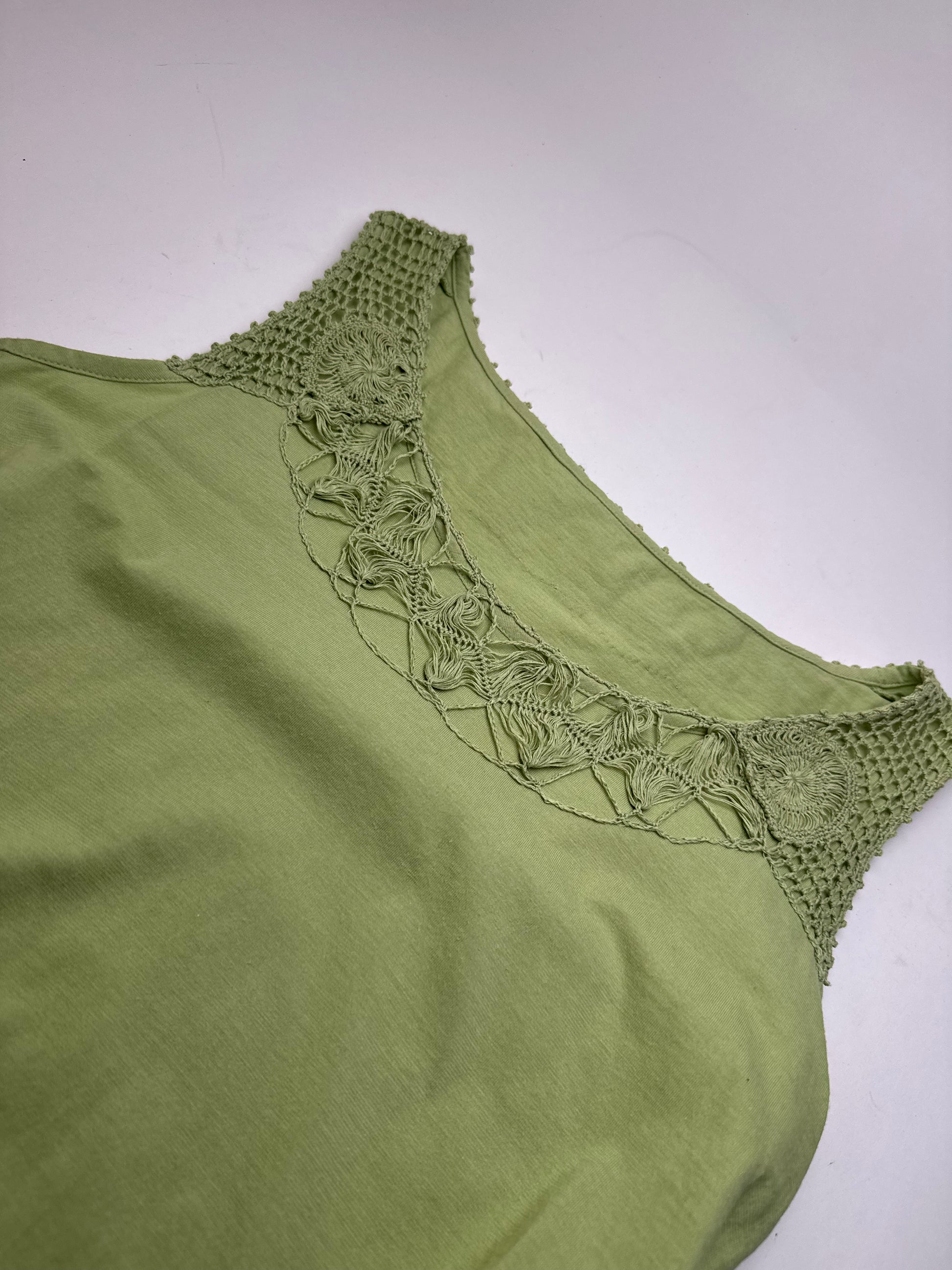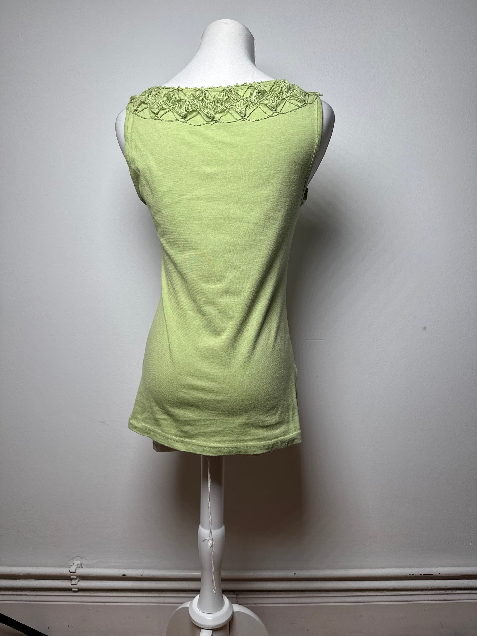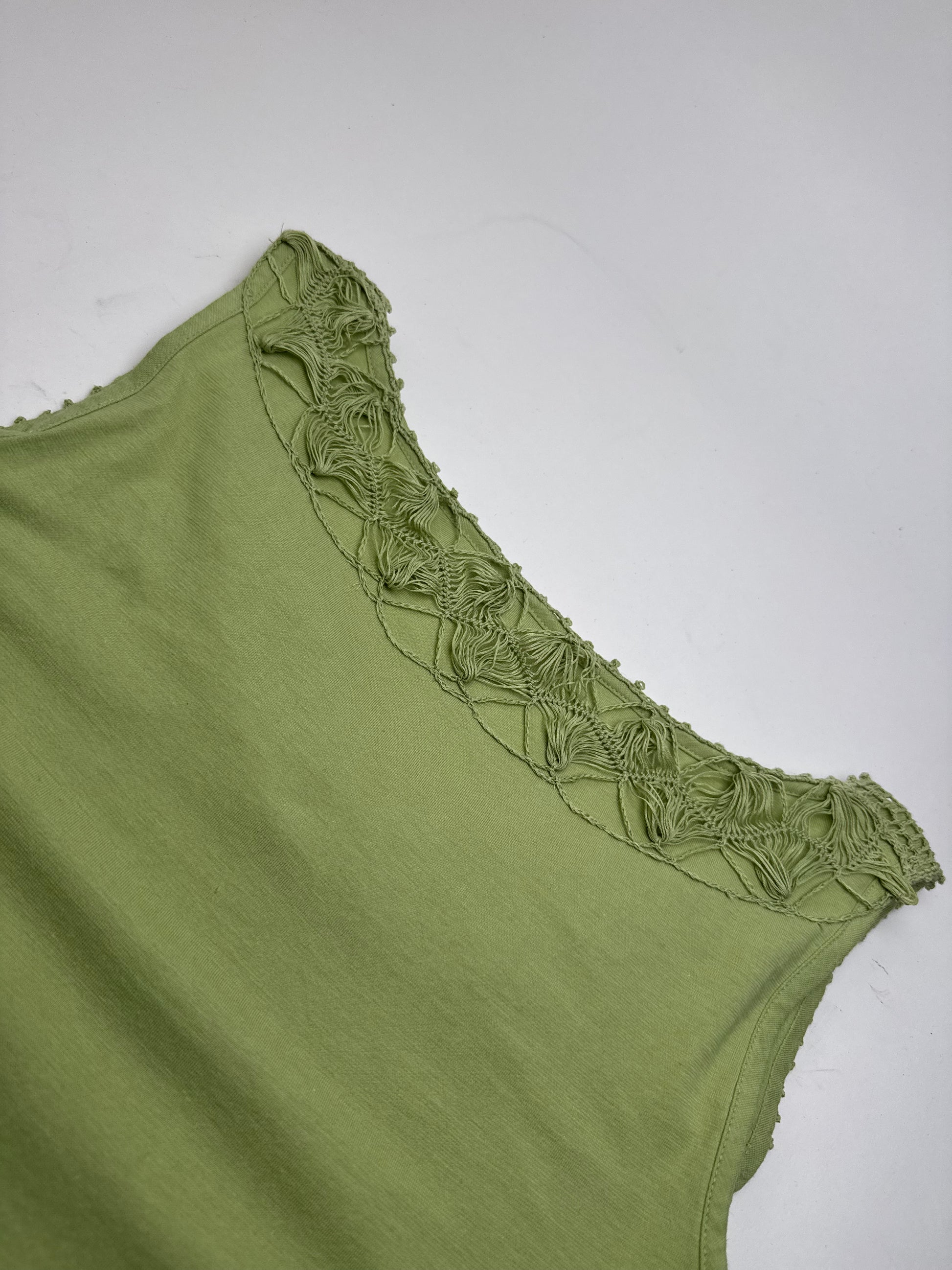 Débardeur vintage en toile verte ISSEY MIYAKE. Cette pièce vintage unique des années 1990 est finement confectionnée en toile 100 % coton d'un rouge vif. Elle présente une coupe débardeur ornée de franges et d'applications façon filet. Connu pour son approche innovante des textiles et ses silhouettes sculpturales, Issey Miyake est une figure emblématique de la mode avant-gardiste depuis les années 1970. Le mannequin sur la photo porte une taille 38/M.