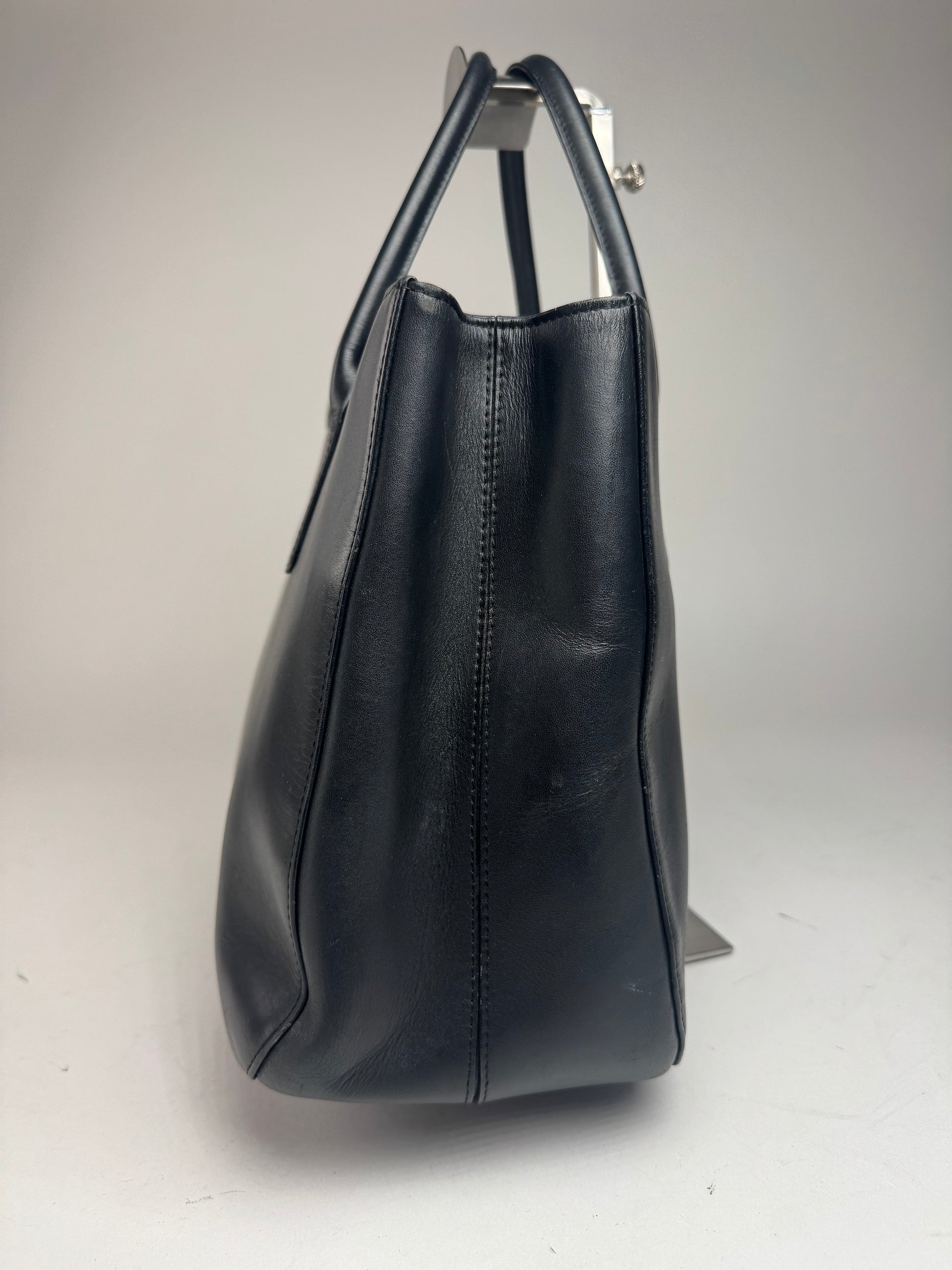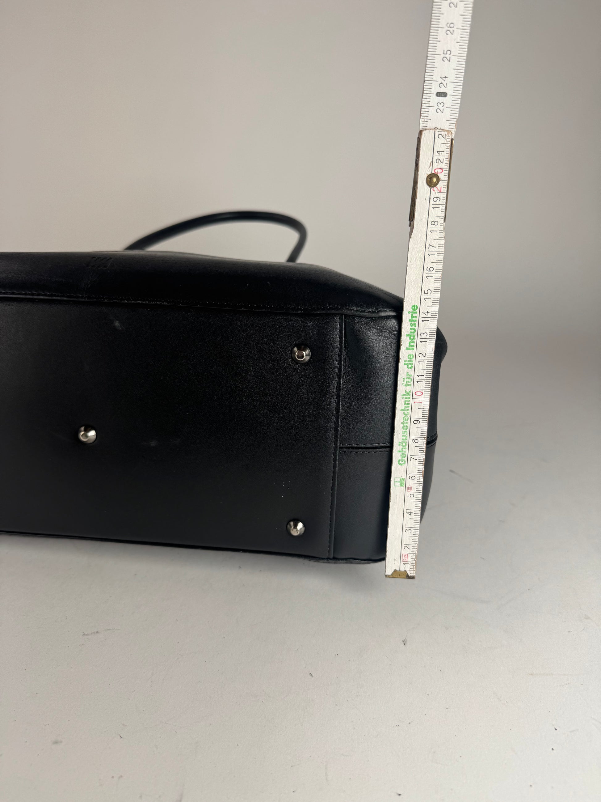 Ce sac à main chic est finement confectionné en cuir noir. Il est doté de deux anses mi-longues, d'une finition en acier argenté et d'un intérieur spacieux doublé de toile noire, divisé en trois compartiments.