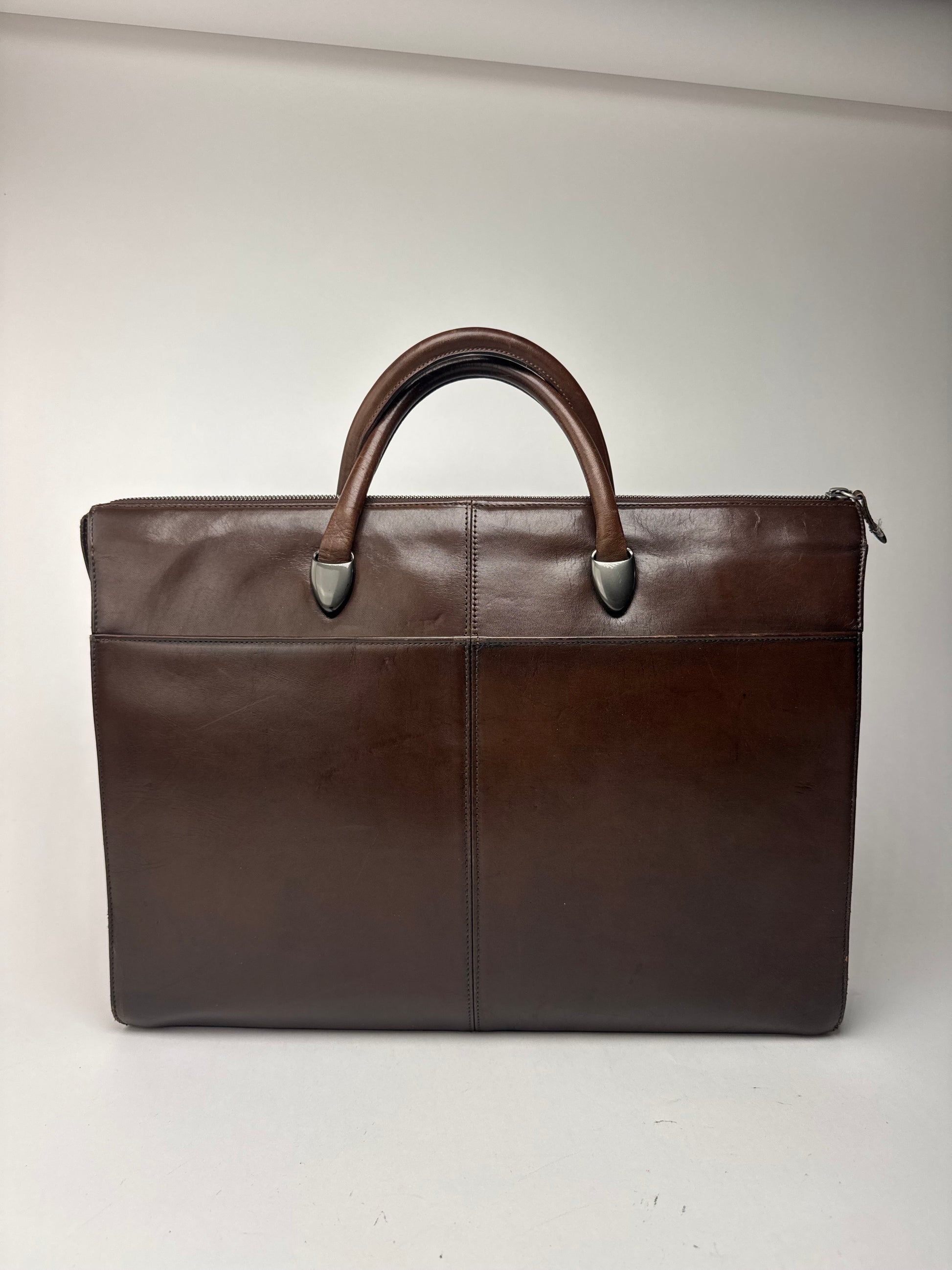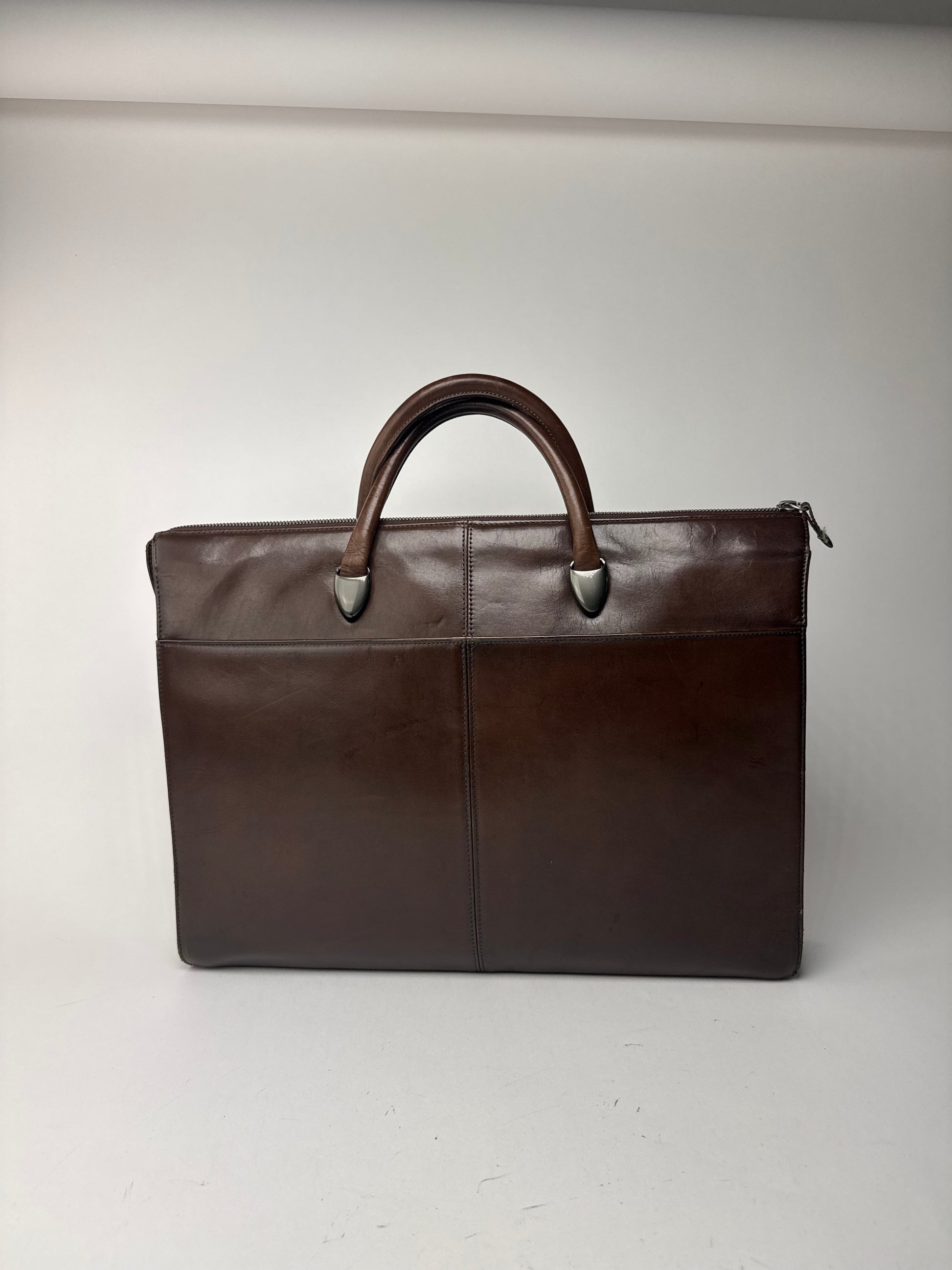 État : Le cuir extérieur est propre et brillant, avec seulement quelques rayures superficielles. Les poignées sont solides et bien formées. La quincaillerie est brillante et présente une légère usure. La doublure intérieure en toile marron est propre et bien entretenue.