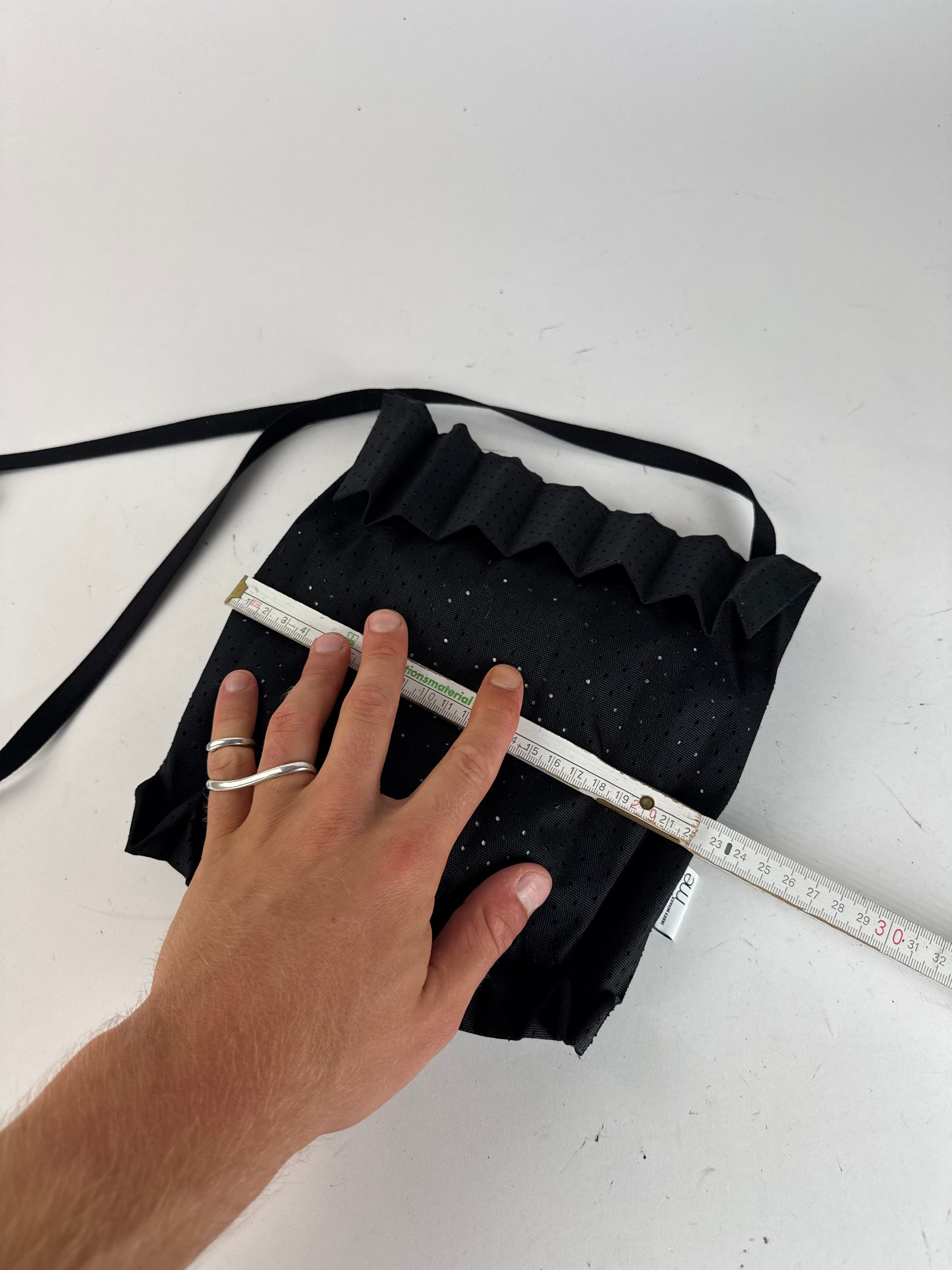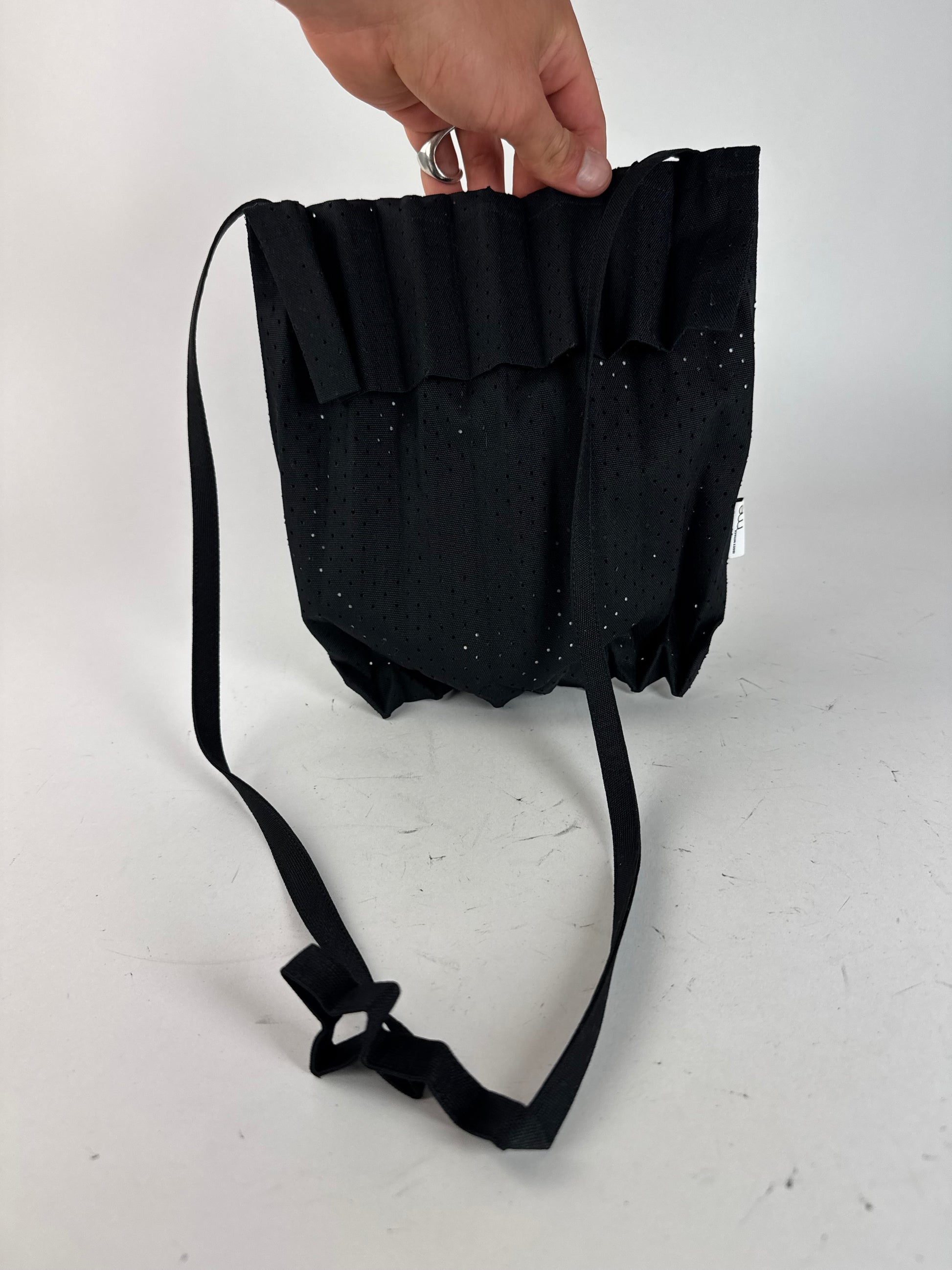 Ce sac bandoulière chic est confectionné en toile noire plissée, avec des perforations intentionnelles et une structure pliable, caractéristiques du design innovant et sculptural d'Issey Miyake. La ligne ME , une collection de diffusion d'Issey Miyake, a été créée pour explorer des textures expérimentales et des formes architecturales dans des pièces du quotidien. Unisexe, ce sac est doté d'une bandoulière fixe sans fermoir.