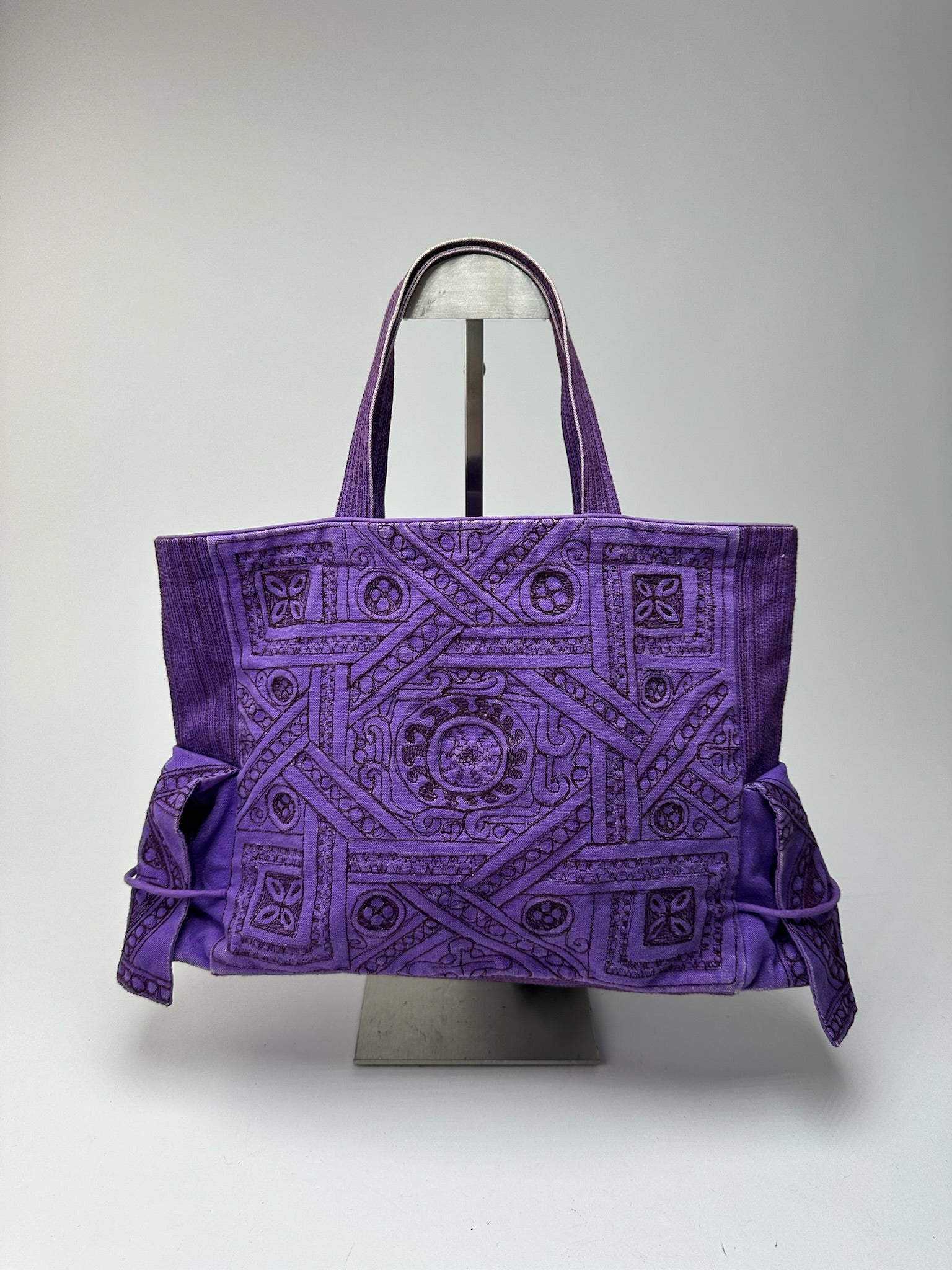 Sac bandoulière vintage en toile à motifs Issey Miyake / TAMASHA. Ce sac unique est finement confectionné en toile à motifs lilas. Tamasha était une marque japonaise réputée pour ses sacs au design architectural et avant-gardiste, étroitement associée à l'esprit d'Issey Miyake des années 1980 et 1990. Ce sac bandoulière est doté de deux petites poches latérales extérieures à fermeture élastique et d'un dessus ouvert. L'intérieur est doublé d'une toile imitation lin.