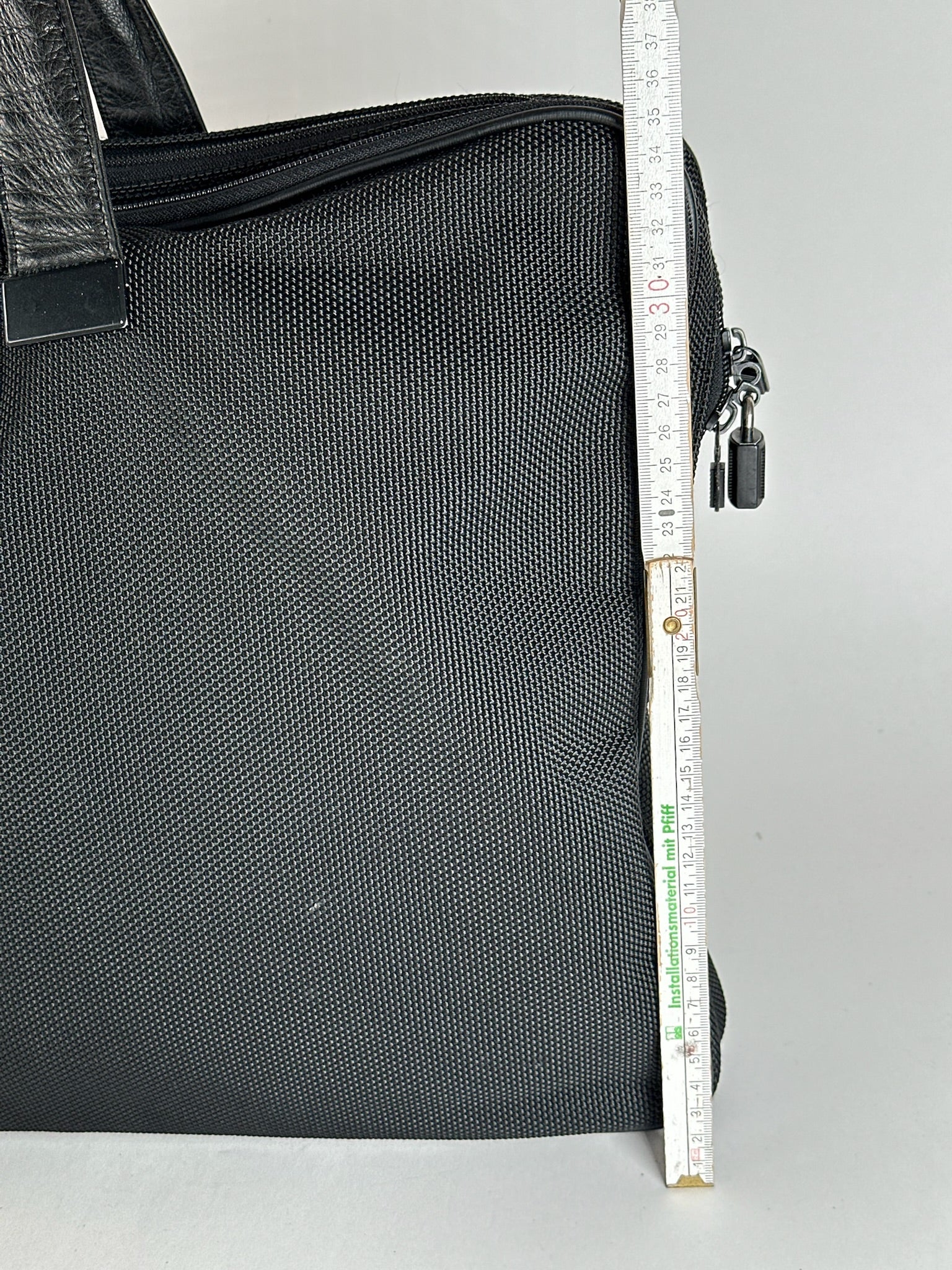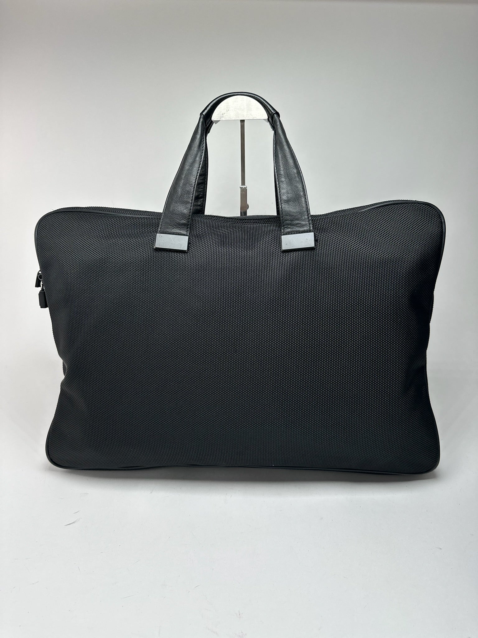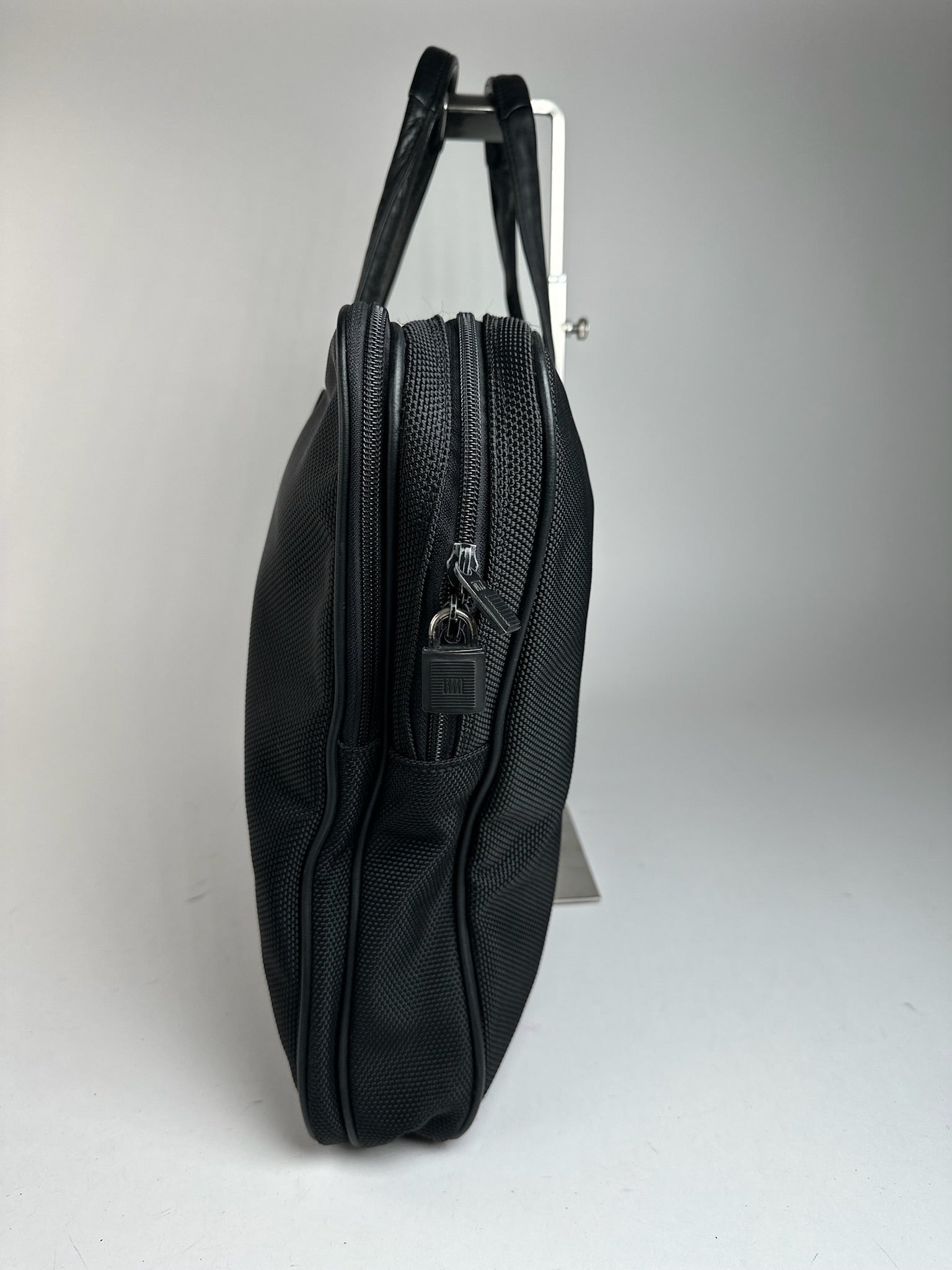 État : L'extérieur en cuir vegan et la toile sont propres et en excellent état. La doublure intérieure en polyester est propre et bien entretenue, avec de légères traces d'utilisation. La quincaillerie en acier argenté est brillante et présente une légère usure superficielle.