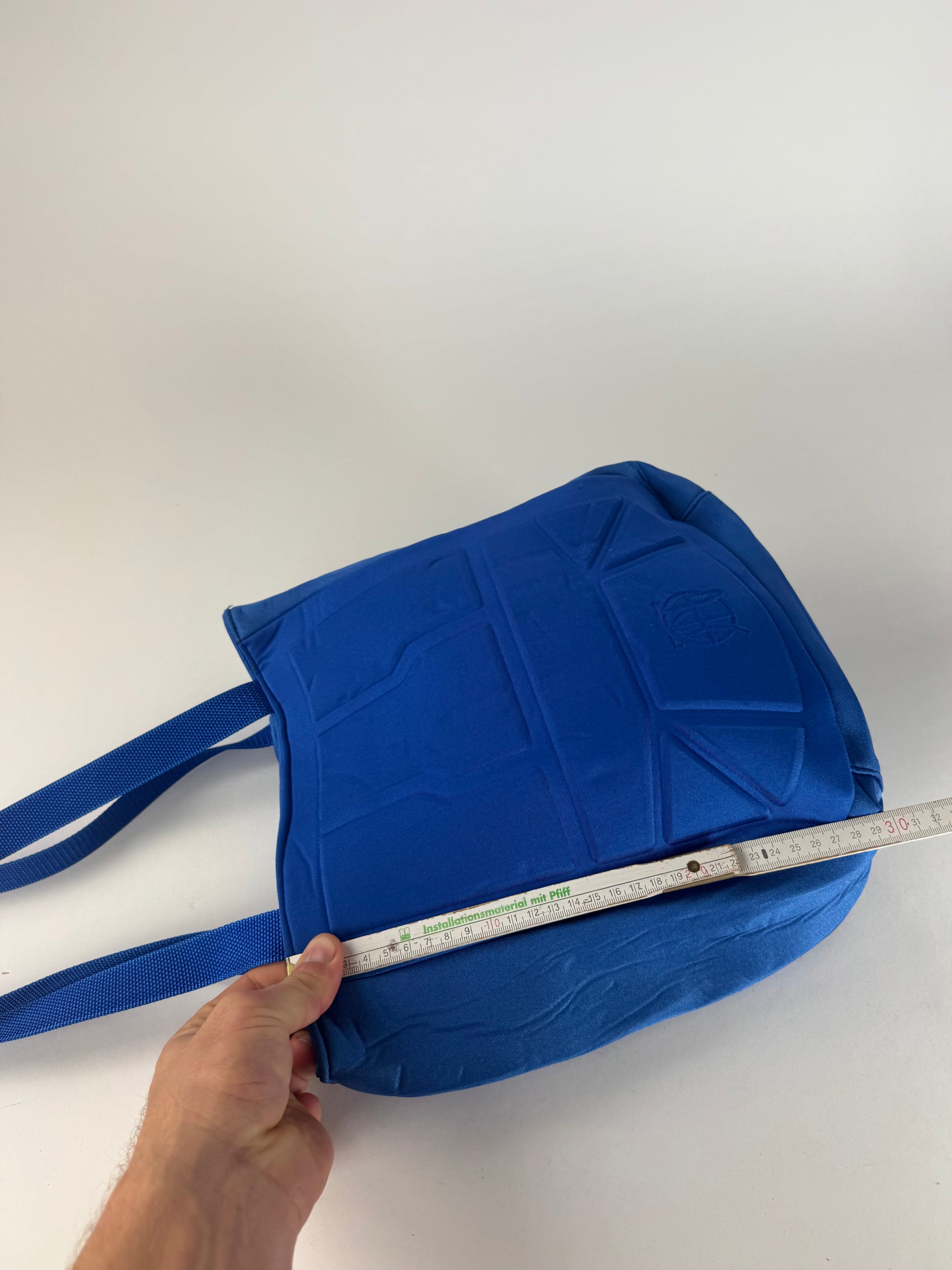 JEAN PAUL GAULTIER Vintage Handbag. This sculptural vintage handbag is crafted from blue polyester and features the embossed JPG logo on the front. Designed in a backpack-inspired silhouette, the form subtly references the male body, reflecting Jean Paul Gaultier’s avant-garde approach to fashion and his recurring exploration of the human figure as a design element. The bag is finished with blue canvas handles and opens to a black polyester interior with three compartments: one with a zipper closure and two with magnetic closures.