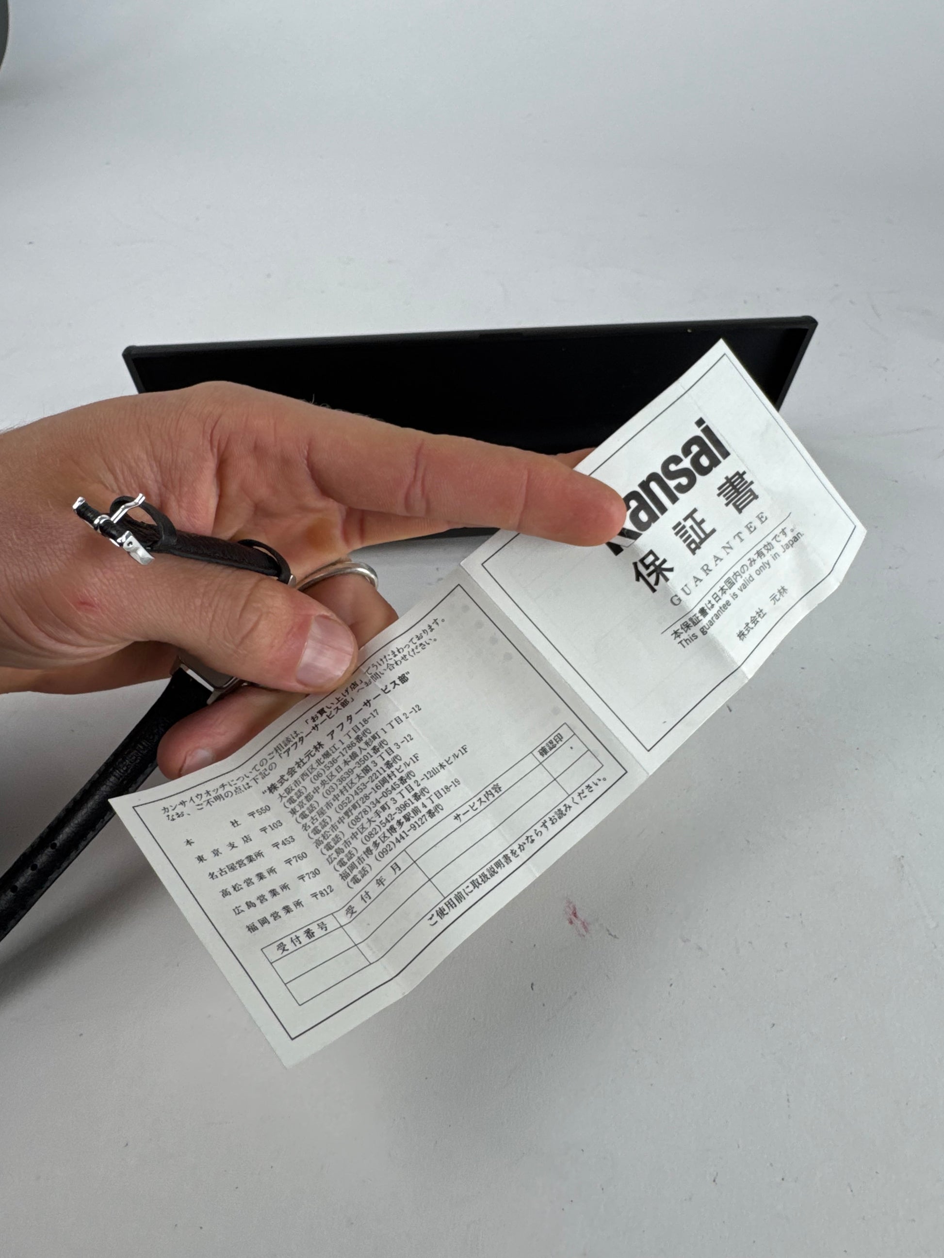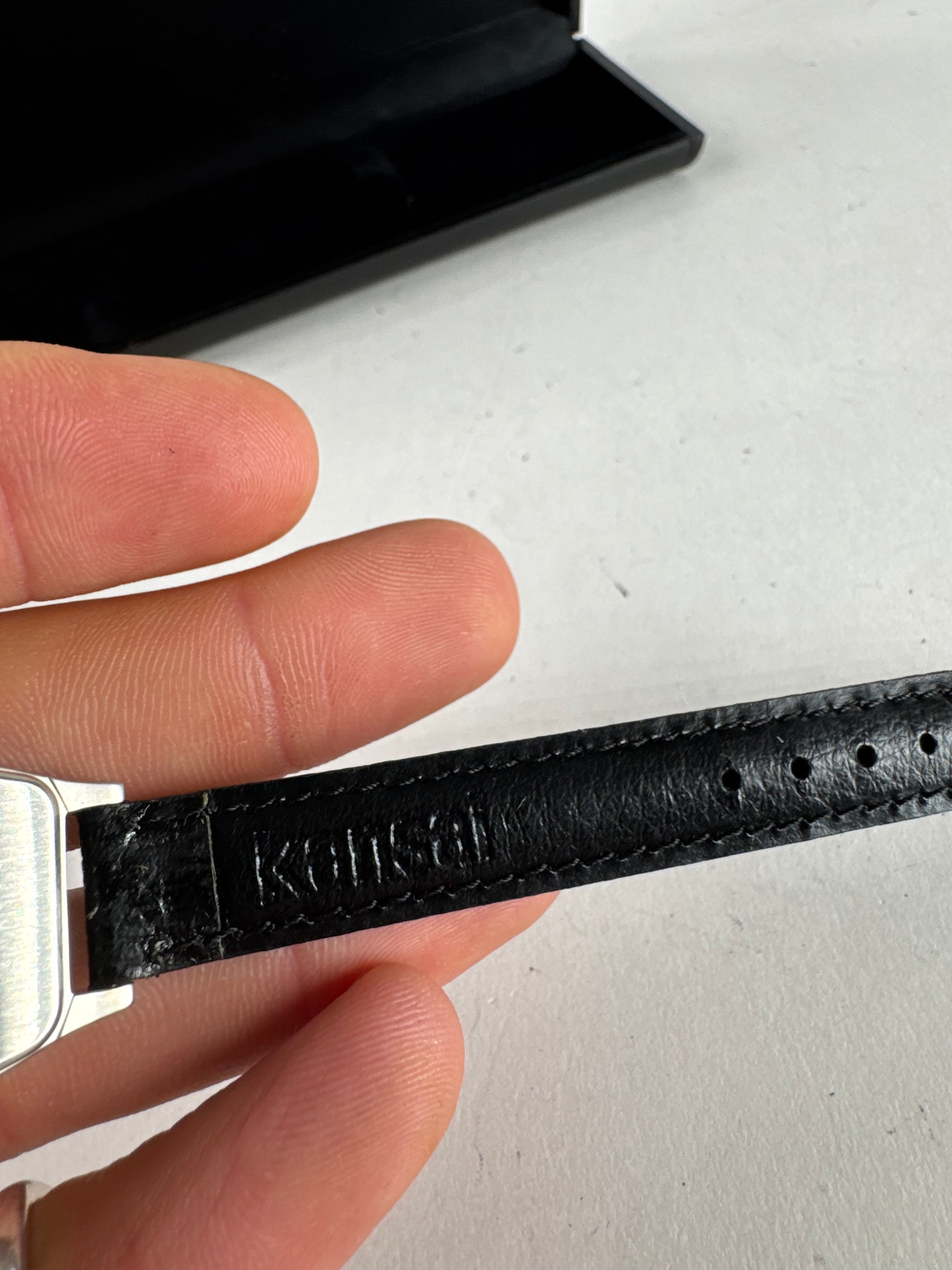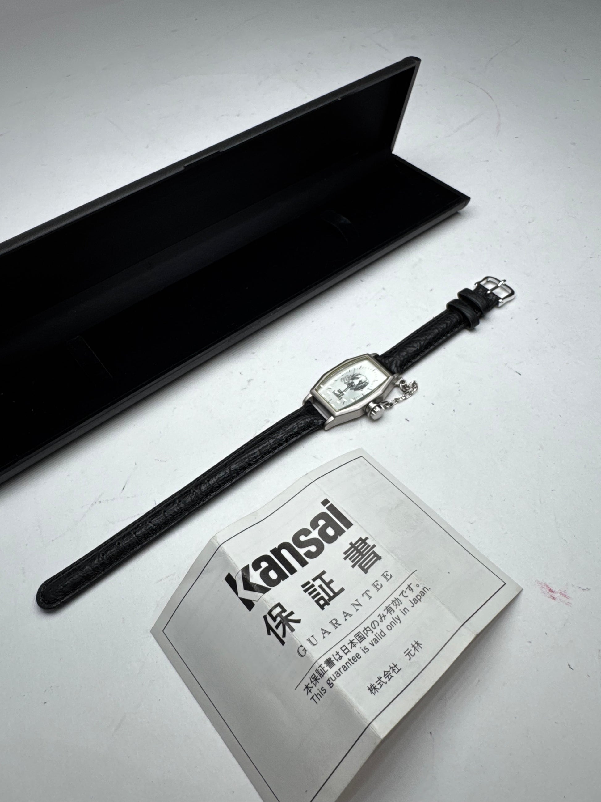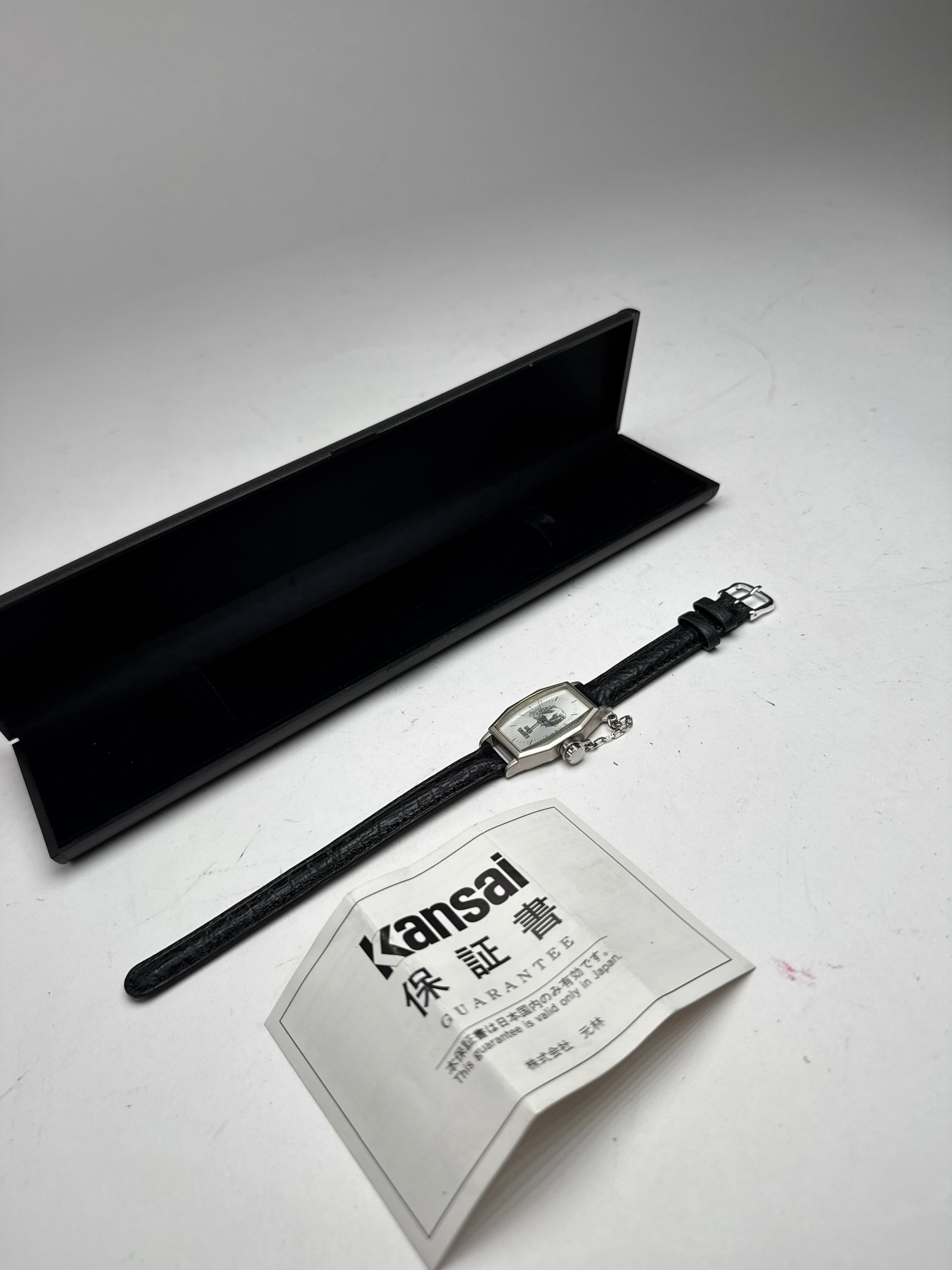 Cette élégante montre vintage de Kansai Yamamoto est dotée d'un bracelet en cuir noir embossé crocodile et d'un boîtier en acier inoxydable argenté. Comme neuve, elle est équipée d'un mouvement à quartz et d'une pile récemment remplacée. Elle est livrée avec sa boîte d'origine et sa carte de garantie. Le cadran blanc est orné d'un chien, ajoutant une touche unique à son design. Fabriquée au Japon, elle mesure 2 cm de large et 3 cm de haut.