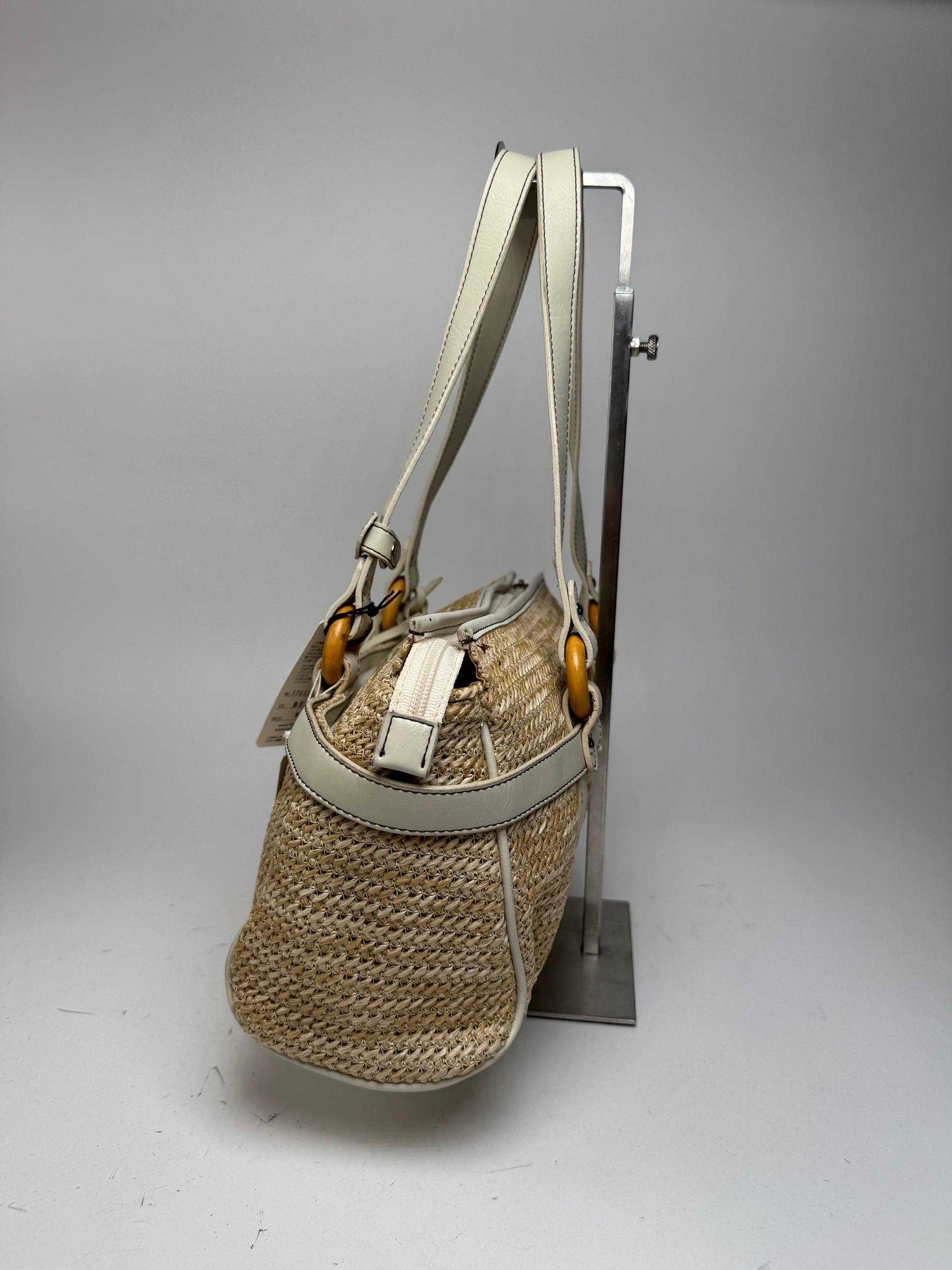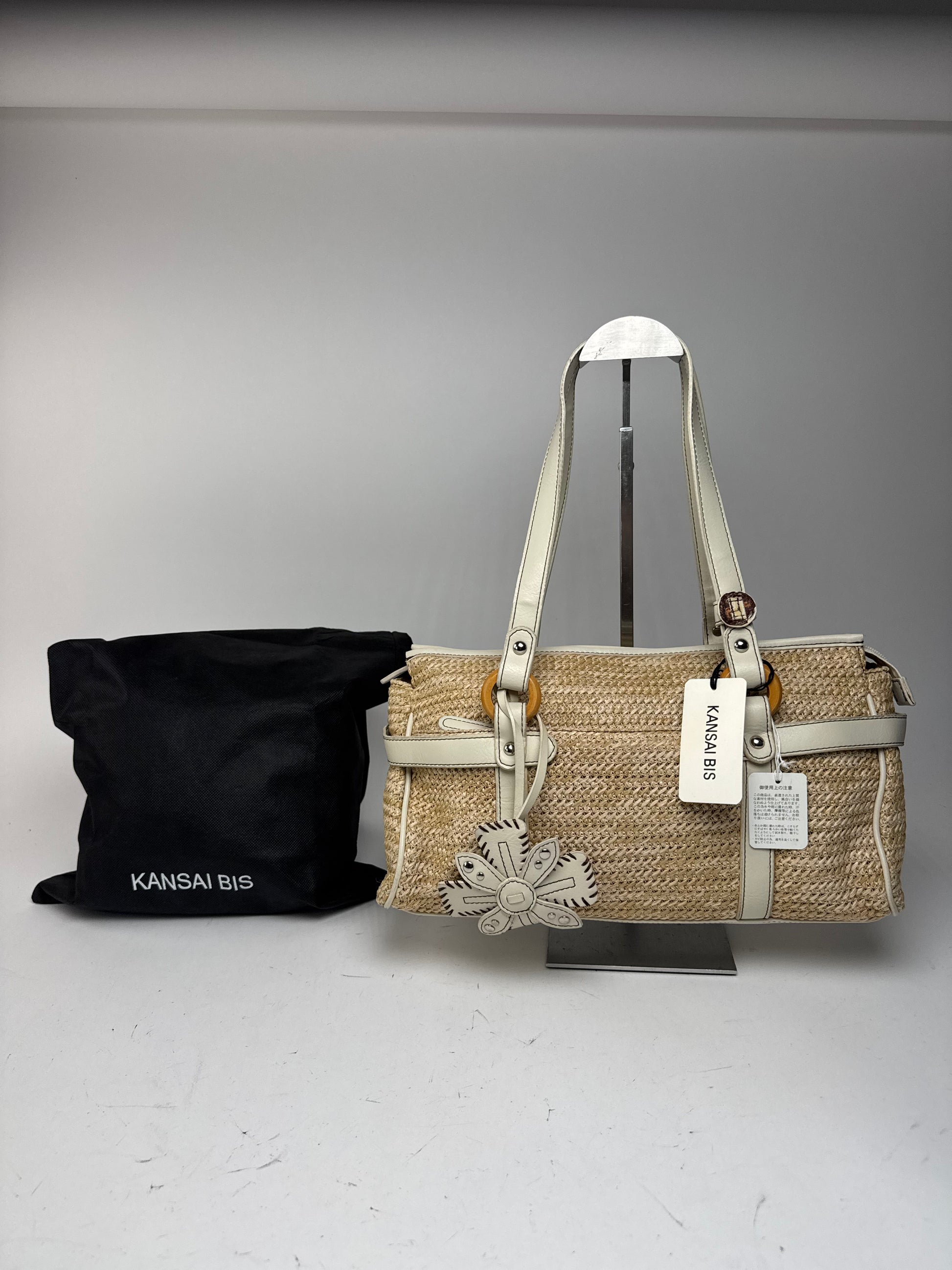 Sac bandoulière KANSAI YAMAMOTO en paille et cuir. Ce sac vintage est confectionné en paille beige et rehaussé de détails contrastants en cuir blanc. Une applique florale en cuir blanc ornée de clous argentés orne le devant. Il est doté d'une fermeture zippée sur le dessus, de ferrures en acier argenté et de détails en plastique marron. L'intérieur est doublé de polyester doré imprimé des logos Kansai Yamamoto. Ce modèle est neuf, avec étiquette et housse de protection.