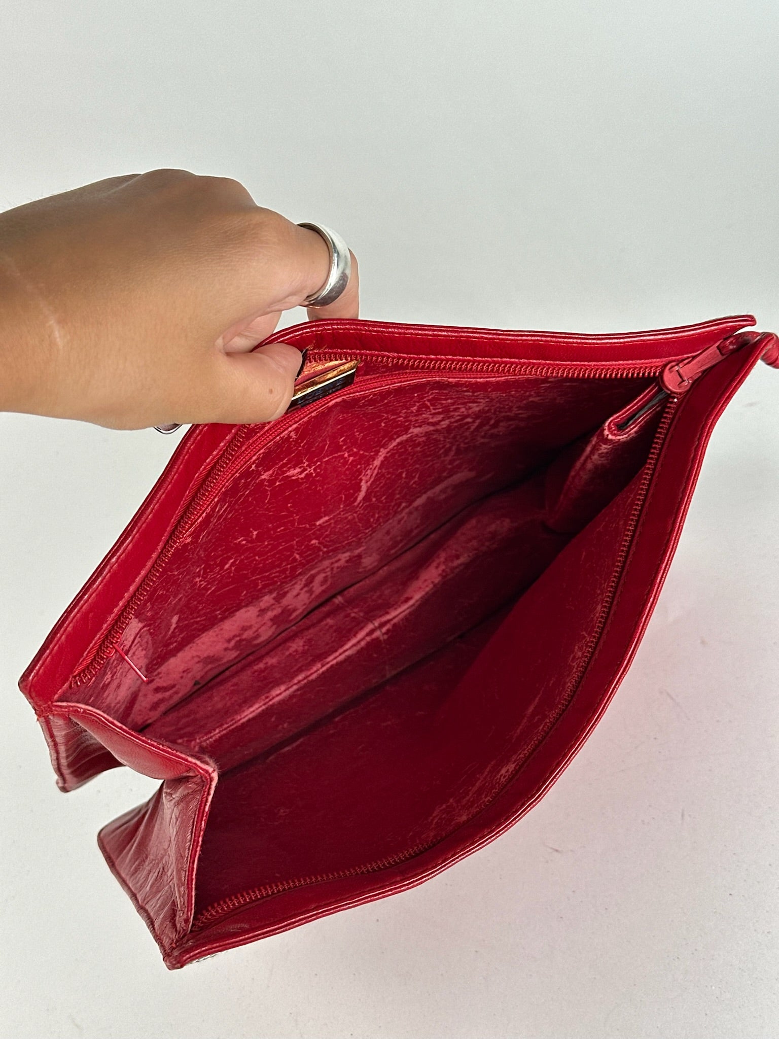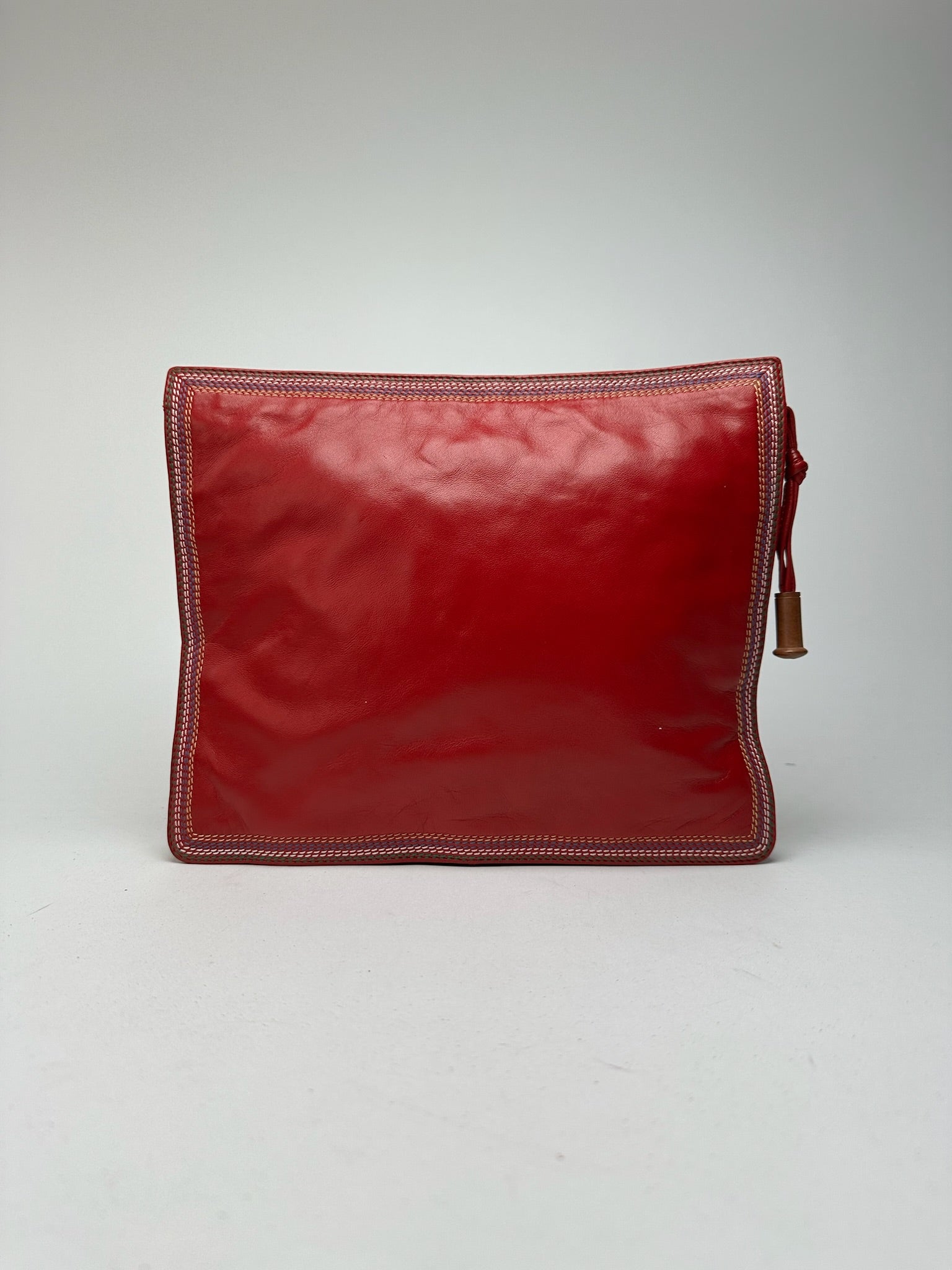 Cette pochette vintage est finement confectionnée en cuir rouge souple et dotée d'une fermeture zippée sur le dessus. L'emblématique logo Anagramme Loewe est subtilement gravé en bas à droite sur le devant. Lancée en 1970, l'Anagramme, créée par l'artiste espagnol Vicente Vela, est devenue un symbole de l'héritage artisanal et de la modernité raffinée de Loewe.
