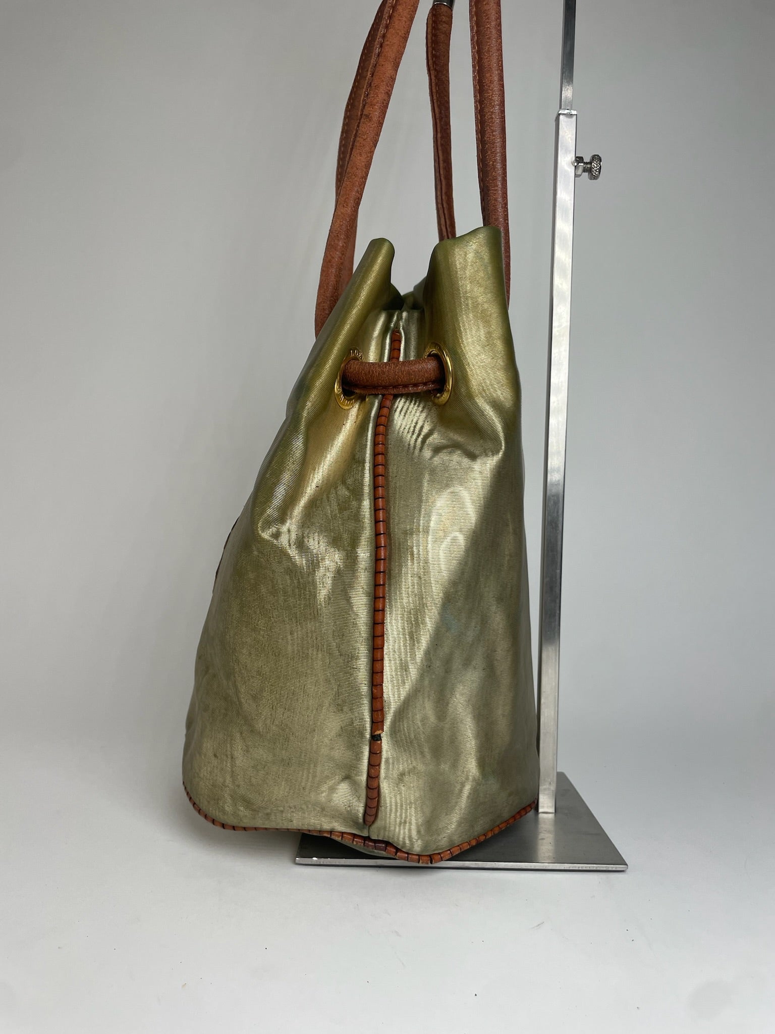 LOEWE MADRID Vintage Bucket Bag. This iconic bucket bag is crafted of green-beige leather and features the signature Loewe Anagram logo in brown gradient canvas on the front. Founded in 1846 in Madrid, Loewe is one of Spain’s most prestigious luxury houses, celebrated for its exceptional leather craftsmanship and timeless designs. The bag features brown leather shoulder straps and can be worn comfortably over the shoulder. The top opens to a beige canvas interior with Loewe Anagram monogram lining and includes a small zip clutch for storing essentials.
