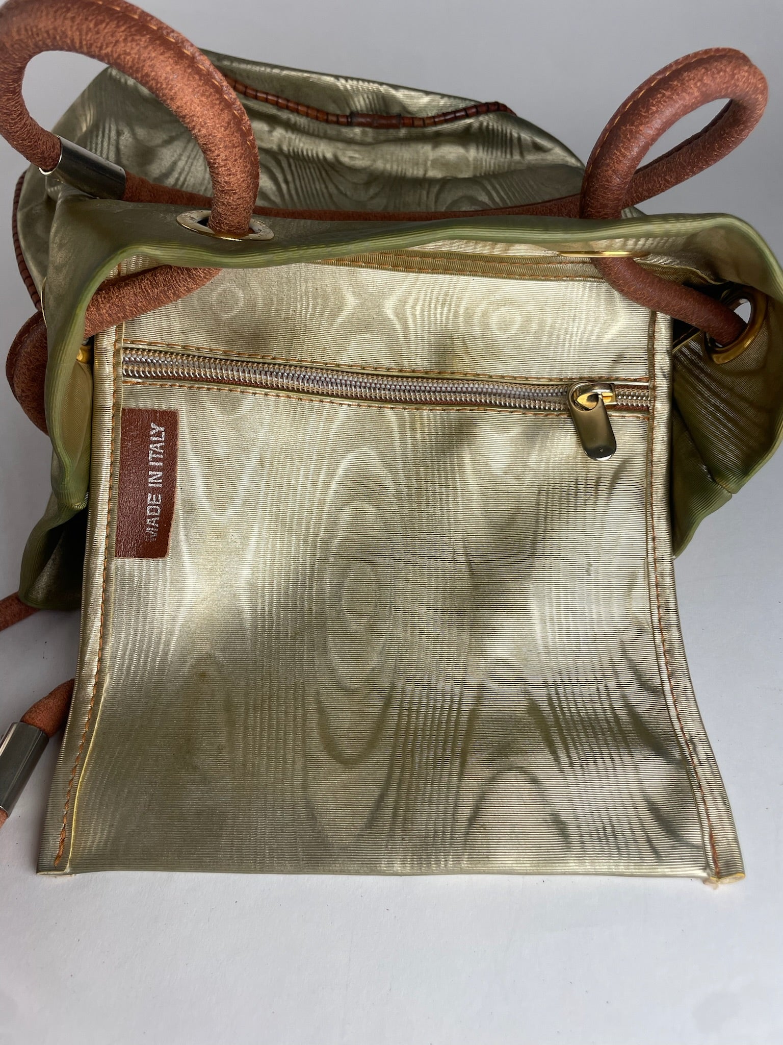 Condition Details: The exterior leather shows strong discoloration throughout. The brown leather handles show peeling and visible signs of wear.