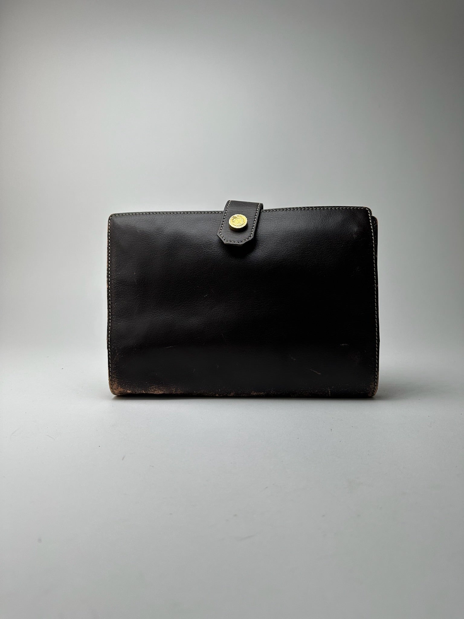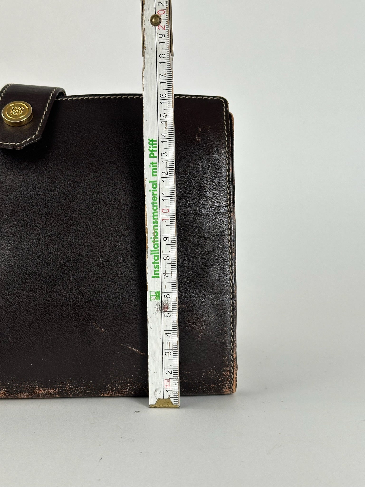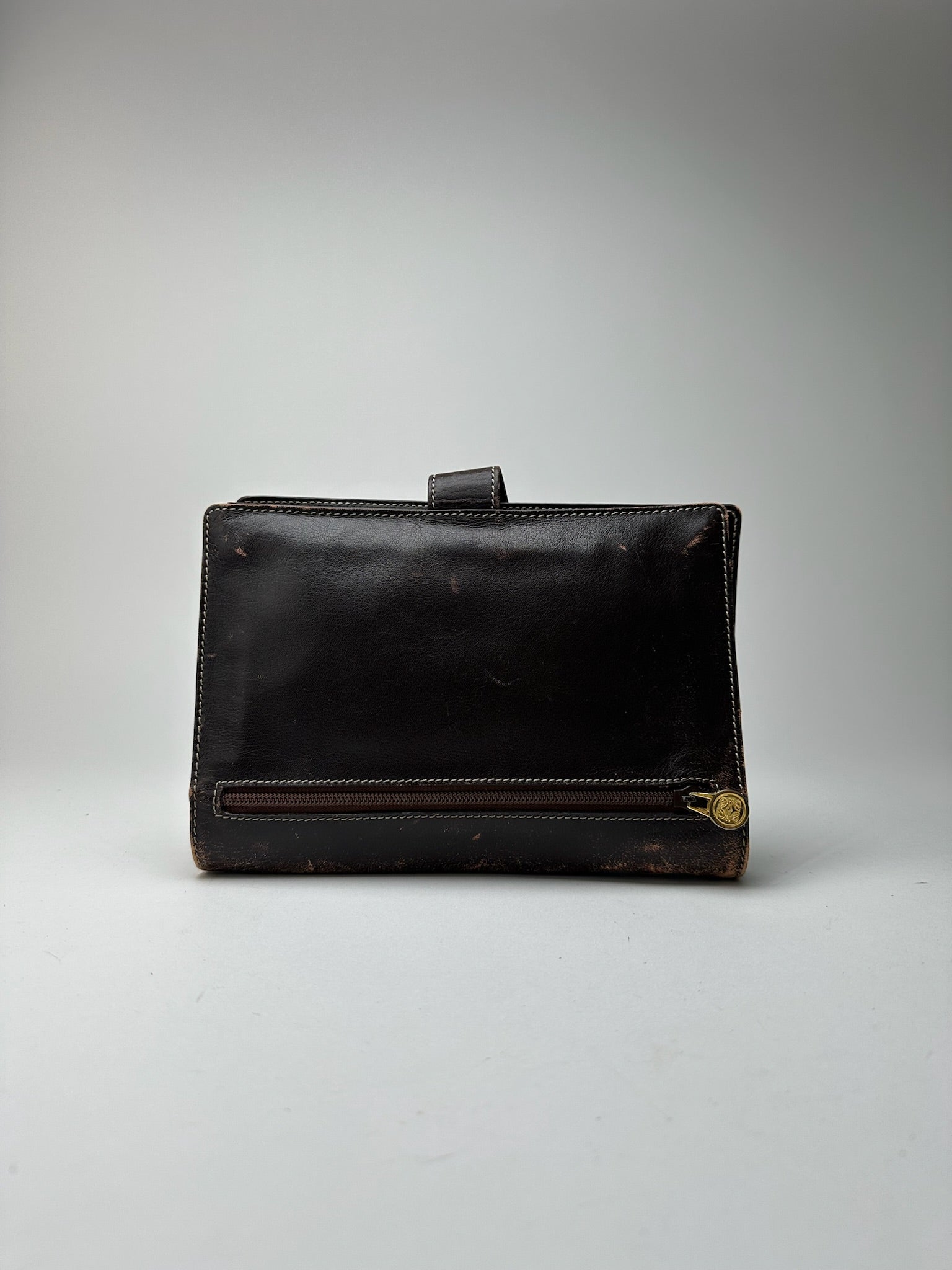 Pochette LOEWE en cuir vintage. Cette pochette chic est finement confectionnée en cuir marron foncé. Elle est dotée d'un rabat avec un fermoir pression en acier doré gravé de l'emblématique logo Anagramme LOEWE. Elle offre un intérieur généreux et s'ouvre sur un intérieur en cuir marron.