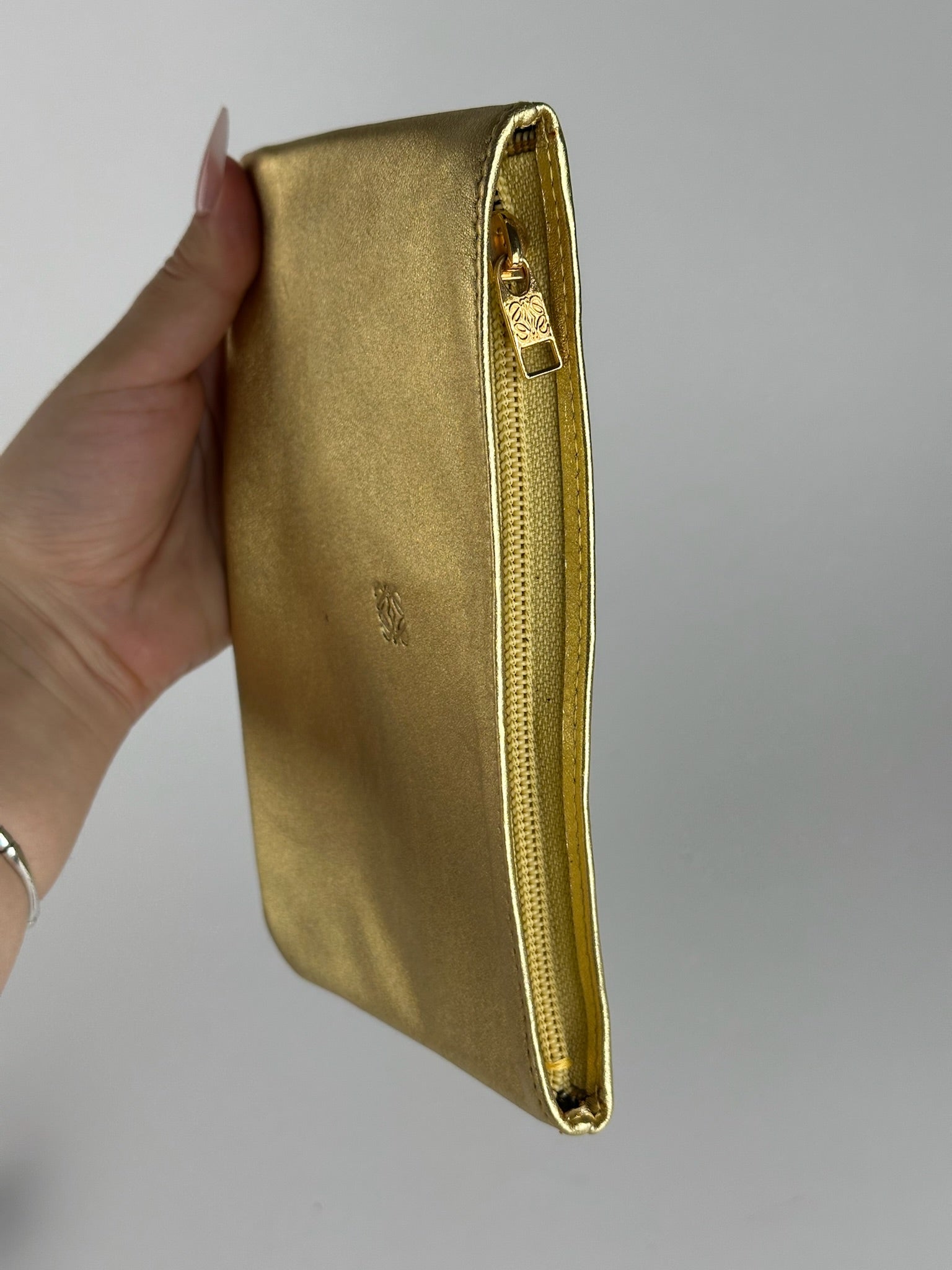 Pochette Anagramme Vintage LOEWE MADRID en Cuir. Cette pochette chic est finement confectionnée en cuir doré et arbore le logo Anagramme LOEWE embossé sur le devant. Lancé en 1970 et créé par l'artiste espagnol Vicente Vela, l'Anagramme est devenu un emblème emblématique de la marque, symbolisant son héritage artisanal et son identité moderne. Elle est dotée d'une fermeture zippée sur le dessus et est fournie avec le livret d'entretien d'origine et une carte LOEWE.