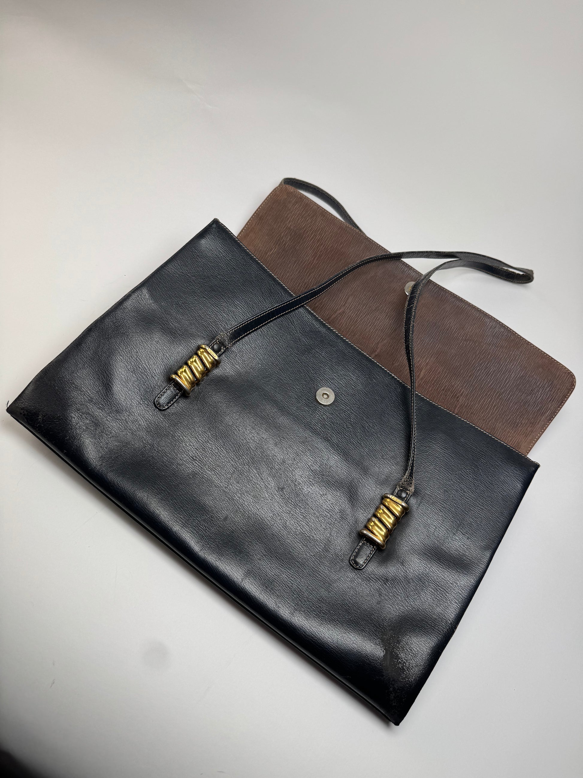 Condition Details: The bag is in overall good vintage condition with visible signs of wear. The leather shows some material damage, including worn corners and signs of use around the hardware screws.