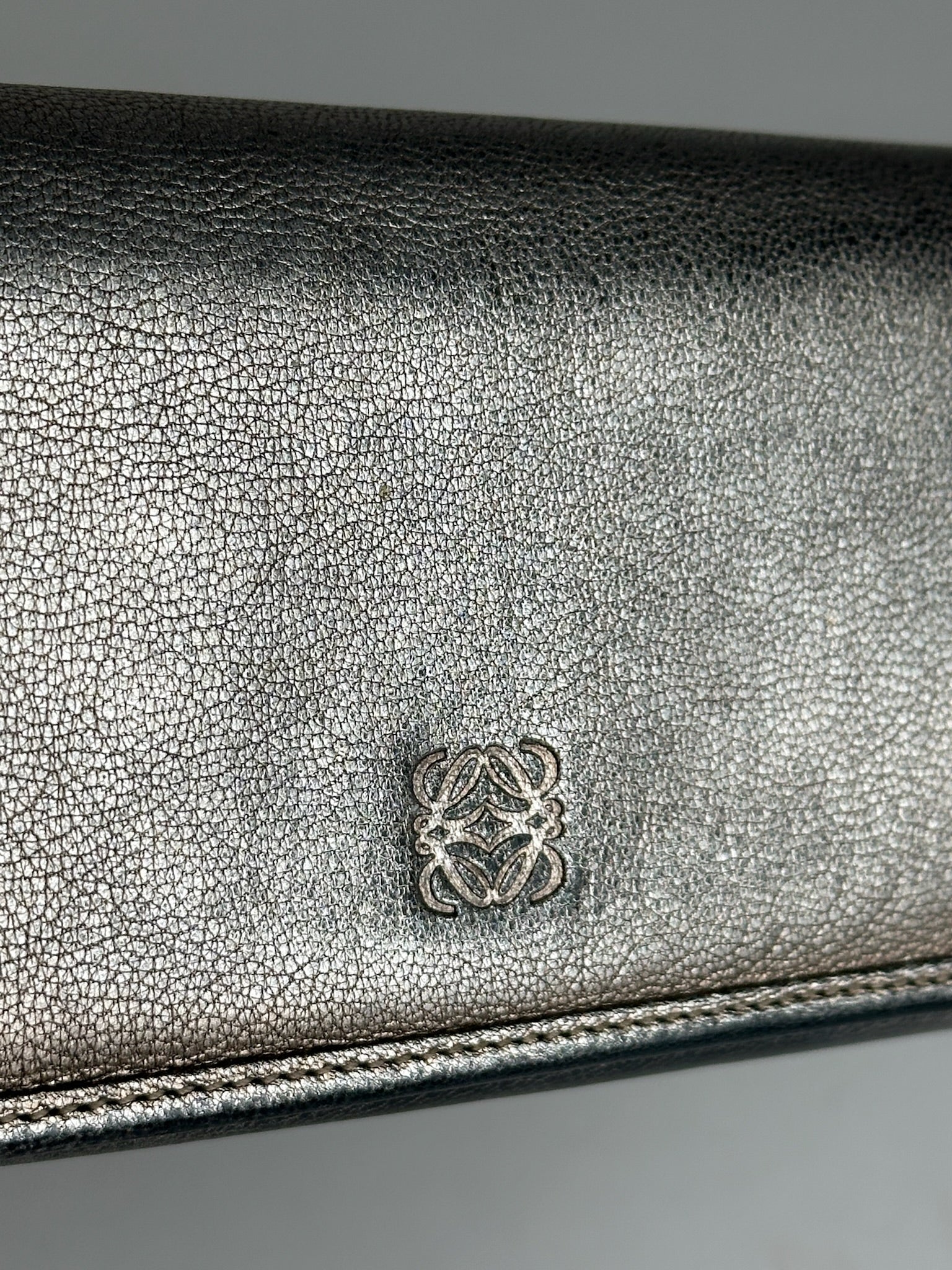 Portefeuille vintage LOEWE MADRID en cuir argenté. Cet élégant portefeuille est finement confectionné en cuir argenté souple et arbore le logo Loewe estampé sur le devant. Le rabat avant s'ouvre par un bouton-pression et une poche zippée se trouve à l'arrière. L'intérieur est doublé de cuir noir.