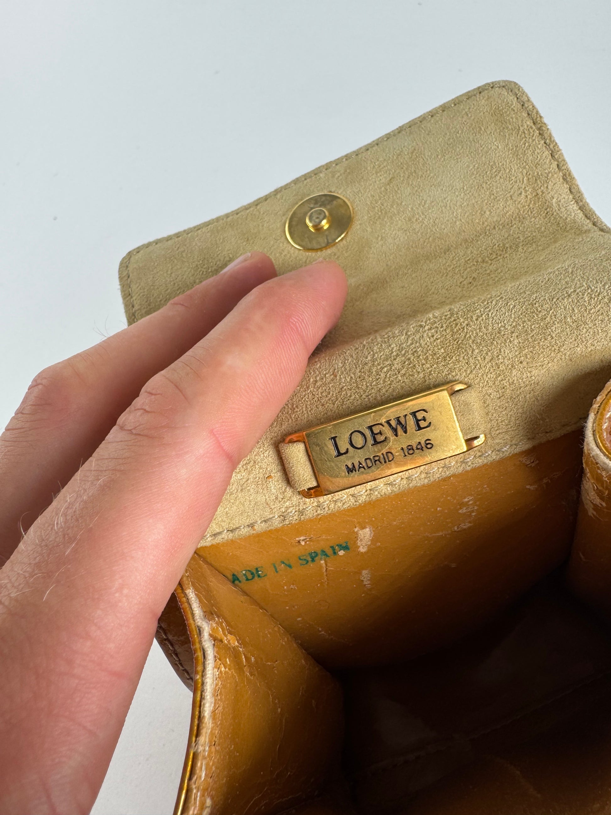 Sac bandoulière vintage LOEWE MADRID en cuir verni. Ce sac bandoulière vintage est finement confectionné en cuir verni doré et doté d'une finition en acier doré avec fermoir aimanté. L'intérieur est doublé de daim beige et de cuir verni assorti. Ce sac est unisexe.