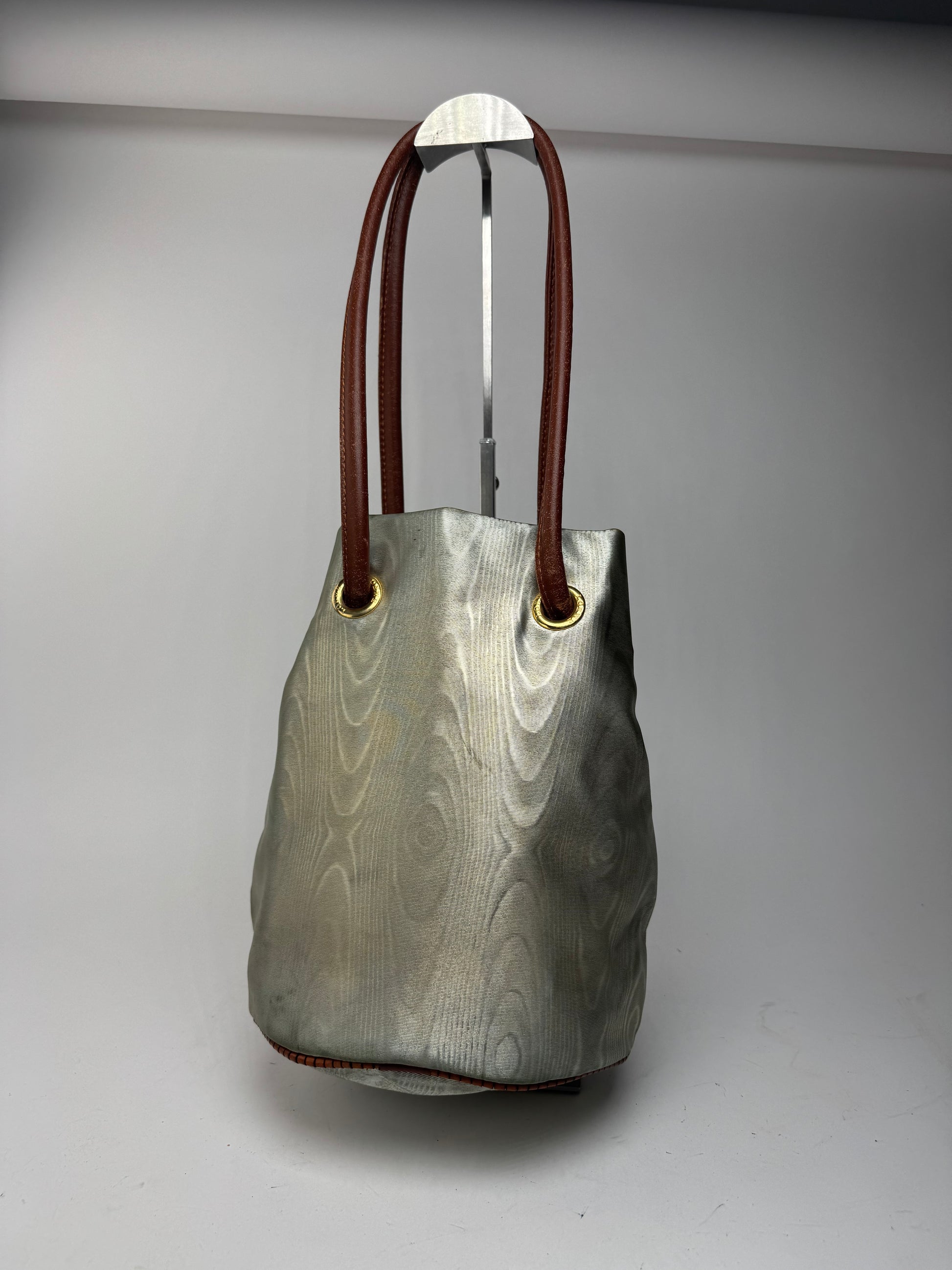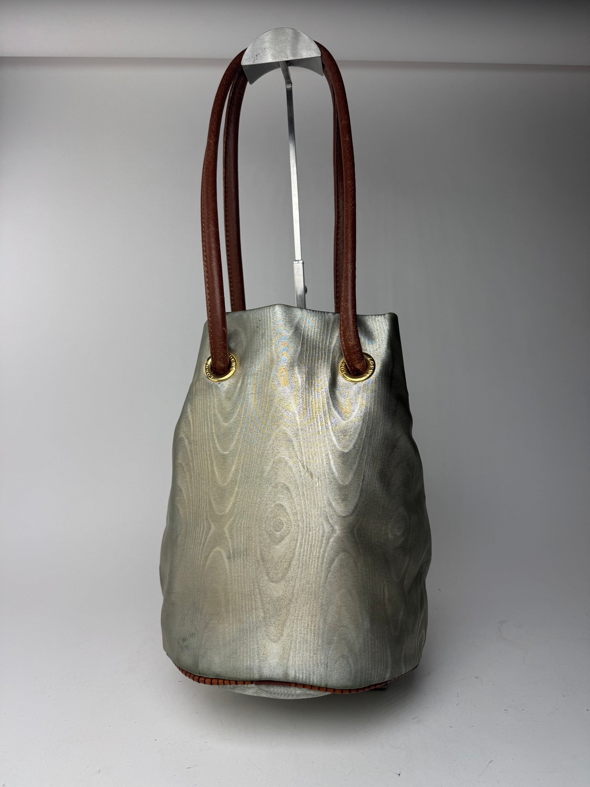 Sac à main vintage LOEWE Madrid. Ce sac vintage est finement confectionné en cuir nacré et arbore le logo Anagramme Loewe marron sur le devant. Il est doté de poignées élastiques mi-longues en cuir marron, de finitions en acier doré et d'une fermeture zippée sur le dessus. L'intérieur est doublé en toile beige ornée du monogramme Anagramme Loewe et comprend une poche zippée.