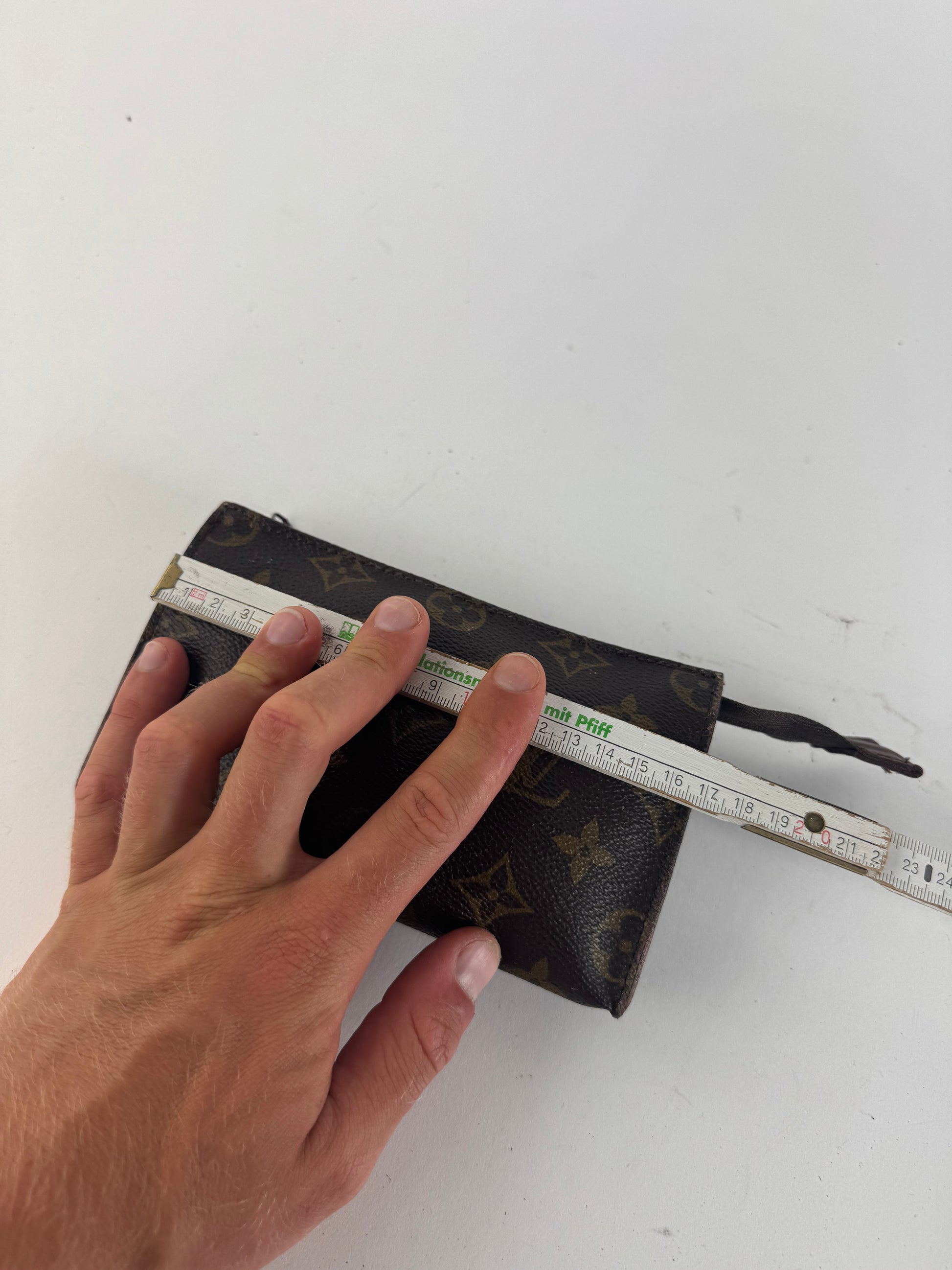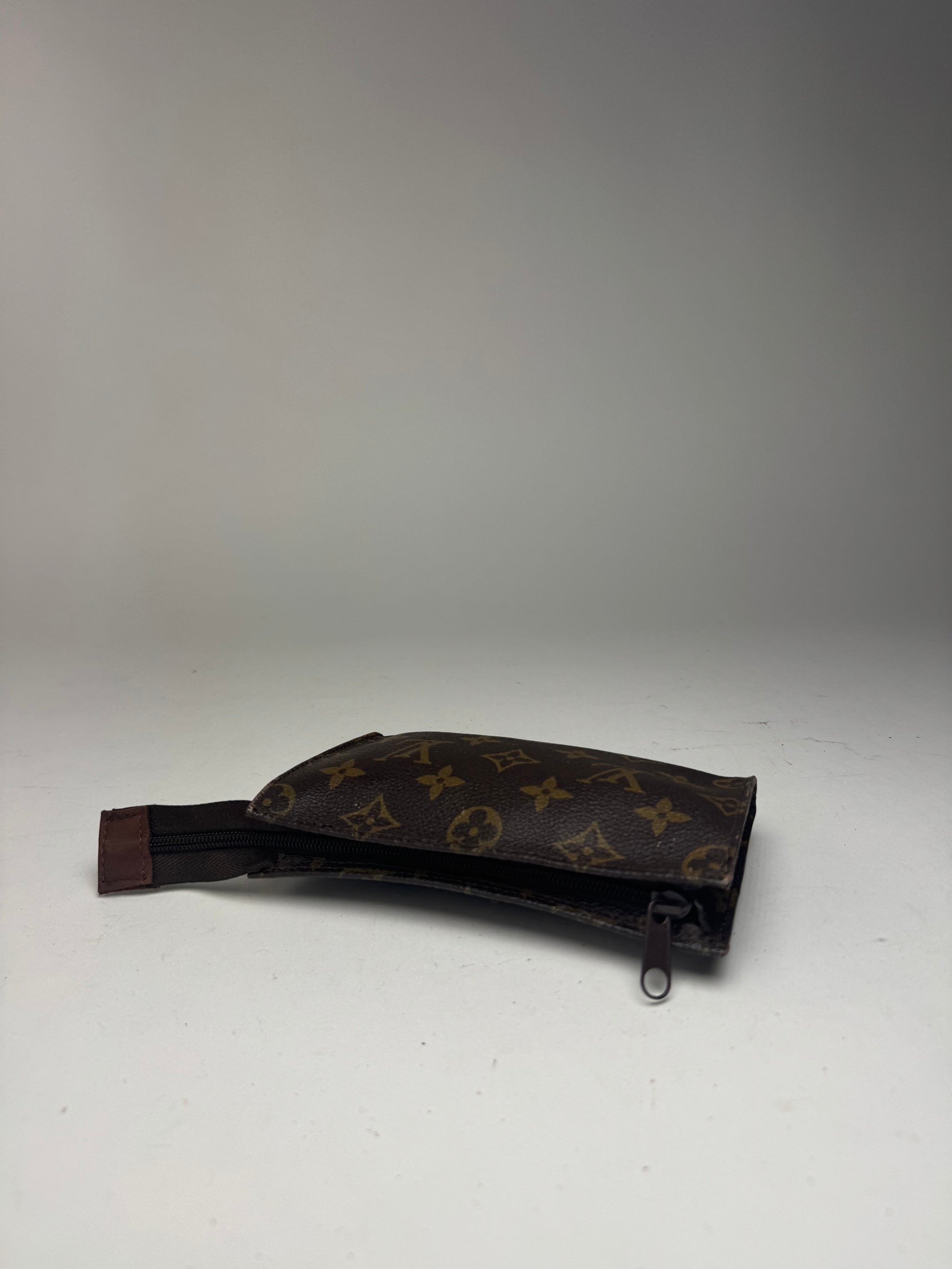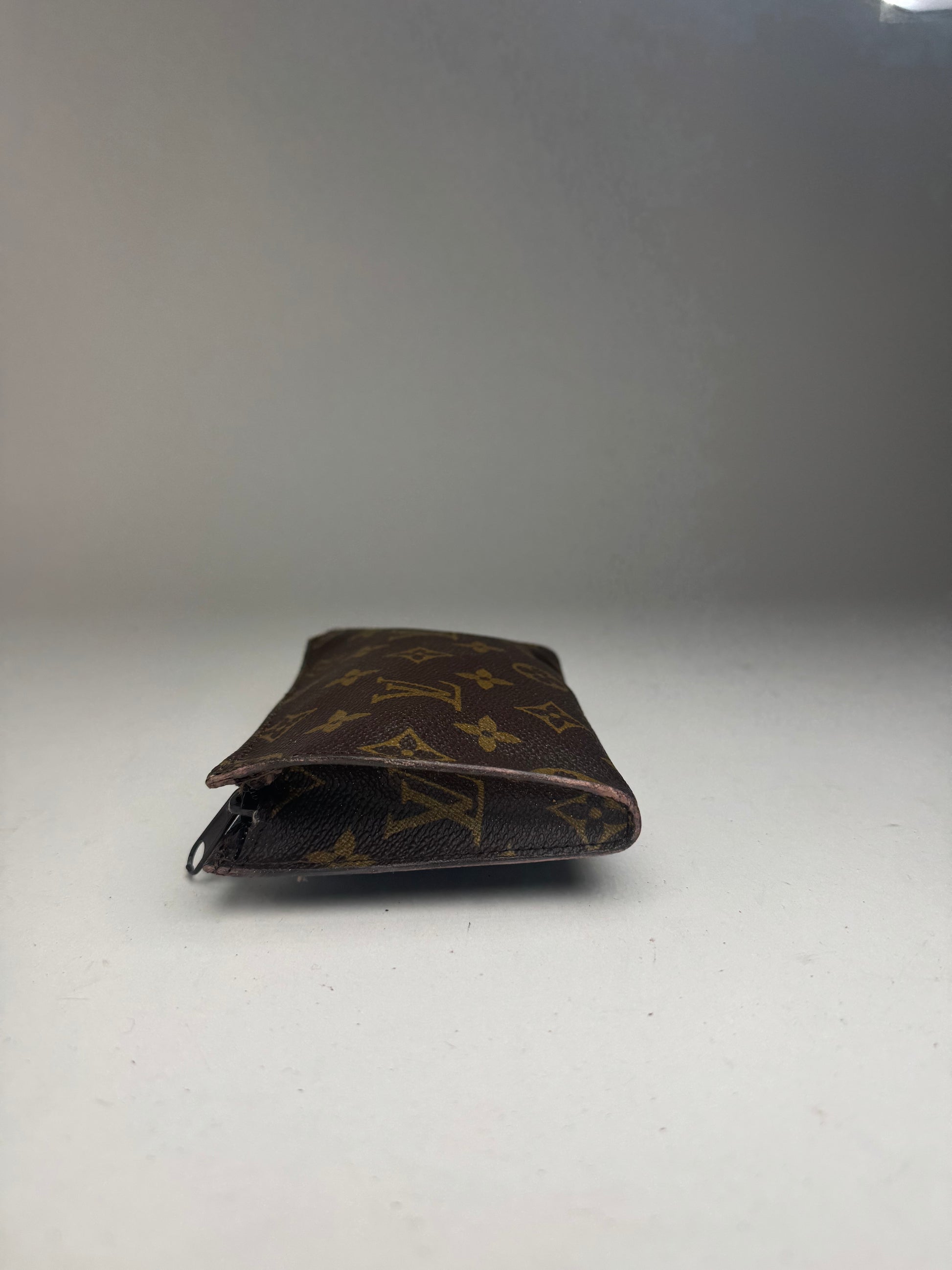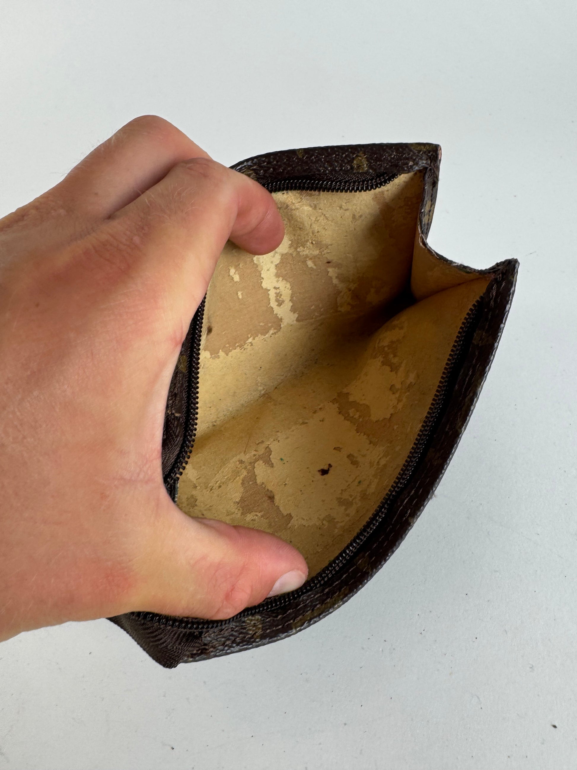 Pochette monogramme vintage LOUIS VUITTON. Cette pochette compacte est confectionnée en cuir marron foncé et toile monogramme Louis Vuitton kaki. Elle est dotée d'une fermeture zippée sur le dessus, qui a été remplacée. L'intérieur est recouvert d'un revêtement beige.