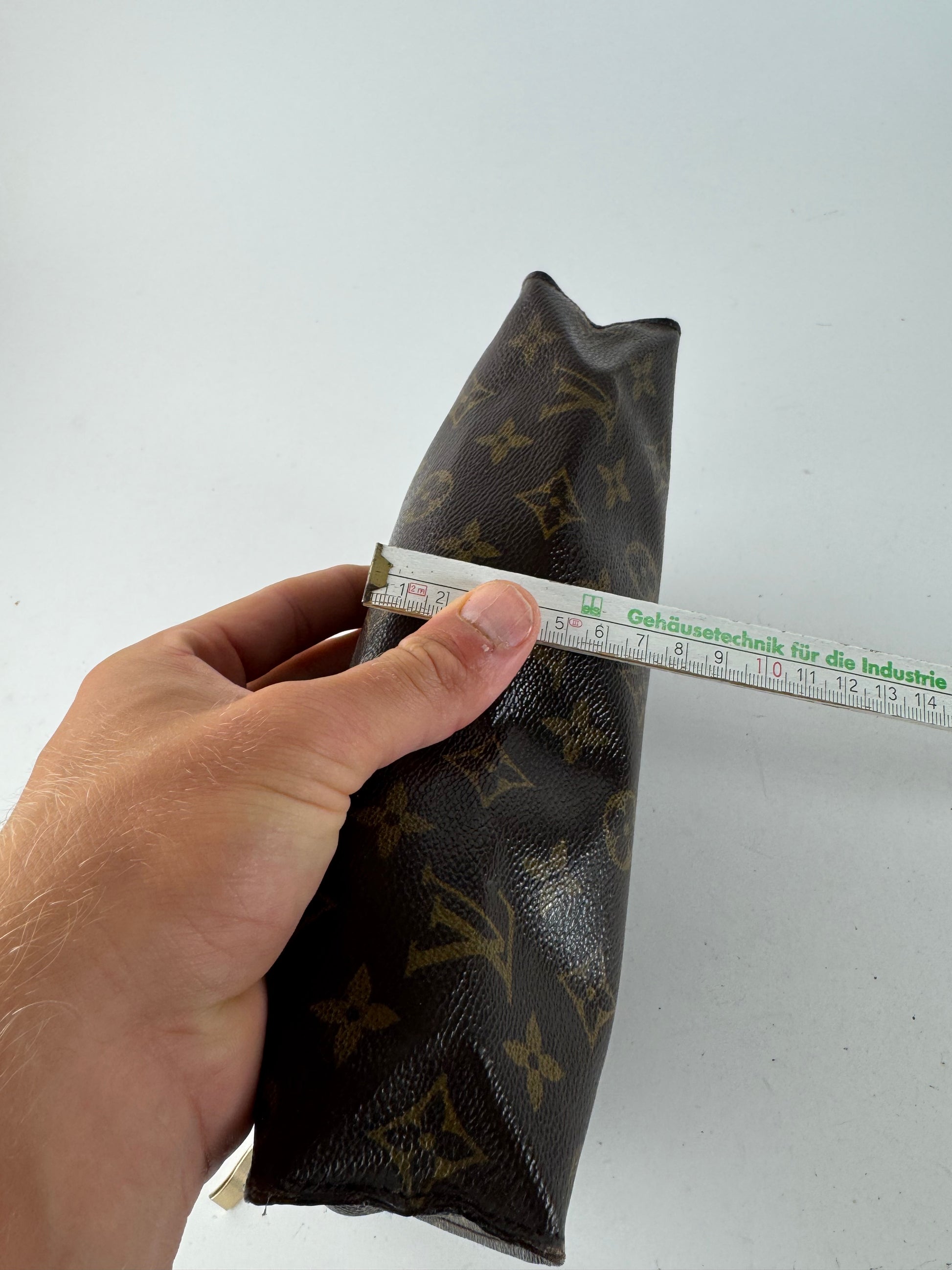 Pochette vintage Louis Vuitton Monogram. Cette pochette vintage est confectionnée avec soin en toile Monogram classique Louis Vuitton aux tons marron et kaki, avec des finitions en cuir. Sa fermeture zippée, sur le dessus ou à l'avant, a été remplacée.