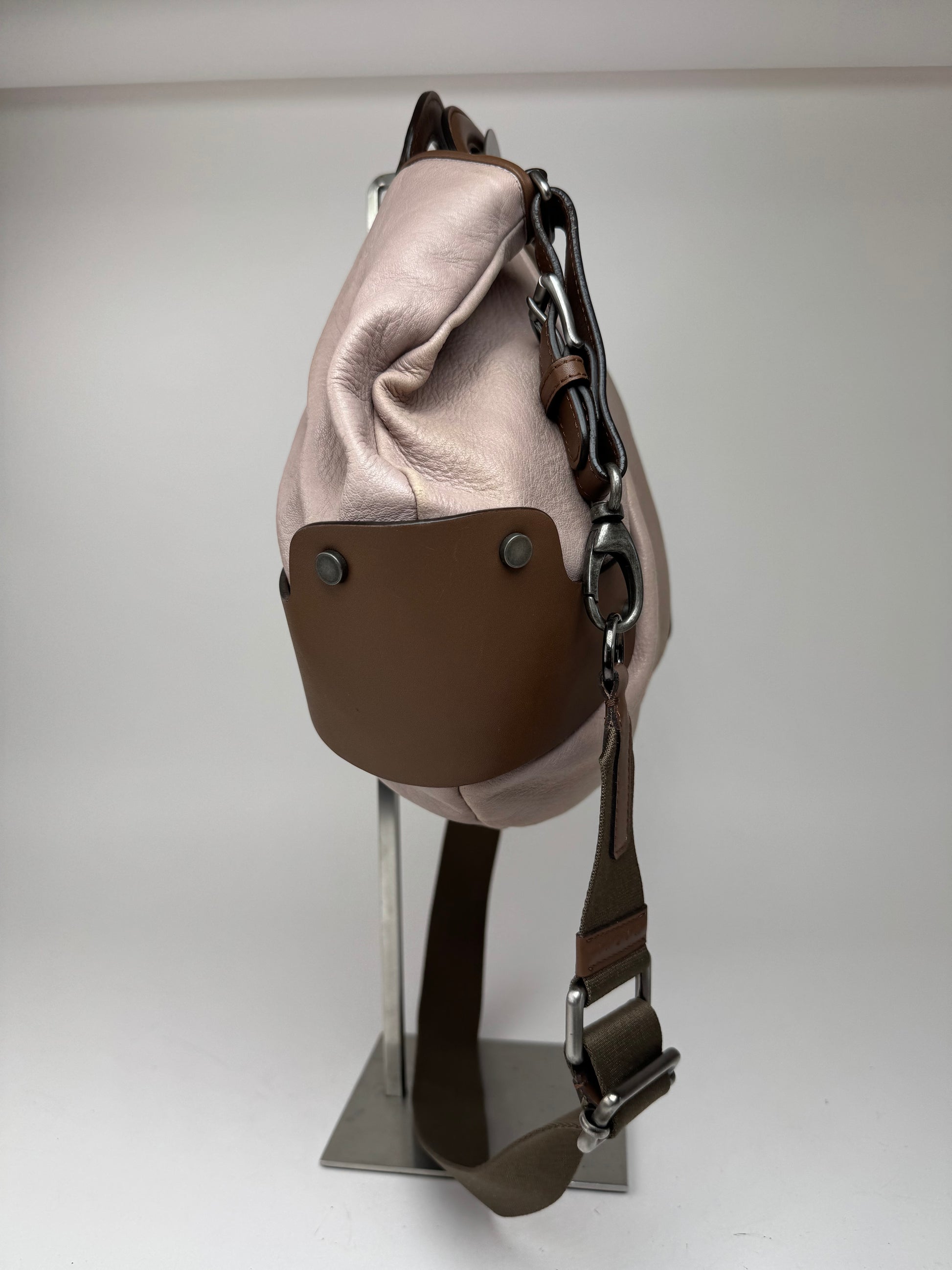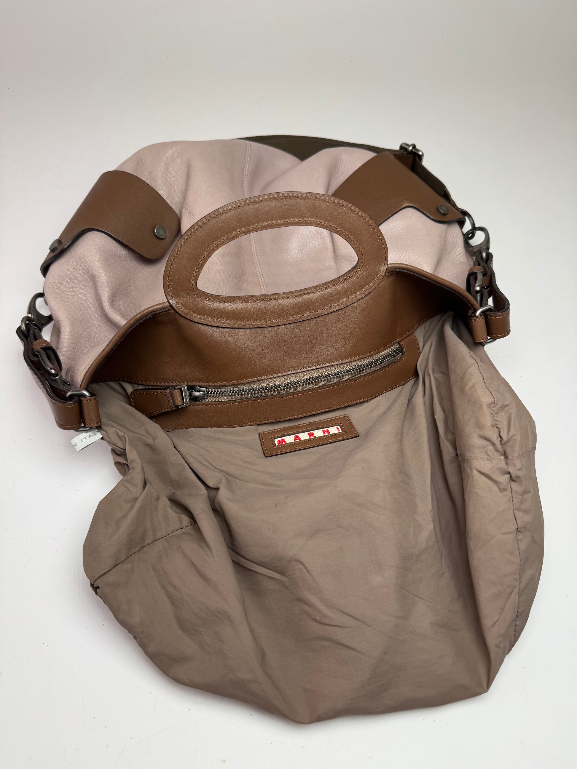 Sac à main vintage MARNI à double usage. Cet élégant sac à main à double usage est confectionné en cuir lilas et marron avec des finitions en acier argenté. Il est doté de poignées ovales ou demi-circulaires et d'une bandoulière amovible et réglable pour un porté polyvalent. L'intérieur est doublé en toile marron. Fabriqué en Italie.