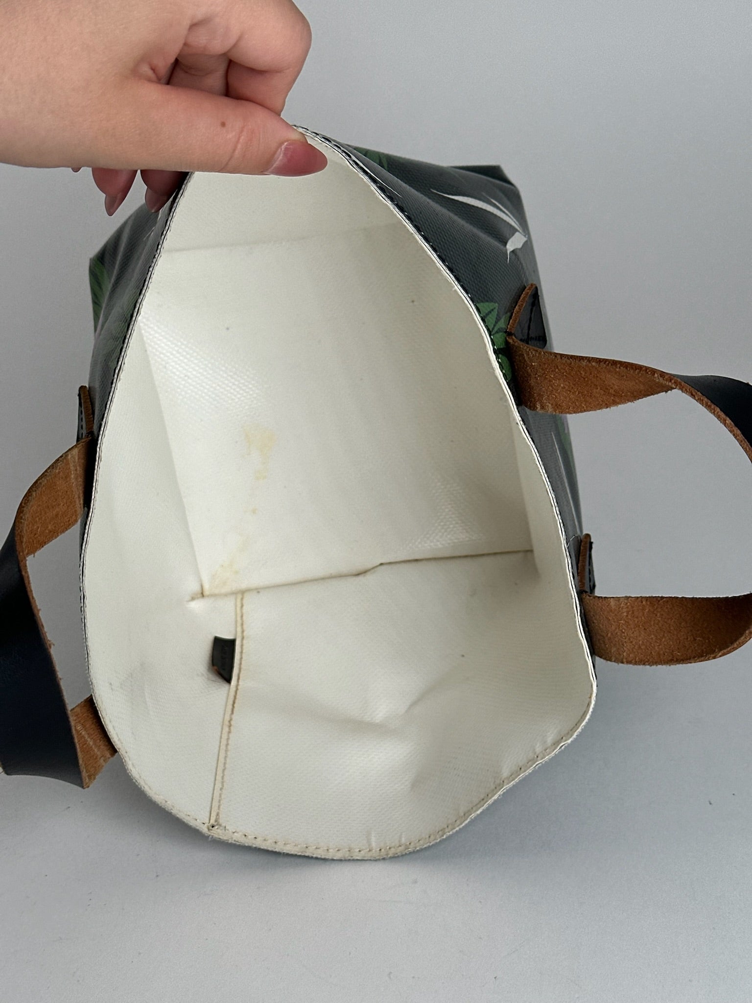 Sac à main MARNI vintage fleuri. Ce sac chic est finement confectionné en cuir vegan noir avec des motifs floraux blancs, verts et violets. Il est doté de deux anses courtes. Son dessus s'ouvre sur un intérieur en cuir vegan blanc.